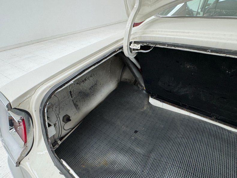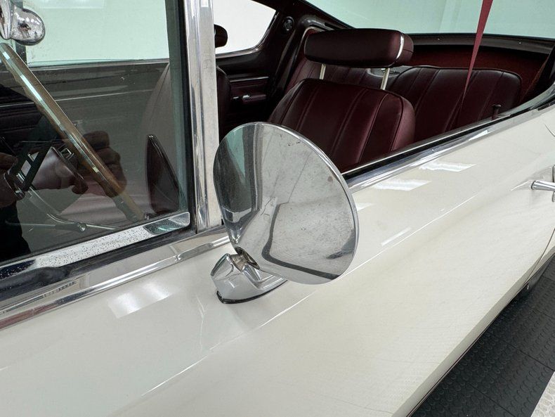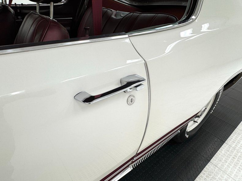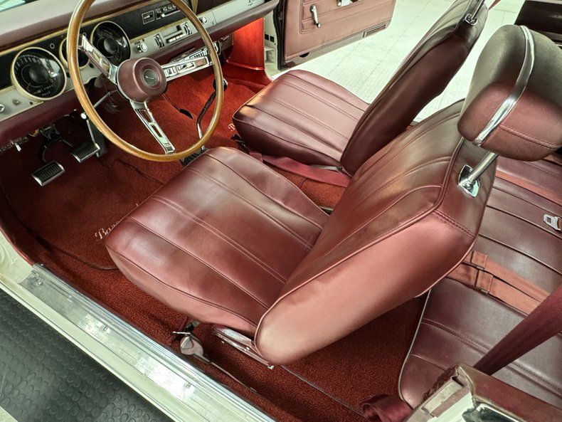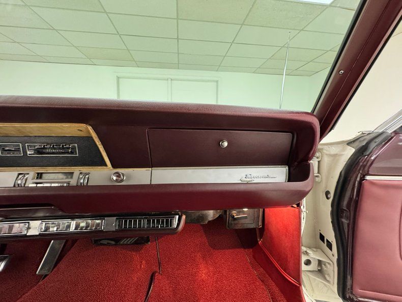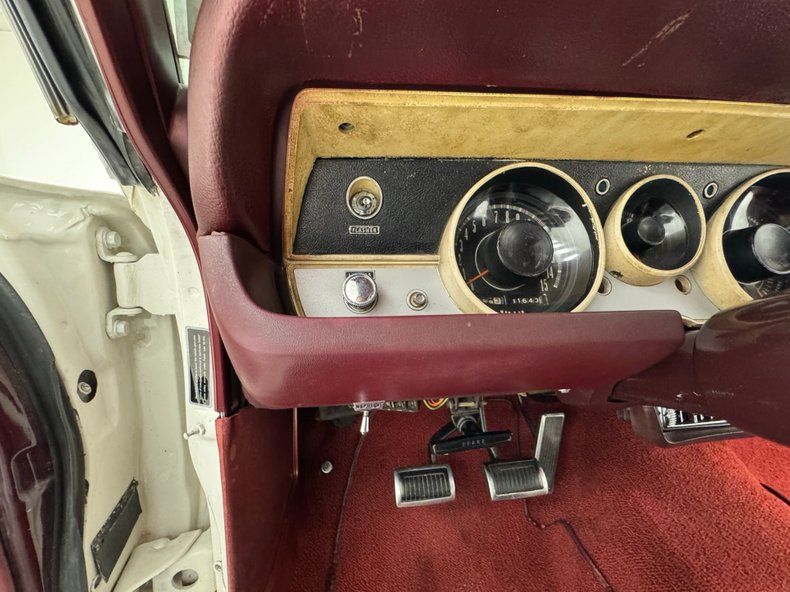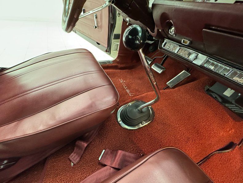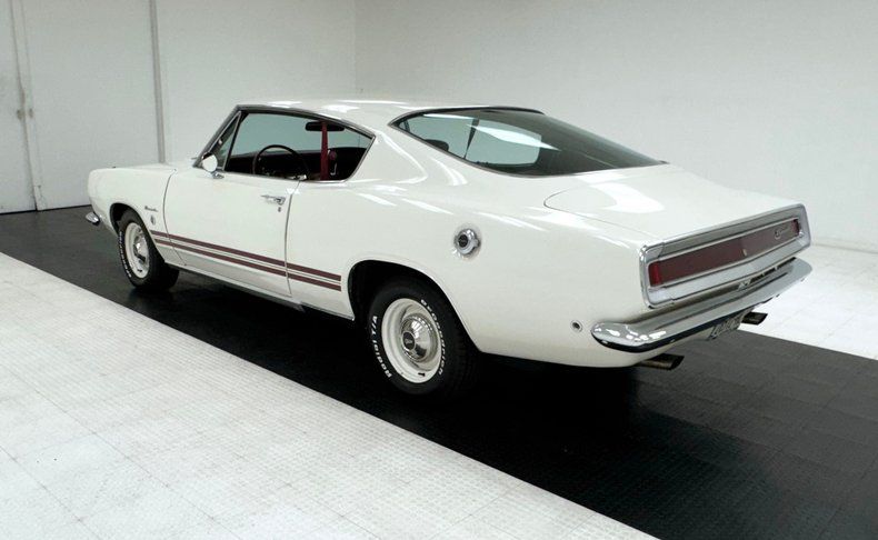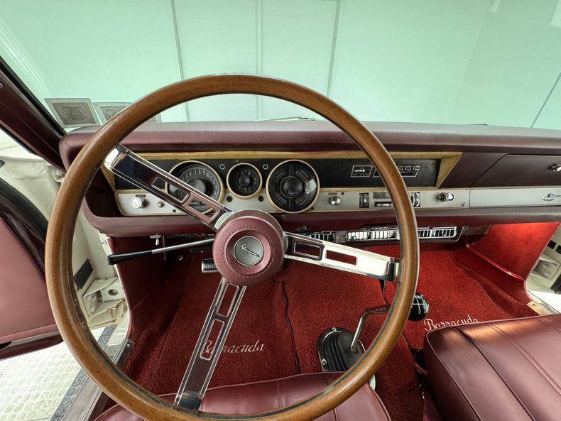 Interior Simple red door cards include a vinyl panel under the dark red metal header and bottom section, contrasting the outer white. Inside, the red vinyl bucket seats look like they left the Hamtramck, Michigan plant yesterday, tall and wearing headrests and the back bench matches the condition. A wood rimmed three spoke steering wheel offers itself to the driver leading to an instrument cluster that shows some age with slight discoloration but benefits from a central tachometer flanked by the 150 mph speedometer and condition gauges. The center dash area contains the A/C panel and AM radio. On the open floor and stunning red loop carpet, you'll find a tall Hurst shifter rising from the transmission tunnel. Barracuda embroidered red carpet mats add a nice touch and help protect the base carpet while the red headliner is high and tight. The trunk floor is clean and protected by a vinyl plaid mat.