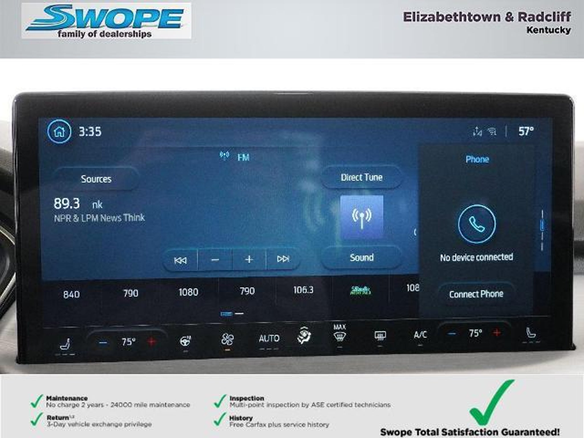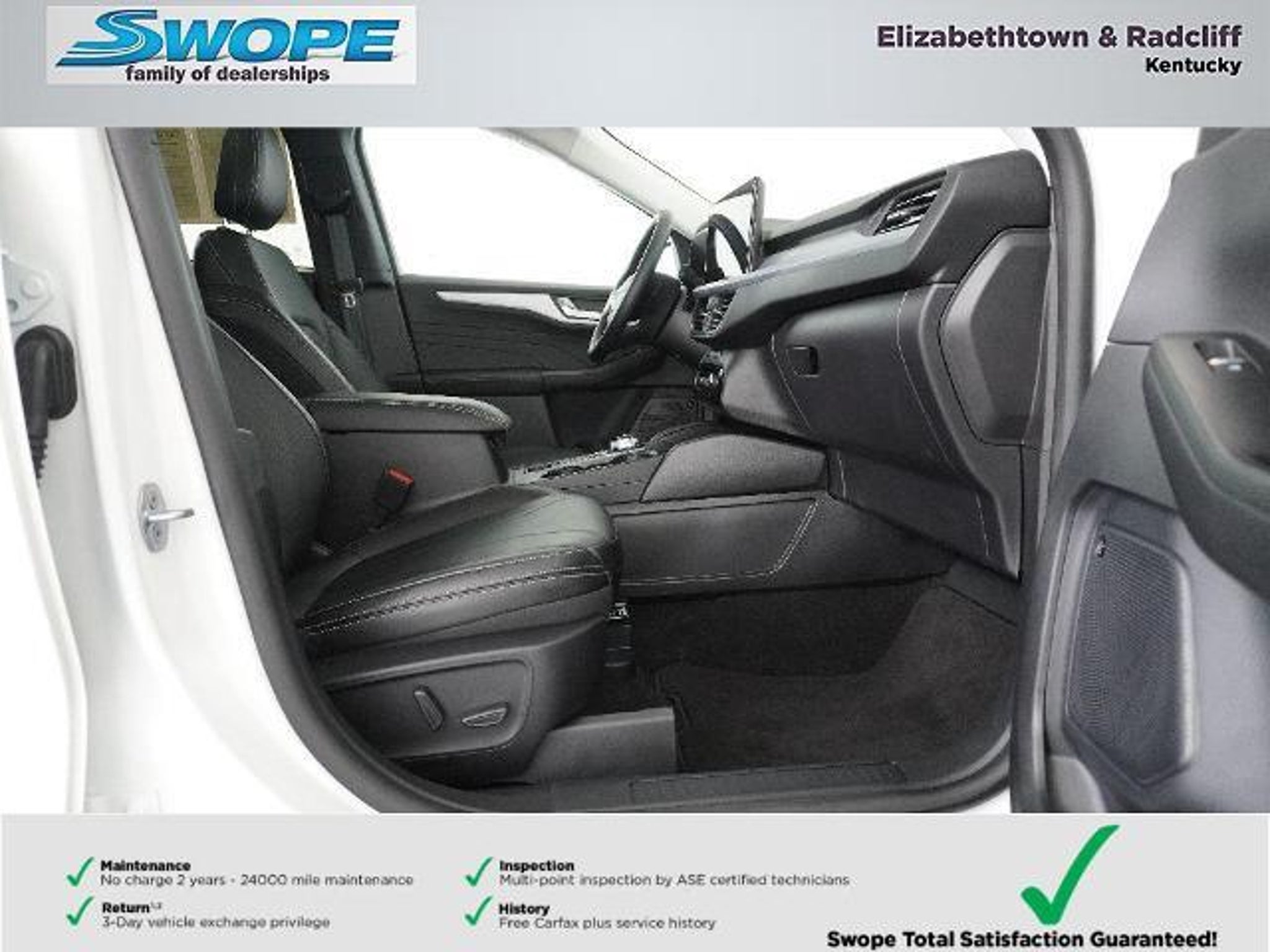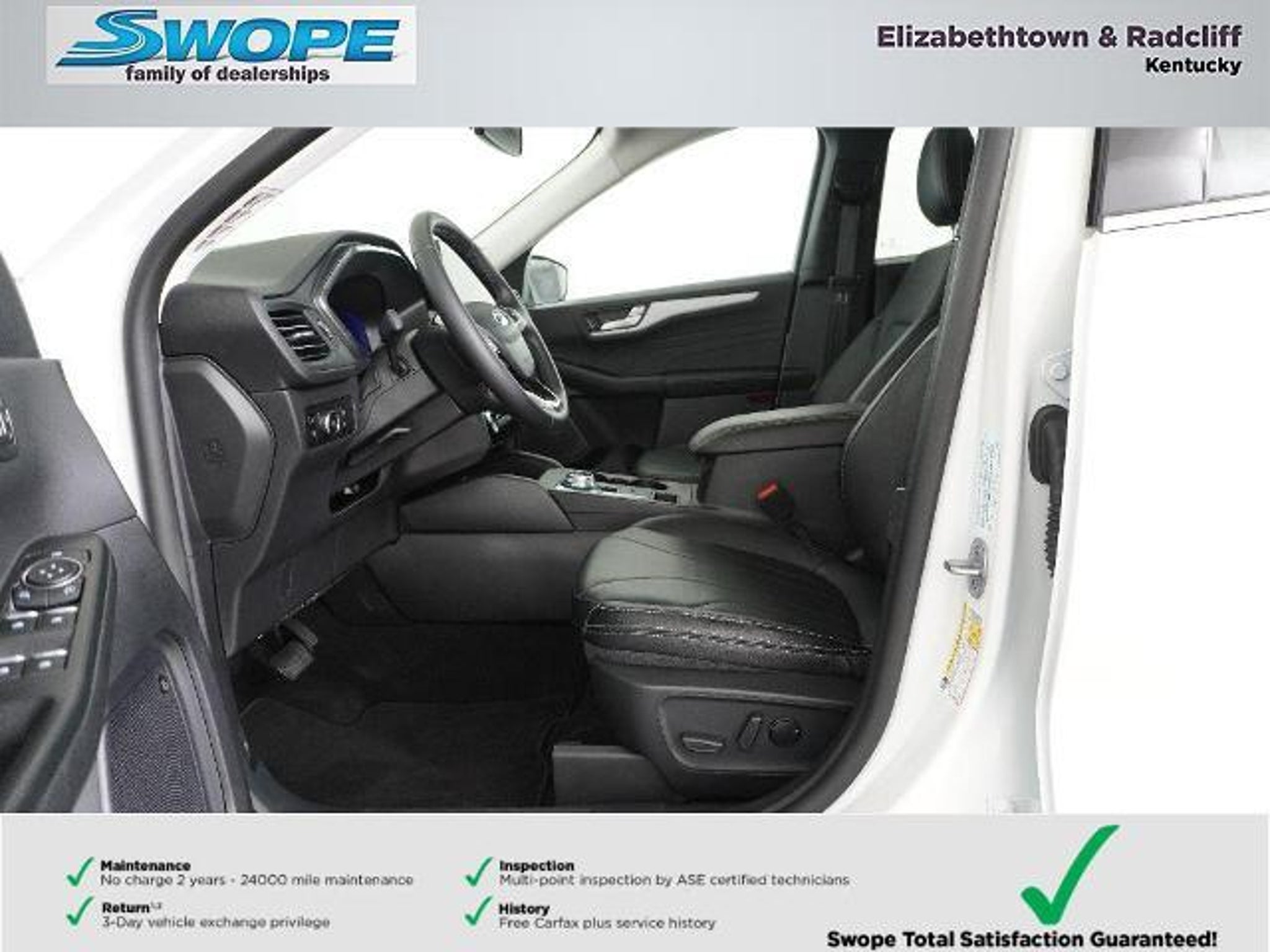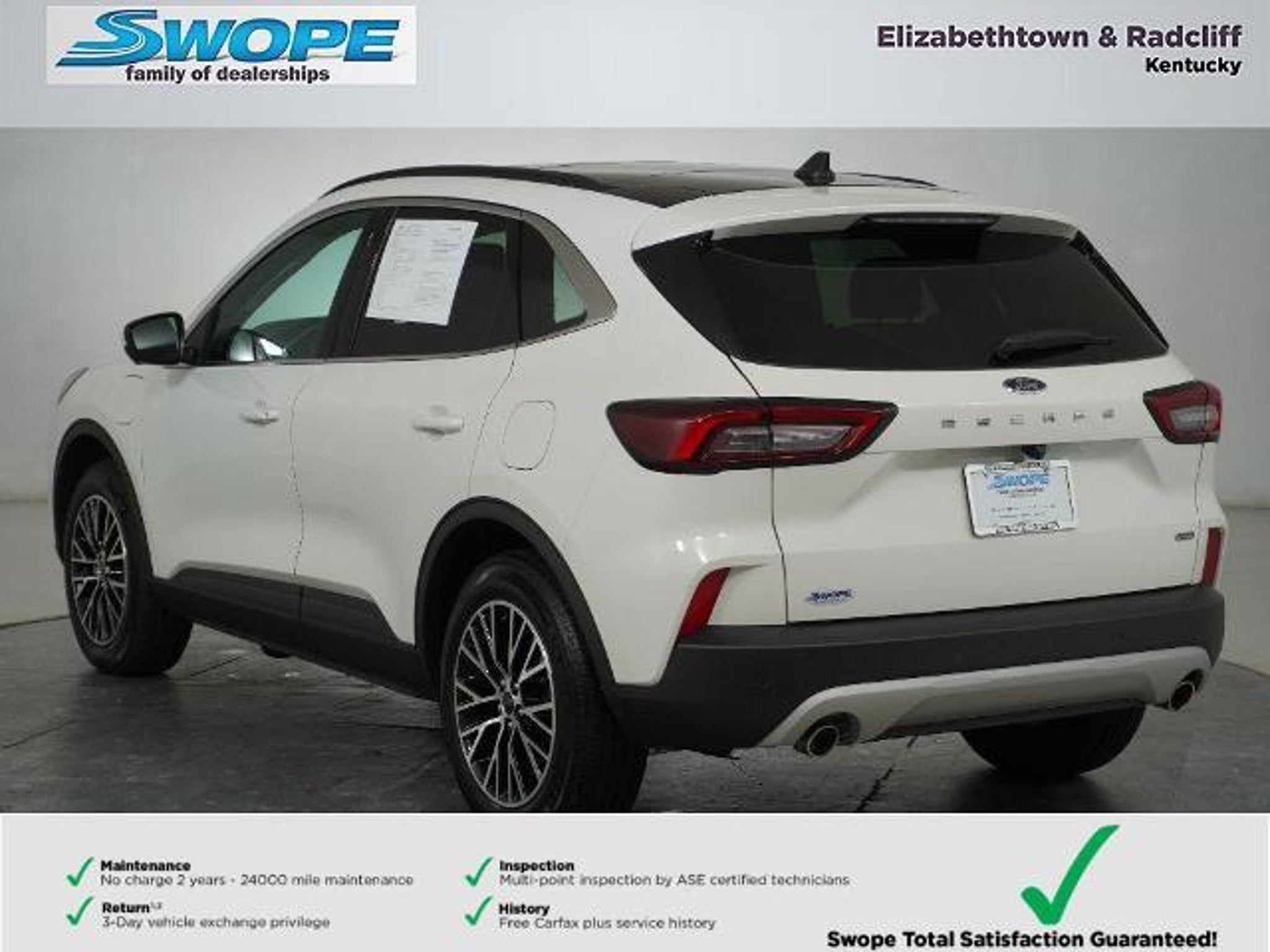 *Summary* Welcome to Bob Swope Fords exclusive listing of pre-owned vehicles. Call to speak to one of our certified Product Specialist to discover all this vehicle has to offer and see why we are a different dealership. Check out all our vehicles online at bobswopeford.com. *Vehicle Details* This Escape plug-in hybrid came from our new vehicle inventory and was used for a short time as a Ford Courtesy transportation vehicle. It comes with all the new vehicle benefits and any eligible factory incentives. This Escape comes with the balance of the new car warranty. See window sticker for full details. *Equipment* The leather seats in this Ford Escape are a must for buyers looking for comfort durability and style. This model has a clean CARFAX vehicle history report. Youll never again be lost in a crowded city or a country region with the navigation system on this model. The state of the art park assist system will guide you easily into any spot. Protect the Ford Escape from unwanted accidents with a cutting edge backup camera system. This mid-size suv features a hands-free Bluetooth phone system. This vehicle has auto-adjust speed for safe following. This unit is pure luxury with a heated steering wheel. This vehicle is equipped with the latest generation of XM/Sirius Radio. Maintaining a stable interior temperature in this vehicle is easy with the climate control system. This vehicle shines with clean polished lines coated with an elegant white finish. Front wheel drive on this 2025 Ford Escape gives you better traction and better fuel economy. *Packages* PHEV PREMIUM PACKAGE: 6-Way Power Passenger Seat; 360-Degree Camera with Split View; Heated ActiveX-Trimmed Front Sport Contour Seats; Coast to Coast LED Lightbar Headlamps; Auto-Dimming Rearview Mirror; Perimeter Alarm; Reverse Brake Assist; B&O Sound System by Bang and Olufsen; Wireless Charging Pad; 12.3 Productivity Screen in Instrument Cluster; Memory Package; Head-Up Display; 10-Way Power Driver Seat; Front Parking Sensors; HD Radio; Universal Garage Door Opener (UGDO). Equipment Group 700A: 18 Machined-Face Magnetic Aluminum Wheels; .2.5L I-VCT ATK I-4 HYB ENG; 2.91 Axle Ratio; .ECVT TRANSMISSION; 225/60R18 AS BSW Tires; TBD GVWR. Panoramic Vista Roof. Star White Metallic TC. **Equipment listed is based on original vehicle build and subject to change. Please confirm the accuracy of the included equipment by calling the dealer prior to purchase.** *Additional Information* Complimentary 24-month/24000 mile maintenance package with every purchase. Proudly serving Elizabethtown and all surrounding areas for over 60 years. Call to schedule a test drive All prices plus tax title lic and dealer processing fee. Visit us today to take a test drive. Dealer Disclosure: Sales Tax Title License Fee Registration Fee Documentation fee of $499.00 and Finance Charges are additional to the advertised price.