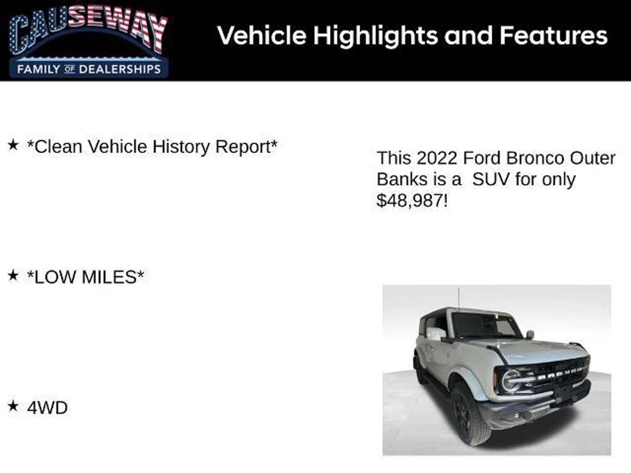 2022 Ford Bronco Outer Banks Rugged Capability Meets Premium Comfort Adventure is callingand the 2022 Ford Bronco Outer Banks 4WD is ready to answer. Finished in bold Cactus Gray with a refined Black Onyx interior, this low-mileage SUV (just 20,198 miles) combines iconic off-road heritage with modern technology and everyday comfort. Backed by the balance of the manufacturers warranty and a clean vehicle history report, you can drive with total confidence. Under the hood, the 2.7L EcoBoost V6 paired with a 10-speed automatic transmission delivers commanding power, smooth performance, and impressive towing and trail capability. The advanced 4WD system, traction control, and independent suspension ensure stability and control whether youre navigating highways, city streets, or rugged backroads. Inside, the Bronco Outer Banks surrounds you with premium touches and cutting-edge tech. Features include adaptive cruise control, 360-degree camera, built-in navigation, B&O Sound System by Bang & Olufsen with SiriusXM 360L, and smart-charging USB ports to keep devices powered. Comfort is elevated with remote keyless entry, air conditioning, and a universal garage door opener for seamless convenience. Safety is a top priority with integrated roll-over protection, emergency communication system (911 Assist), front and rear parking sensors, and a rear-view cameraso you can take on any journey with peace of mind. On the exterior, the Bronco showcases unmistakable style and toughness with its Carbonized Gray molded-in-color hard top, powder-coated tube steps, LED signature lighting, heated mirrors, and rugged all-terrain stancemaking it equally at home on the trail or in the city. Vehicle Details Odometer: 20,198 miles (14,003 below market average!) Engine: 2.7L EcoBoost V6 Transmission: 10-Speed Automatic Drivetrain: 4WD VIN: 1FMEE5BP2NLB57545 Stock #: FNLB57545 Color: Cactus Gray Interior: Black Onyx Highlights Balance of Manufacture Warranty Clean Vehicle History Report Low Miles Powerful 2.7L EcoBoost V6 with 4WD Carbonized Gray Molded Hard Top Adaptive Cruise Control & 360 Camera Premium B&O Sound System w/ SiriusXM Rugged Outer Banks Styling with LED Lighting The 2022 Ford Bronco Outer Banks 4WD is more than just an SUVits a lifestyle vehicle designed to handle daily driving and weekend adventures with equal confidence. If youre ready to experience iconic capability wrapped in modern comfort, this Bronco is built for you.