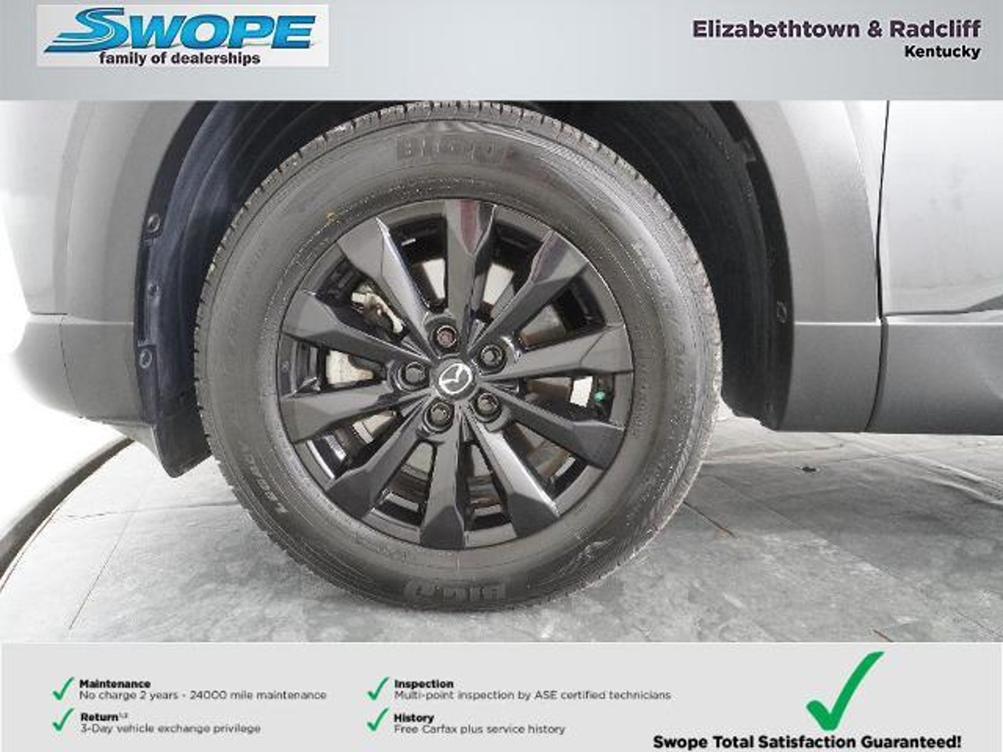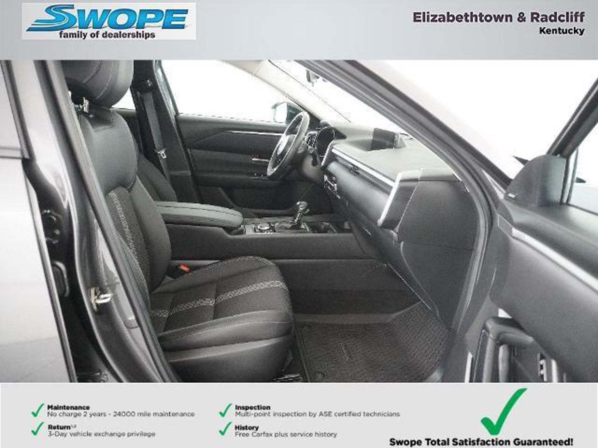 *Summary* Welcome to Bob Swope Fords exclusive listing of pre-owned vehicles. Call to speak to one of our certified Product Specialist to discover all this vehicle has to offer and see why we are a different dealership. Check out all our vehicles online at bobswopeford.com. *Vehicle Details* This CX-50 PR AWD comes nicely equipped with cloth seating w/leatherette trim power driver seat heated front seats Lane Departure Warning system w/lane keep assist Blind Spot Monitoring w/cross traffic alert Radar Cruise control panoramic moonroof removable cargo rack power liftgate Advanced keyless entry 10.25 color audio display w/Navigation dual zone auto climate control Android Auto/Apple Carplay BlueTooth leather wrapped tilt/telescoping steering wheel with audio and cruise controls Bose premium audio LED auto headlamps w/auto high beam heated mirrors cargo area protector 17 black painted alloy wheels and more. This Mazda CX-50 comes with the balance of the factory warranty. *Equipment* This vehicle is a certified CARFAX 1-owner. The vehicle has a clean CARFAX vehicle history report. Conquer any rainy snowy or icy road conditions this winter with the all wheel drive system on the Mazda CX-50. The Mazda CX-50 offers Android Auto for seamless smartphone integration. This model offers Apple CarPlay for seamless connectivity. The vehicle offers Automatic Climate Control for personalized comfort. This model features a high end BOSE stereo system. Protect this small suv from unwanted accidents with a cutting edge backup camera system. This vehicle enhances safety with a blind spot monitor alerting drivers to potential dangers in adjacent lanes. Easily set your speed in this model with a state of the art cruise control system. Increase or decrease velocity with the touch of a button. Bluetooth technology is built into this 2024 Mazda CX-50 keeping your hands on the steering wheel and your focus on the road. Quickly unlock this unit with keyless entry. This Mazda CX-50 stays safely in its lane with Lane Keep Assist. Load groceries and much more with ease into this Mazda CX-50 thanks to the power liftgate. *Packages* Weather Package: Cargo Liner with Seatback Protection; All-Weather Floor Mats; Roadside Assistance Kit Black Lug Nuts and Black Wheel Locks **Equipment listed is based on original vehicle build and subject to change. Please confirm the accuracy of the included equipment by calling the dealer prior to purchase.** *Additional Information* Complimentary 24-month/24000 mile maintenance package with every purchase. Proudly serving Elizabethtown and all surrounding areas for over 60 years. Call to schedule a test drive All prices plus tax title lic and dealer processing fee. Now that you found a vehicle you like lets schedule a time for you to take a pressure free test drive. Dealer Disclosure: Sales Tax Title License Fee Registration Fee Documentation fee of $499.00 and Finance Charges are additional to the advertised price.