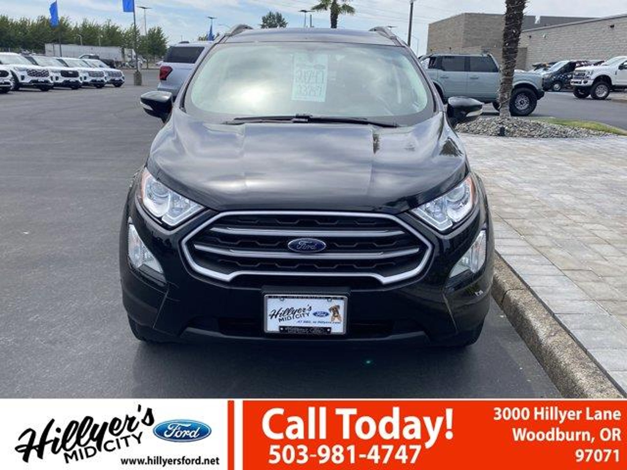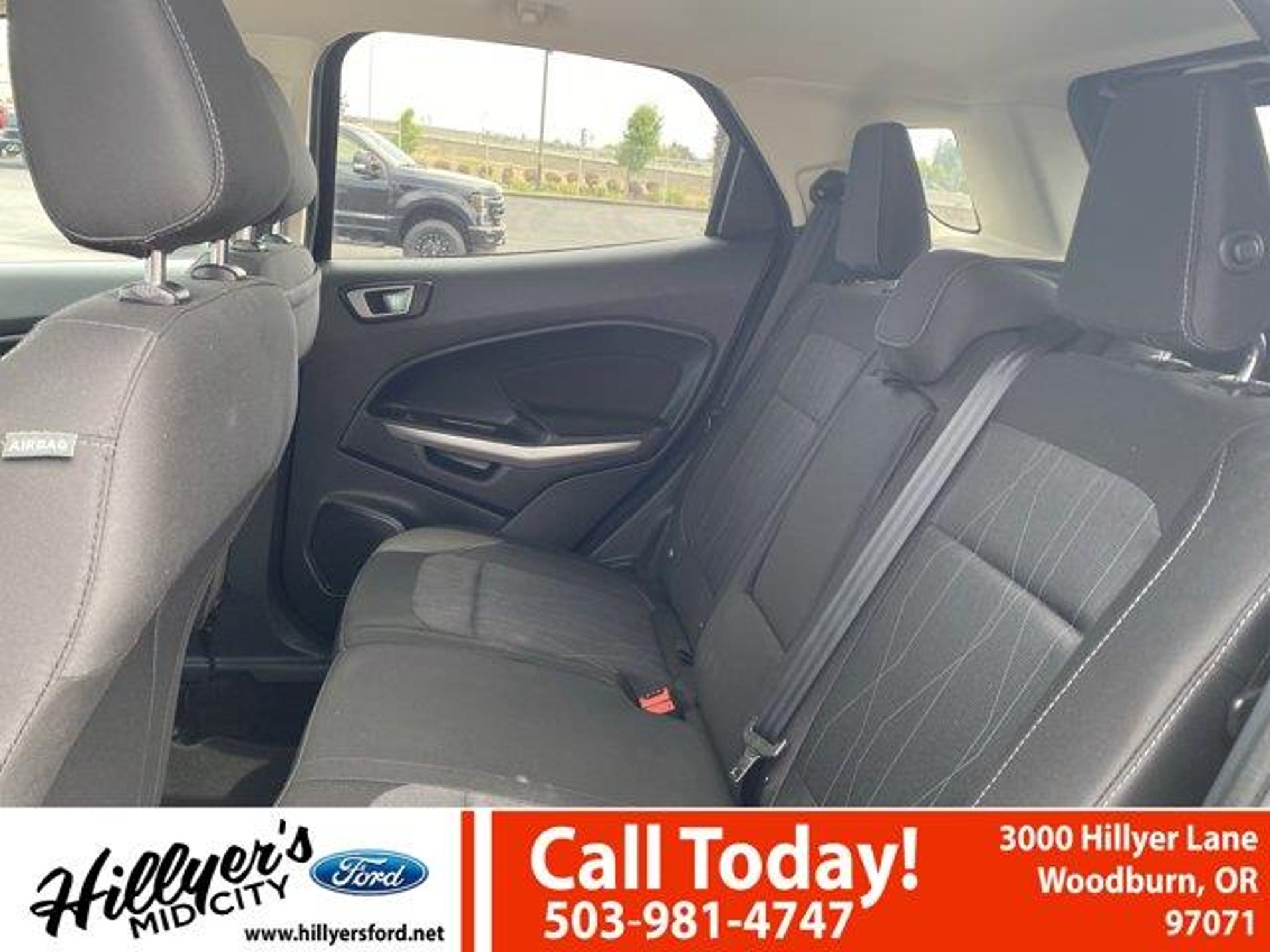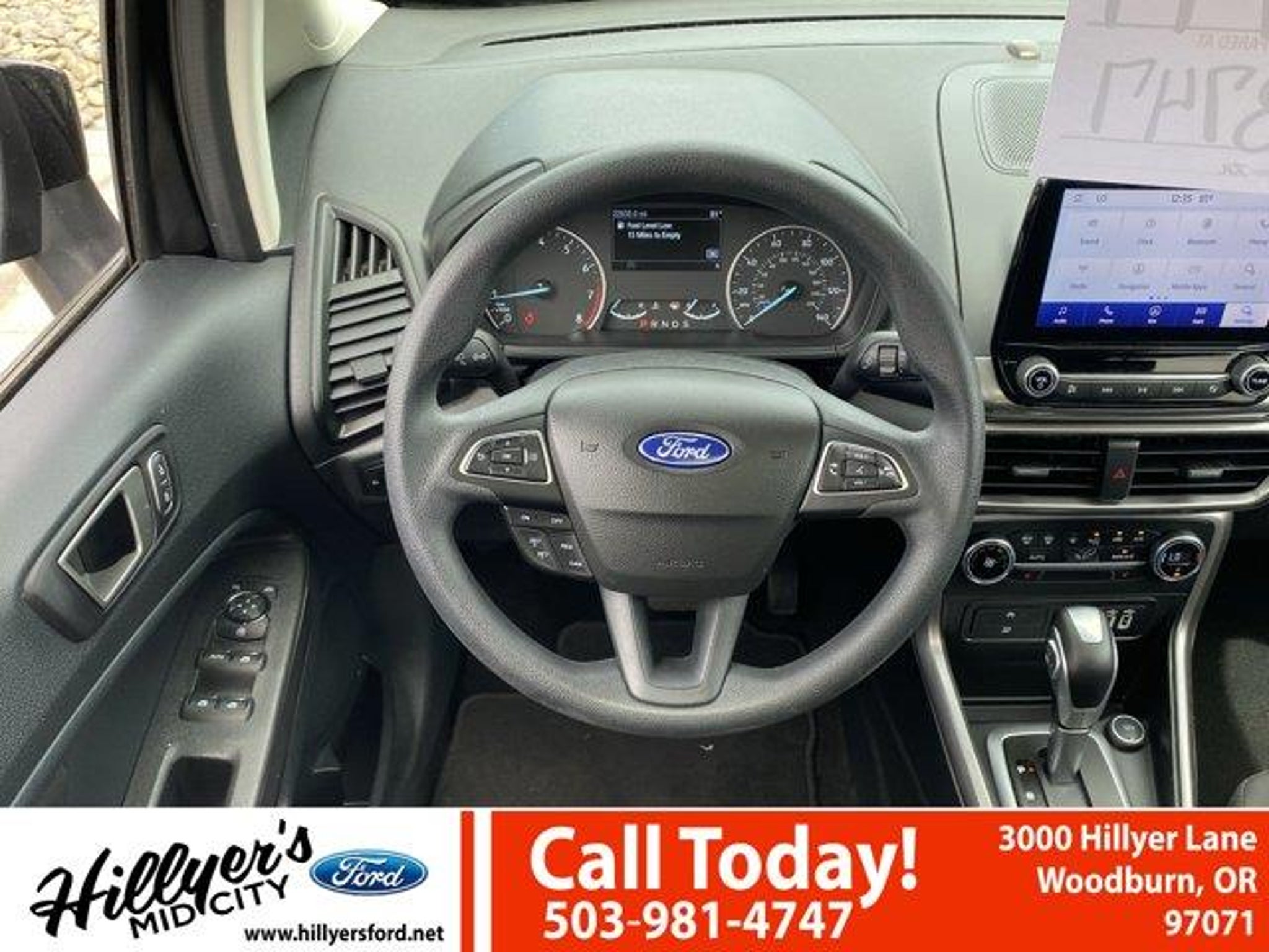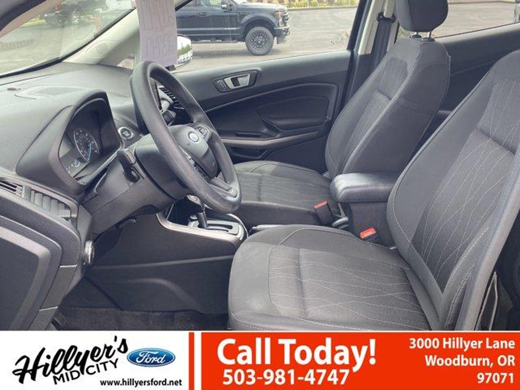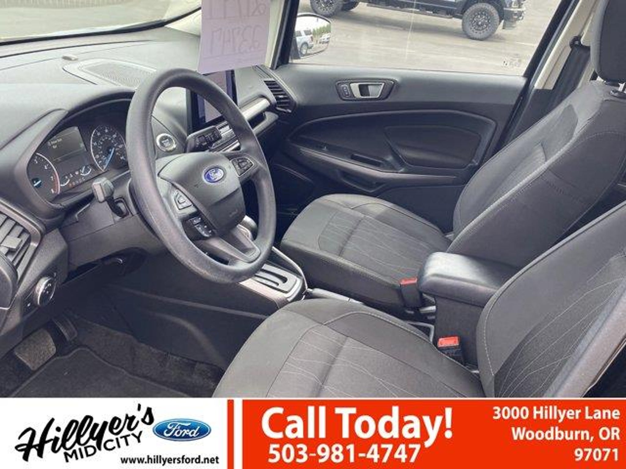 2022 Ford EcoSport SE Shadow Black 4WD 6-Speed Automatic 2.0L I4 Ti-VCT GDI110V/150W AC Power Outlet, 3.51 Axle Ratio, 4-Wheel Disc Brakes, 6 Speakers, 7 Speakers, ABS brakes, Air Conditioning, Alloy wheels, AM/FM radio: SiriusXM, Ambient Lighting, AppLink/Apple CarPlay and Android Auto, Automatic temperature control, BLIS Blind Spot Information System, Brake assist, Bumpers: body-color, Compass, Delay-off headlights, Driver door bin, Driver vanity mirror, Dual front impact airbags, Dual front side impact airbags, Electronic Stability Control, Emergency communication system: SYNC 3 911 Assist, Equipment Group 200A, Exterior Parking Camera Rear, Front anti-roll bar, Front Bucket Seats, Front Center Armrest, Front fog lights, Front reading lights, Front wheel independent suspension, Fully automatic headlights, Heated front seats, Illuminated entry, Knee airbag, Leather Shift Knob, Low tire pressure warning, Occupant sensing airbag, Outside temperature display, Overhead airbag, Overhead console, Panic alarm, Passenger door bin, Passenger vanity mirror, Power door mirrors, Power moonroof, Power steering, Power windows, Radio data system, Radio: AM/FM/MP3 Stereo, Rear anti-roll bar, Rear Parking Sensors, Rear seat center armrest, Rear side impact airbag, Rear window defroster, Rear window wiper, Remote keyless entry, Roof rack: rails only, SE Convenience Package, SiriusXM Radio, SiriusXM Traffic & Travel Link, Speed control, Speed-sensing steering, Split folding rear seat, Steering wheel mounted audio controls, SYNC 3 Communications & Entertainment System, SYNC 3 Communications & Entertainment System w/47B, Tachometer, Telescoping steering wheel, Tilt steering wheel, Traction control, Trip computer, Turn signal indicator mirrors, Unique Cloth Heated Front Bucket Seats, Variably intermittent wipers, Wheels: 16 Shadow Silver-Painted Aluminum.Come see us first, come see us last. Just come see us!!23/29 City/Highway MPGRemember Hillyer's Mid City Ford for the mid city DEAL not the big city STEAL!! Hillyer's has been family owned for over 25 years! Come to www.hillyers.com To See Our Specials!! Call us at (503) 981-4747 For help with any of our departments.