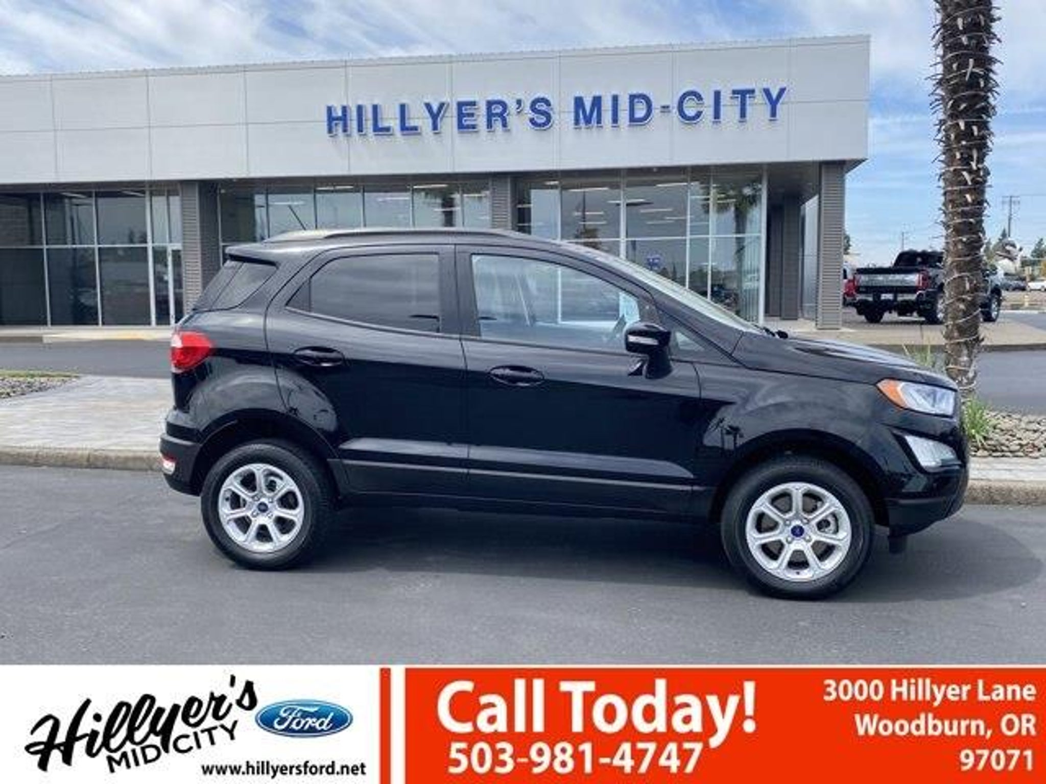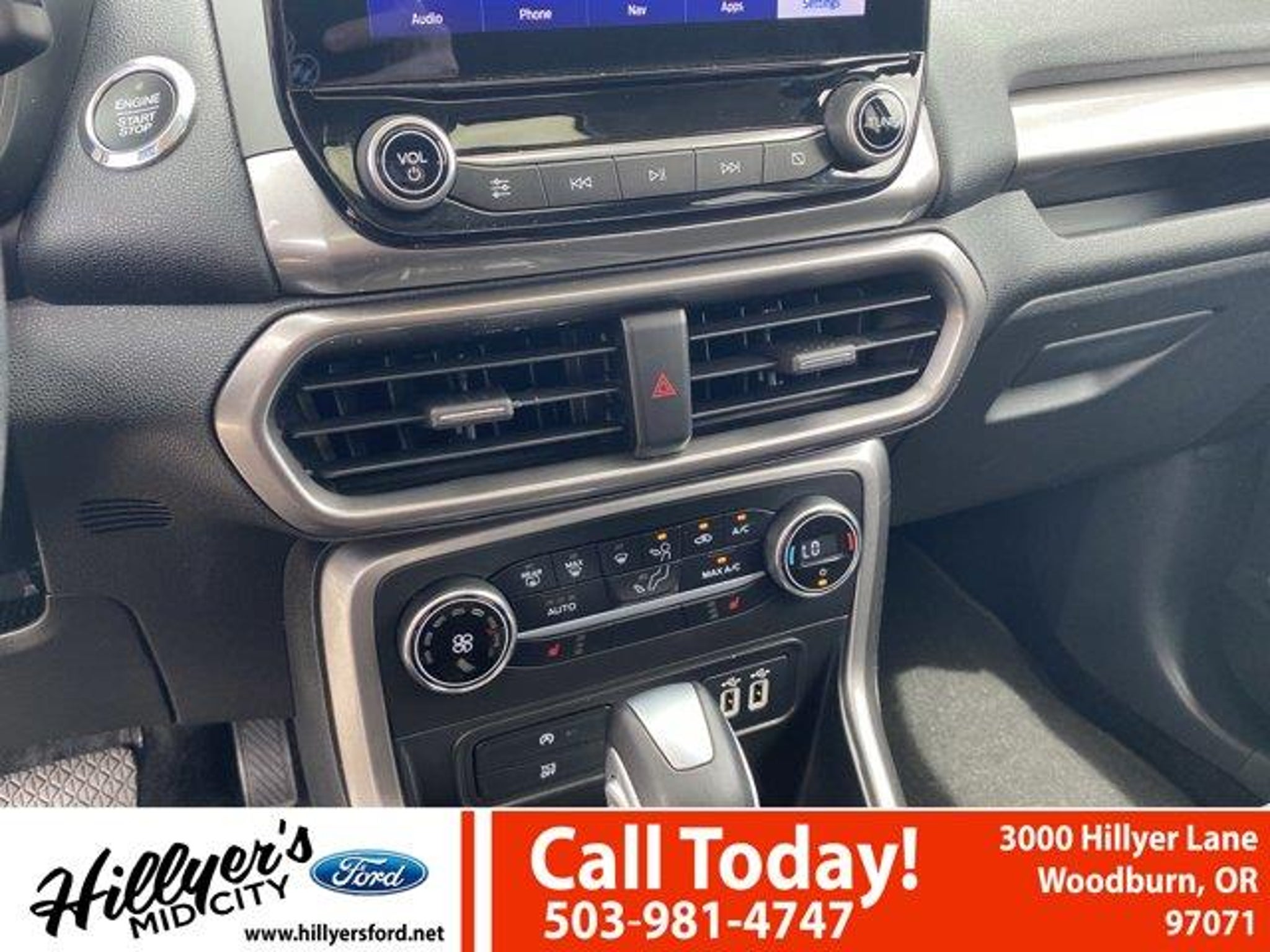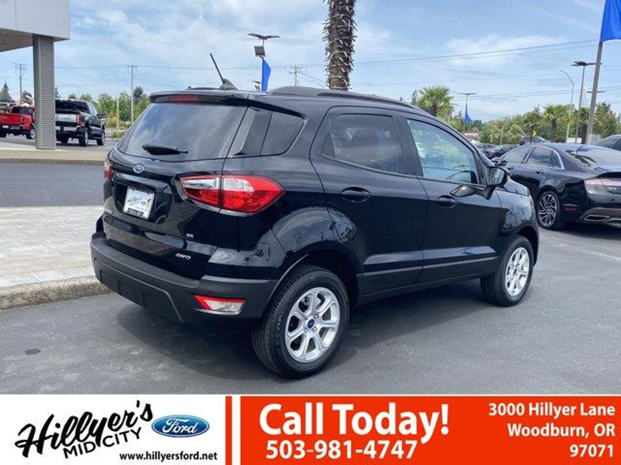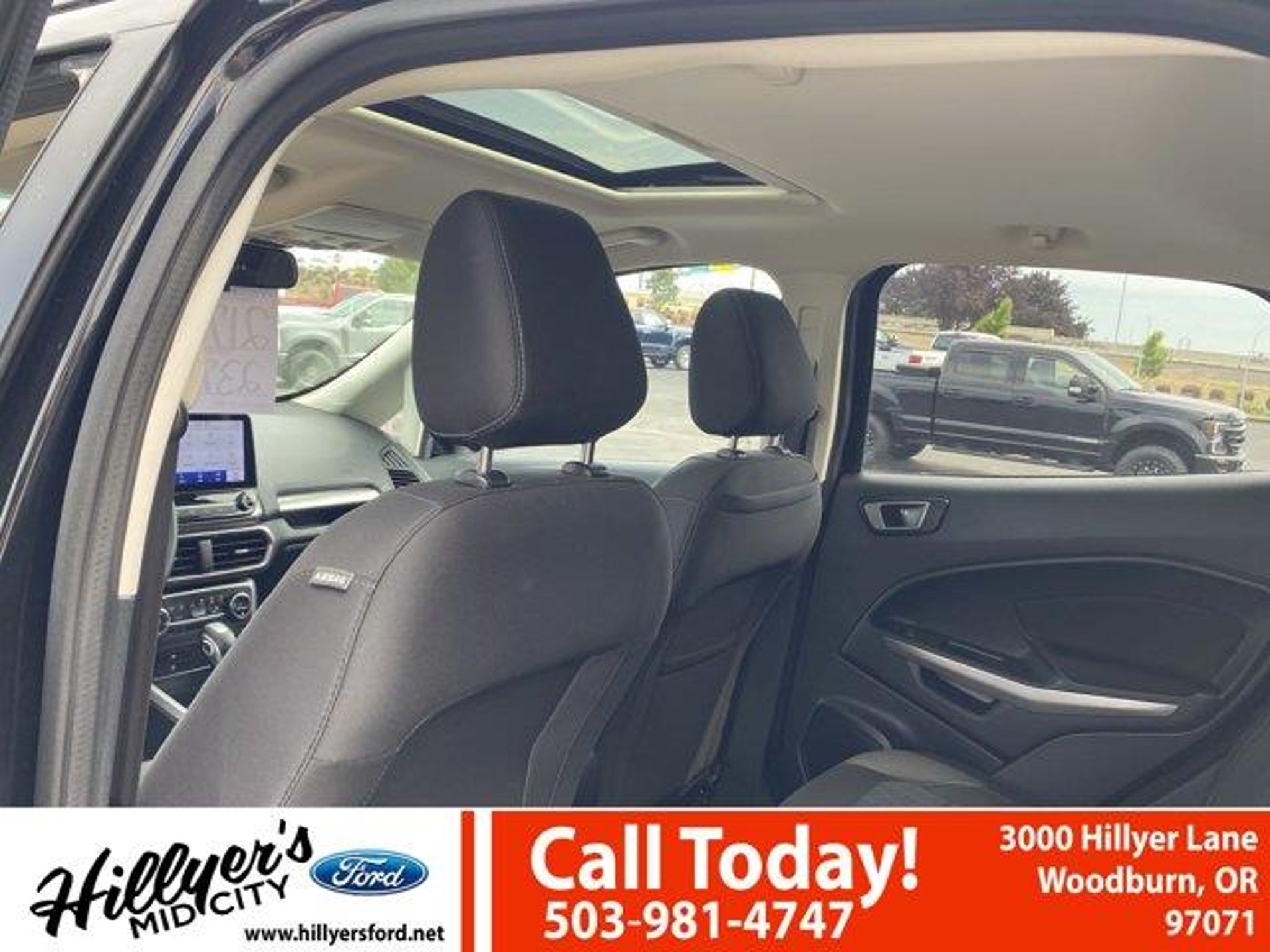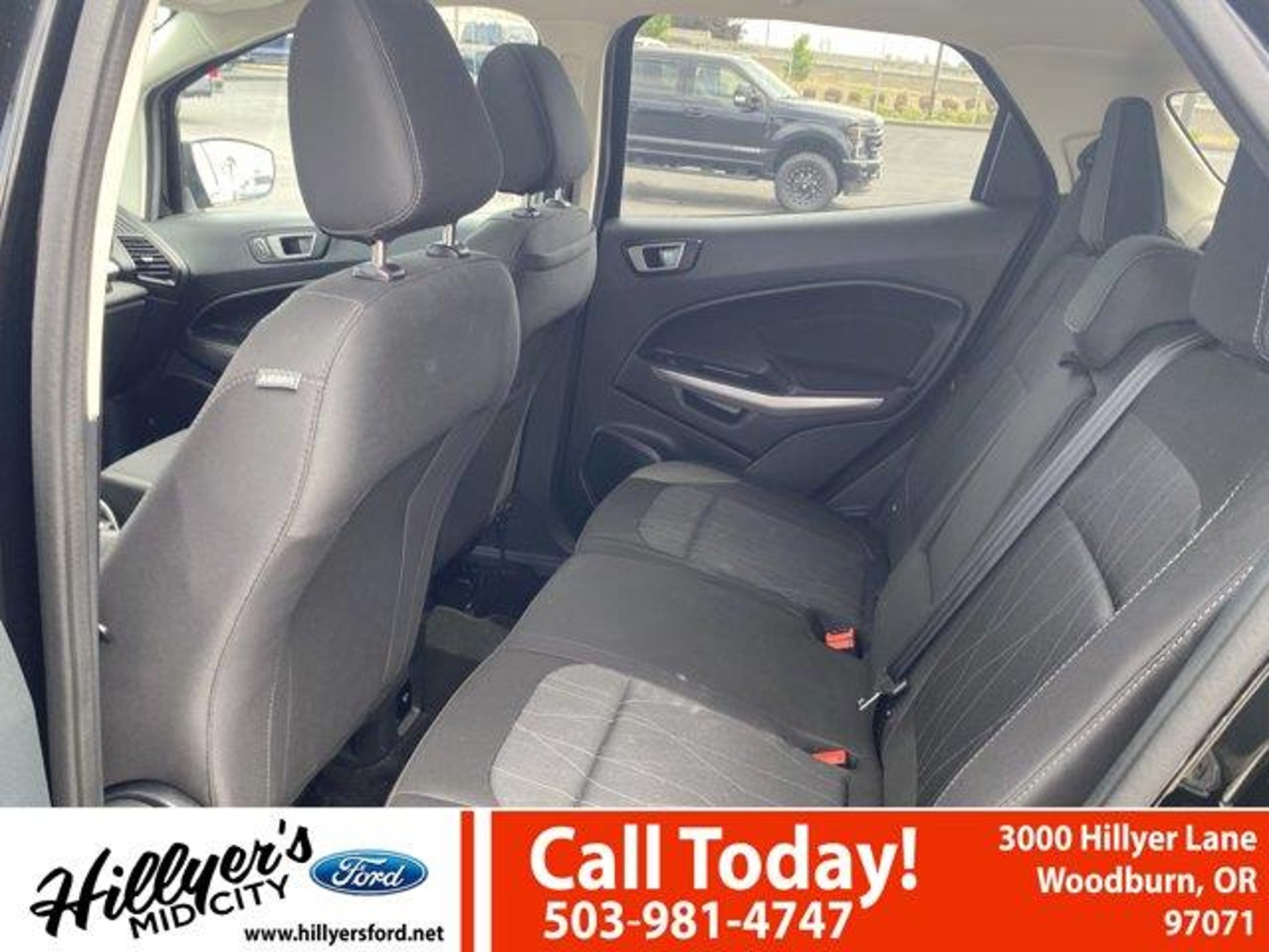 2022 Ford EcoSport SE Shadow Black 4WD 6-Speed Automatic 2.0L I4 Ti-VCT GDI110V/150W AC Power Outlet, 3.51 Axle Ratio, 4-Wheel Disc Brakes, 6 Speakers, 7 Speakers, ABS brakes, Air Conditioning, Alloy wheels, AM/FM radio: SiriusXM, Ambient Lighting, AppLink/Apple CarPlay and Android Auto, Automatic temperature control, BLIS Blind Spot Information System, Brake assist, Bumpers: body-color, Compass, Delay-off headlights, Driver door bin, Driver vanity mirror, Dual front impact airbags, Dual front side impact airbags, Electronic Stability Control, Emergency communication system: SYNC 3 911 Assist, Equipment Group 200A, Exterior Parking Camera Rear, Front anti-roll bar, Front Bucket Seats, Front Center Armrest, Front fog lights, Front reading lights, Front wheel independent suspension, Fully automatic headlights, Heated front seats, Illuminated entry, Knee airbag, Leather Shift Knob, Low tire pressure warning, Occupant sensing airbag, Outside temperature display, Overhead airbag, Overhead console, Panic alarm, Passenger door bin, Passenger vanity mirror, Power door mirrors, Power moonroof, Power steering, Power windows, Radio data system, Radio: AM/FM/MP3 Stereo, Rear anti-roll bar, Rear Parking Sensors, Rear seat center armrest, Rear side impact airbag, Rear window defroster, Rear window wiper, Remote keyless entry, Roof rack: rails only, SE Convenience Package, SiriusXM Radio, SiriusXM Traffic & Travel Link, Speed control, Speed-sensing steering, Split folding rear seat, Steering wheel mounted audio controls, SYNC 3 Communications & Entertainment System, SYNC 3 Communications & Entertainment System w/47B, Tachometer, Telescoping steering wheel, Tilt steering wheel, Traction control, Trip computer, Turn signal indicator mirrors, Unique Cloth Heated Front Bucket Seats, Variably intermittent wipers, Wheels: 16 Shadow Silver-Painted Aluminum.Come see us first, come see us last. Just come see us!!23/29 City/Highway MPGRemember Hillyer's Mid City Ford for the mid city DEAL not the big city STEAL!! Hillyer's has been family owned for over 25 years! Come to www.hillyers.com To See Our Specials!! Call us at (503) 981-4747 For help with any of our departments.
