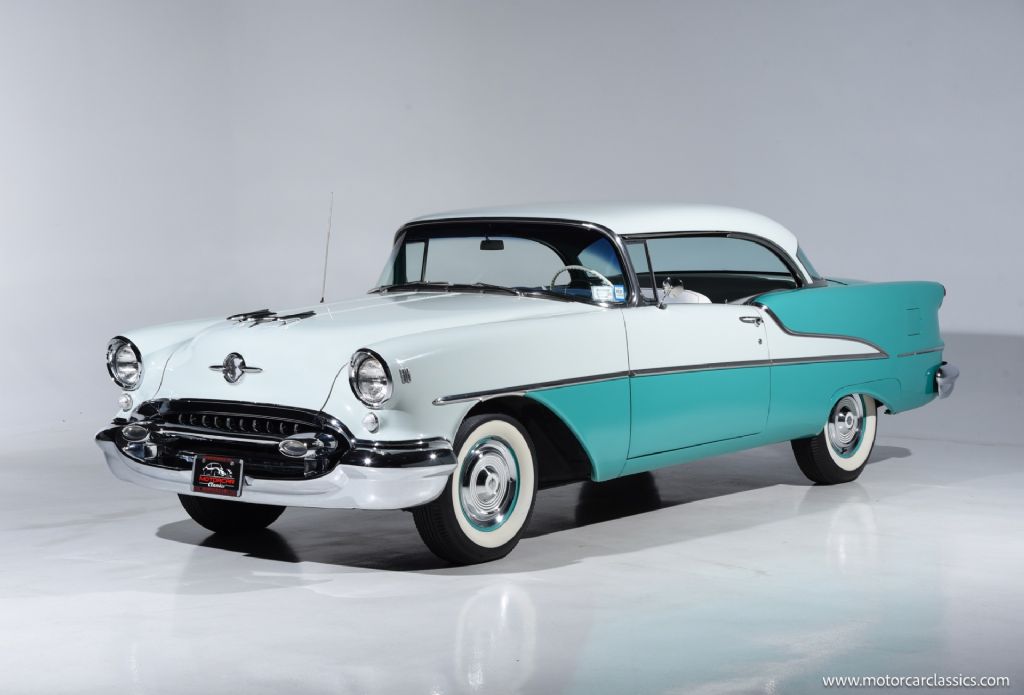 1955 Oldsmobile 88 for sale! This striking 1955 Oldsmobile 88 Holiday two-door hardtop stands as a testament to the Rocket Age, finished in its factory-correct two-tone Glen Green/Polar White colors that pay homage to Oldsmobile's celebrated mid-century style. The car was fully restored in the early 1990s, at which time both the engine and automatic transmission were professionally rebuilt to factory specifications, ensuring that it runs with exceptional smoothness and reliability. The interior has been completely renewed with correct 1955 Oldsmobile patterns, lending an inviting authenticity and comfort befitting its era. Always garage kept and driven only in favorable weather, this 88 benefits from decades of careful stewardship, including the thoughtful addition of an electric fuel pump for greater reliability and drivability.