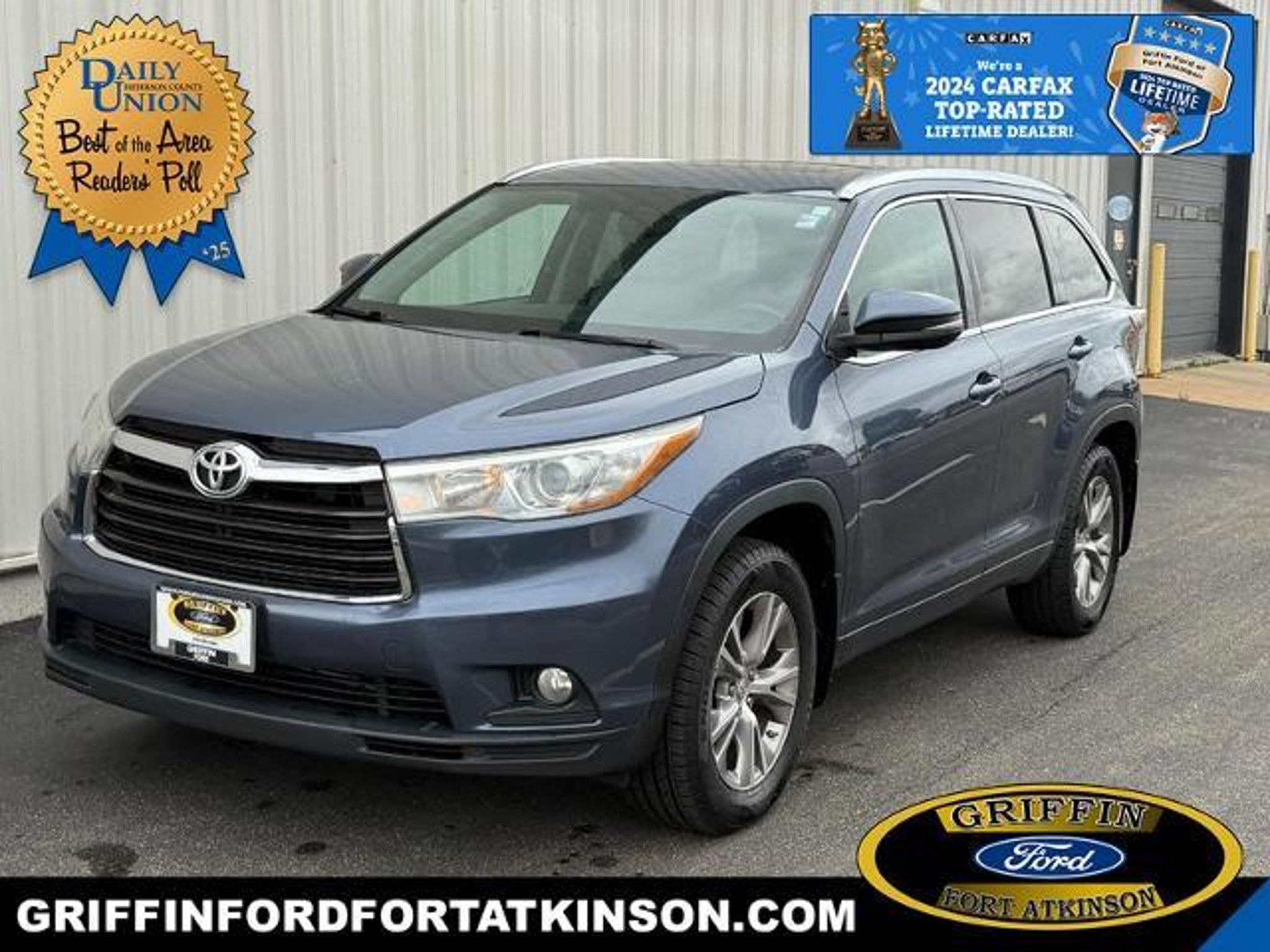 Carfax and Autotrader list this Highlander as a GREAT VALUE/GREAT PRICE! ** BUDGET PRICED 3 row seating AWD SUV!! 2015 Toyota Highlander XLE V6 AWD with top notch features like Navigation, Power Sunroof/Moonroof, Heated Leather Front Seats, Center Bucket Seats, Bluetooth, Backup Camera and more! This is just a 2 owner vehicle and has been well maintained. Sure its got a few cosmetic blemishes here and there, but its in good mechanical condition. Fully inspected and ready to go with New Front Brake Pads, Calipers and Rotors, New Front Heated Seat Module, New Cabin Air Filter, New Engine Air Filter, New Wiper Blades and Fresh Oil Change. This could be the perfect vehicle for the 1st time driver or a nice second family vehicle that wont cost a fortune! 2nd Row Captain Chairs, 3rd row seats: split-bench, 4-Wheel Disc Brakes, 4.154 Axle Ratio, 6 Speakers, ABS brakes, Air Conditioning, AM/FM radio: SiriusXM, Anti-whiplash front head restraints, Auto-dimming Rear-View mirror, Automatic temperature control, Brake assist, Bumpers: body-color, CD player, Delay-off headlights, Driver door bin, Driver vanity mirror, Dual front impact airbags, Dual front side impact airbags, Electronic Stability Control, Exterior Parking Camera Rear, Four wheel independent suspension, Front anti-roll bar, Front Bucket Seats, Front Center Armrest, Front dual zone A/C, Front fog lights, Front reading lights, Fully automatic headlights, Garage door transmitter, Heated door mirrors, Heated front seats, Illuminated entry, Knee airbag, Leather Seat Material, Leather Shift Knob, Low tire pressure warning, Navigation System, Occupant sensing airbag, Outside temperature display, Overhead airbag, Overhead console, Panic alarm, Passenger door bin, Passenger vanity mirror, Power door mirrors, Power driver seat, Power Liftgate, Power moonroof, Power steering, Power windows, Radio: Entune Premium Audio w/Nav & App Suite, Rear air conditioning, Rear anti-roll bar, Rear reading lights, Rear window defroster, Rear window wiper, Reclining 3rd row seat, Remote keyless entry, Roof rack: rails only, Security system, Speed control, Speed-sensing steering, Split folding rear seat, Spoiler, Steering wheel mounted audio controls, Tachometer, Telescoping steering wheel, Tilt steering wheel, Traction control, Trip computer, Turn signal indicator mirrors, Variably intermittent wipers, Wheels: 18 Split 5-Spoke Machined-Face Alloy. Griffin Ford Fort Atkinson - Having Fun ... Getting it Done!!! Awards: * ALG Residual Value Awards, Residual Value Awards * 2015 IIHS Top Safety Pick * 2015 KBB.com Best Buy Awards * 2015 KBB.com 10 Best Certified Pre-Owned 3-Row SUVs Under $30,000 * 2015 KBB.com 15 Best Family Cars