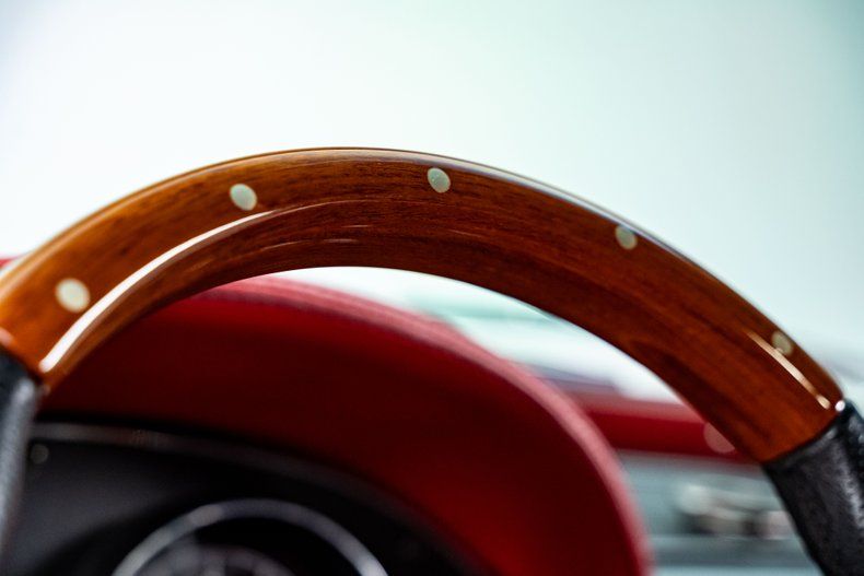 Inside, the car combines heritage with refinement. Upholstery by Steve Holcomb wraps the cabin in rich red leather with black suede inserts, covering the seats, dash, console, and custom panels. The seats provide bolstered modern comfort, while Dakota Digital gauges preserve factory styling with updated function. A period-correct Antique Automobile Radio head unit hides modern Bluetooth connectivity, paired with an Alpine amplifier and modern speakers for high-quality sound. Vintage Air climate control ensures comfort in any weather, while dimmable LED ambient lighting adds a modern touch that enhances the cabin's atmosphere. Above, a custom alcantara headliner with leather-wrapped sunvisors adds an extra layer of detail. Every surface has been tailored with precision, and even the doors close with the solid, confident sound of a modern luxury car.