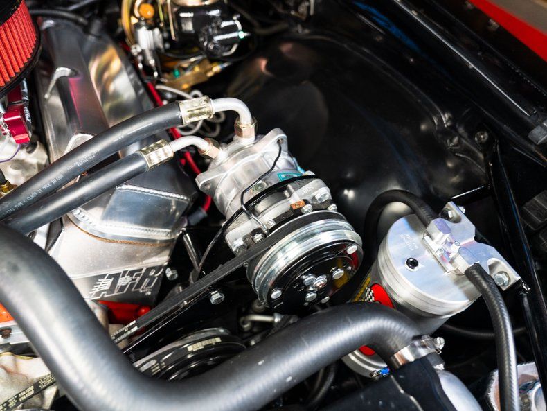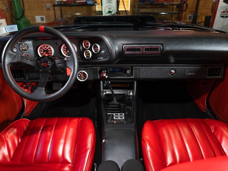 Inside, the Camaro delivers a perfect mix of vintage style and modern comfort. Featured on the Custom Works dash are Autometer gauges, Vintage Air conditioning, Retrosound Bluetooth radio. Every switch, gauge, and surface reflects the same attention to detail found throughout the rest of the build. From the Custom red interior, you're connected directly to the car.