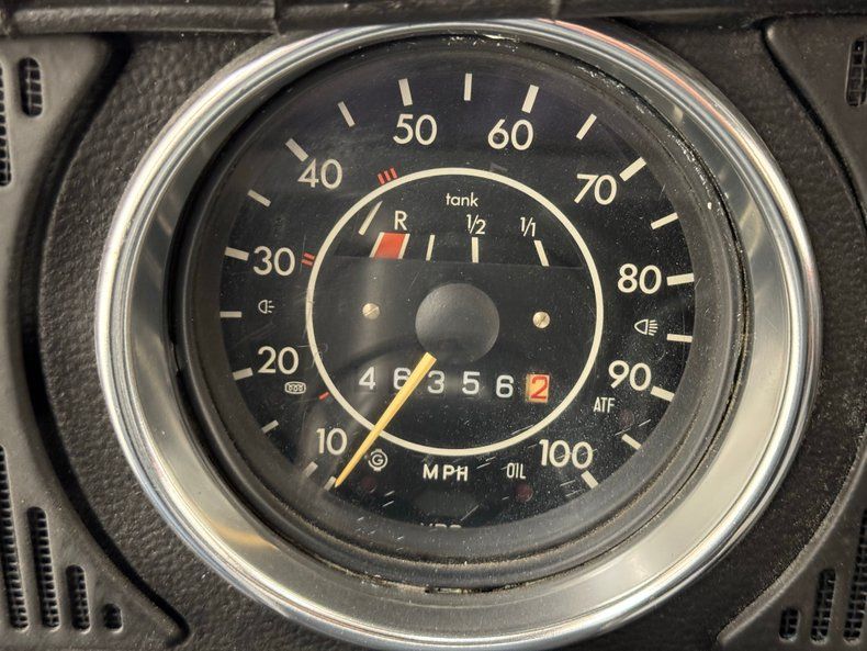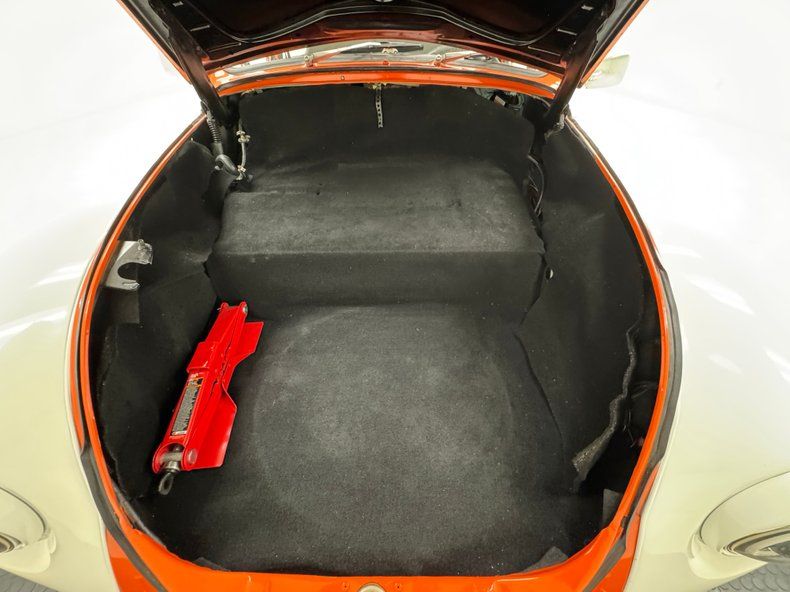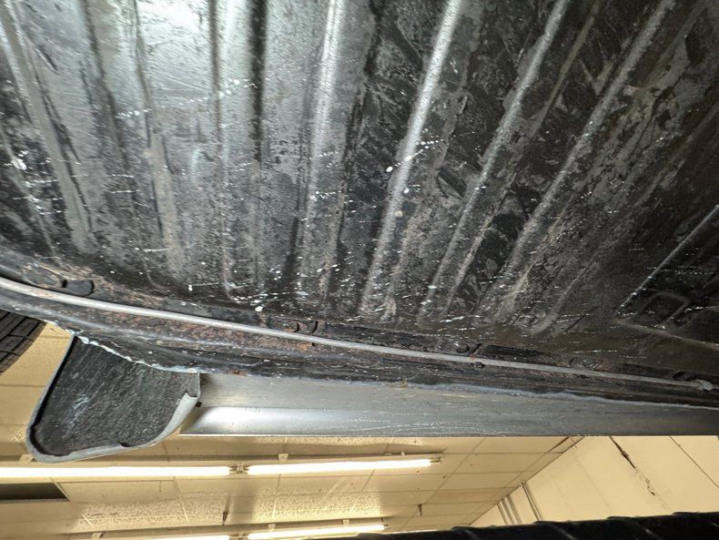 Generally clean underneath with typical surface rust, patina, and a clean, prominent belly pan. We note some gunk build up on the transaxle and some cut out and patched metal. Dual exhausts are heat wrapped and flow through a stock style muffler that emits two chrome tailpipes. Brakes are onboard as front disc and rear drum and the lowered suspension included MacPherson struts up front and a transverse torsion bar in back with semi trailing arms.