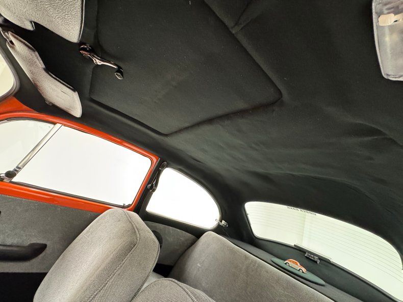 Orange and White two stage paint alternate on the body creating a dramatic presentation with a bold orange center and white flanks. The bumperless front features LED headlights and body colored rings and shaved fender markers replaced with stealthy LED's down below. Out back, Frenched teardrop tail lights create a custom look with marker lights now affixed to the free floating bumper braces that flank twin exhaust pipes. A gray graphic highlights the shape of the car by riding the shoulder line and widening at the rear fender while the black has been removed from the running board creating sleek, metal units. 15-inch chrome Minilite type wheels carry staggered size tires no older than 2019, and the bug has been lowered 2" over them for a classic street stance. A single crack in the paint near a running board is the only exterior imperfection we note.