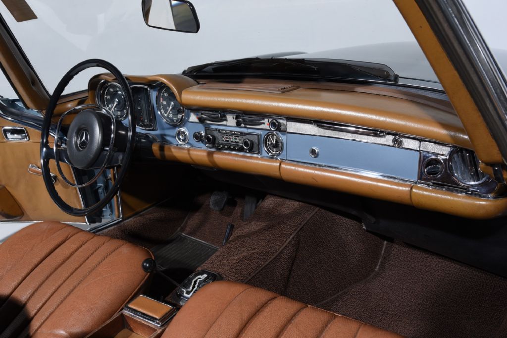 1969 Mercedes-Benz 280SL for sale! This 1969 Mercedes-Benz 280SL (W113) Pagoda is a very attractive condition 3+ driver, finished in Blue Metallic over a tan interior with a matching removable hardtop and navy blue soft top. Powered by the 2.8L inline six paired with an automatic transmission, it delivers the smooth, relaxed grand-touring character that has made the 280SL so enduringly popular. The Blue Metallic paint highlights the elegant Pagoda body lines and is complemented by desirable European headlamps, which lend a more refined, period-correct appearance. Inside, the warm tan upholstery provides an inviting contrast to the exterior, and the cabin retains its original Becker Europa stereo, an appealing feature for buyers who value authenticity and correct details. This 280SL represents a compelling opportunity for an enthusiast seeking a handsome, usable driver with dual tops and classic W113 style.