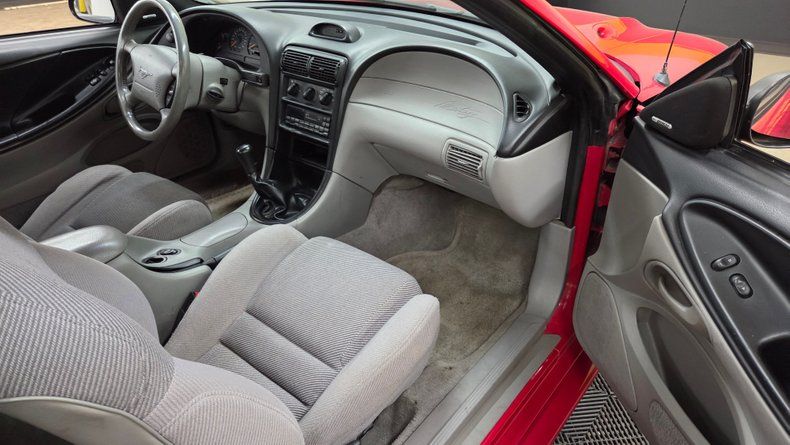 1996 Ford Mustang GT coupe with two owners and clean Carfax 4.6L SOHC V8 paired with a five-speed manual transmission Red exterior paint, black and gray interior with power driver's seat, and original wheels. Cold-blowing air conditioning, recent clutch maintenance, and Pioneer CD changer