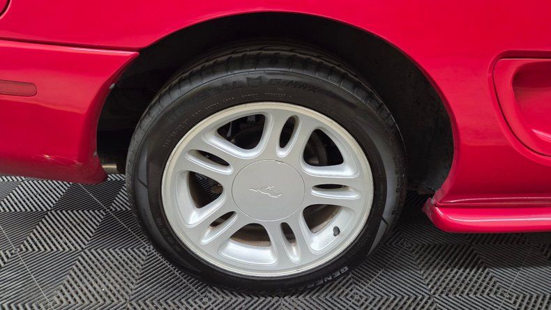 1996 Ford Mustang GT coupe. A two-owner vehicle with a clean Carfax report. The car is powered by a 4.6-liter V8 engine paired with a five-speed manual transmission. Red paint with minor imperfections typical for a car of this age and mileage. The car rides on its original stock wheels fitted with General Radial GMAX tires which still have plenty of tread left. Cloth bucket seats with a power driver's seat and a black and gray interior that maintains a clean and well-kept appearance. The headliner and dashboard are in good shape, and modern amenities such as power windows, power locks, power mirrors, and cold-blowing air conditioning. The interior also features a Pioneer CD changer mounted behind the rear driver's side seat, accessible by folding down the seat. The clutch, pressure plate, and flywheel are relatively new. The engine bay is mostly stock, with an aftermarket air filter upgrade to improve airflow. Slight inaccuracy in the fuel gauge reading. Cruise control is operational. Driving impressions reveal a sporty yet comfortable ride. The Mustang handles flat and stable through corners, with enough engine rumble to provide the classic V8 muscle car experience without being overwhelming.