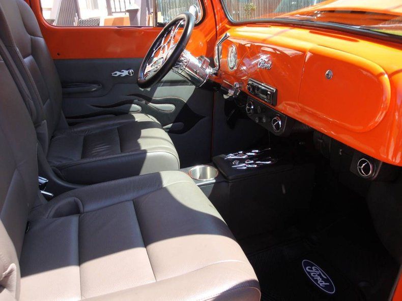 CONDITION This 1951 Ford F1 Street Rod is a stunning combination of classic Ford styling and modern hot rod engineering. Finished in bright tangerine orange, this all-steel-bodied truck (with fiberglass fenders) commands attention everywhere it goes. Under the hood, a powerful and reliable 350 Chevy V8 is paired with a smooth-shifting Turbo 350 automatic transmission and Ford 9" rear end, creating the perfect balance of performance and drivability. The custom interior features premium leather seats, Vintage Air climate control, and a Sony sound system, making this truck as comfortable as it is stylish. The chassis has been upgraded with a Mustang II suspension, power steering, and front disc brakes for confident handling. The craftsmanship extends to every detail, from the oak bed floor to the polished stainless exhaust and bumpers. This F1 looks, sounds, and drives beautifully-a true show-quality street rod that's ready to be enjoyed immediately.