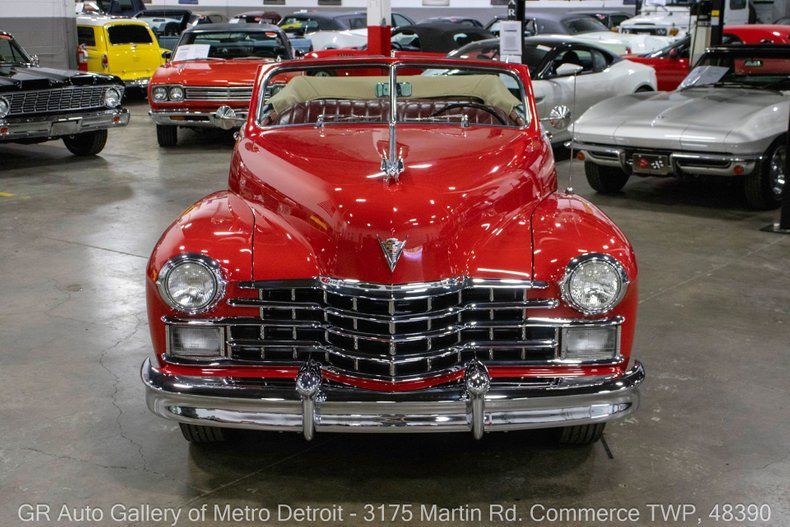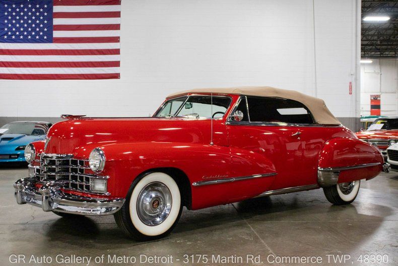 GR Auto Gallery is pleased to present this elegant 1947 Cadillac Series 62 Convertible for your consideration. Finished in Vincennes Red over a matching Red interior, this post-war luxury cruiser is powered by its original 346 cubic inch L-head V8 engine paired with a Hydra-Matic 2-speed automatic transmission. This example received a restoration approximately 16 years ago and still retains its original interior, showcasing the craftsmanship of its time. It has been thoughtfully upgraded from a 6-volt to an 8-volt battery system for more reliable starting, and it rides on new Diamondback radial tires. With a commanding 129-inch wheelbase, this Cadillac features optional chrome backup lights, crank windows, a power-operated convertible top, a full-size spare tire, and spacious trunk storage. Only 6,755 Series 62 Convertibles were produced in 1947, making this a rare and desirable classic. Recent maintenance completed in 2025 includes a new gearbox, fresh driveshaft rebuild, new idler arm and bracket, new transmission mount, and a full service inspection with receipts totaling $5,906. The car is also equipped with beautifully chrome bumpers both front and rear. Drive this one out of our showroom or have us assist with shipping it to you anywhere in the United States! Don't hesitate to call us with any questions or for more information.