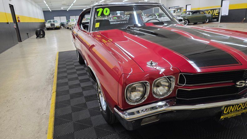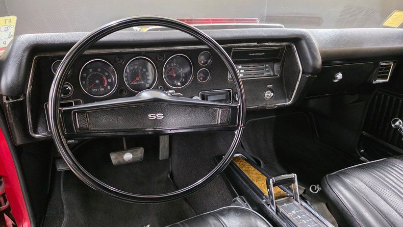 1970 Chevrolet Chevelle two-door hardtop, believed to be a true SS equipped with a 454 big block engine and the ORIGINAL NUMBERS MATCHING Turbo Hydra-Matic 400 (TH400) automatic transmission. Originally cranberry red exterior with black vinyl bucket seat and center console interior, correct vintage date-coded wheels, and dual exhaust system. Features proper SS components like power steering, power brakes, and a cowl induction hood with hood pins. Minor imperfections consistent with a driven vehicle but overall presenting a clean, tight-running classic muscle car. Inside, shifted by a horseshoe shifter on the center console, and a functioning digital retro style AM/FM stereo, complemented by aftermarket gauges for oil pressure, temperature, and voltage. The engine bay is clean and well-equipped, featuring headers, an Edelbrock 4bbl carburetor, aluminum radiator with dual fans, serpentine belt system, aluminum valve covers, an open element air cleaner, and HEI ignition system. This car includes a hidden security feature, before turning the key to start, hold the cigarette lighter in. On the road the Chevelle's exciting smooth performance, effective brakes, and responsive cornering are evident.