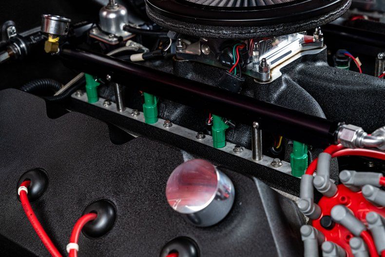 Backing the engine is a Tremec TKO500 5-speed manual transmission with a hydraulic clutch and a Hurst Pistol Grip shifter. Power moves to the pavement through a Moser Dana 60 rear axle with 3.73 gears. The chassis was upgraded with an RMS AlterKtion front suspension and QA1 coilovers, paired with a Ridetech 4-link rear setup that keeps the stance planted under acceleration. Braking is handled by SSBC calipers clamping slotted rotors with a Wilwood reservoir assisted by a Hydratech hydraulic boost system. Steering is quick and precise thanks to power rack-and-pinion hardware mounted to an Ididit tilt column. Intro Pentia billet wheels, 18" up front and 19" in the rear, wear Michelin Pilot Sport 4S tires measuring 245mm front and 295mm rear that give the car a modern footprint.