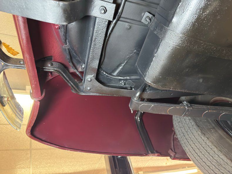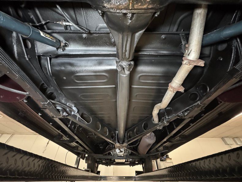 Show quality underneath with a few drips here and there and minimal surface rust. Suspension consists of leaf springs front and rear and drum brakes are also distributed to both ends. A single exhaust runs through a stock style muffler, snaking through the X-frame, then finds its way to the outside via a clean, steel pipe.