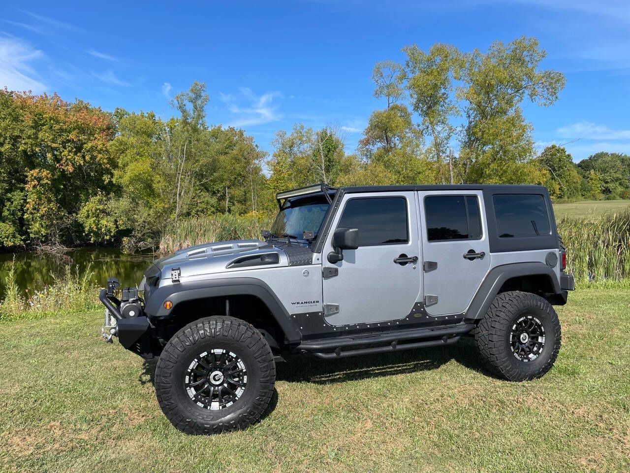 2013 Jeep Unlimited Sport 4X4 with only 68,000 miles and many many added options!! 221 PHOTOS! SALE PRICED! Some of the exterior features include Rough Country 4 inch lift, DV8 off road heat hood, XRC front and rear bumpers, XRC side steps, Alpena led lights, matching black front end armor and fender flares and Barricade 9500 lb front winch. Creature comforts include air conditioning, speed control, tilt steering column, steering wheel audio controls, rear window wiper and Kenwood xm stereo with back up camera and kicker subwoofer. Added factory optional equipment include trailer tow with 4 pin connector, 3;73 rear axle ratio, 5 speed automatic transmission with hill decent, slush mats and 3 piece black freedom hard top. On the ground we have Nitro 315/75 Ridge Grappler tires mounted on 16' Mamba off road wheels. This vehicle has spent its life in the southern half of the US and shows no signs of any major corrosion and the Billet Silver Metallic paint is in beautiful condition. WE OFFER COMETITVE RATE FINANCING AND NATIONWIDE SHIPPING!