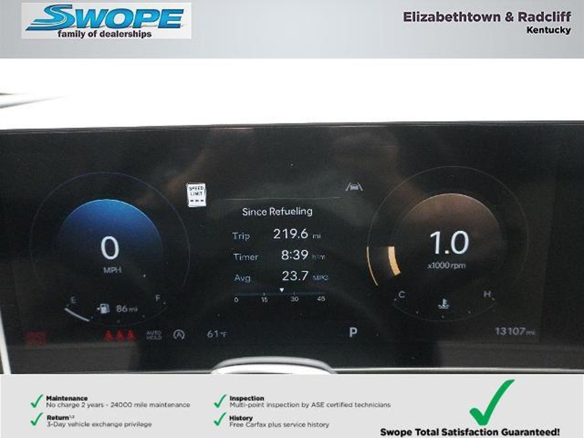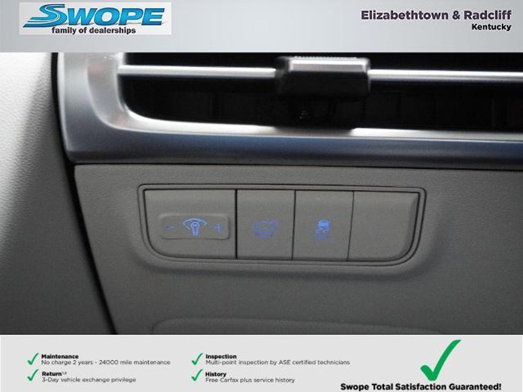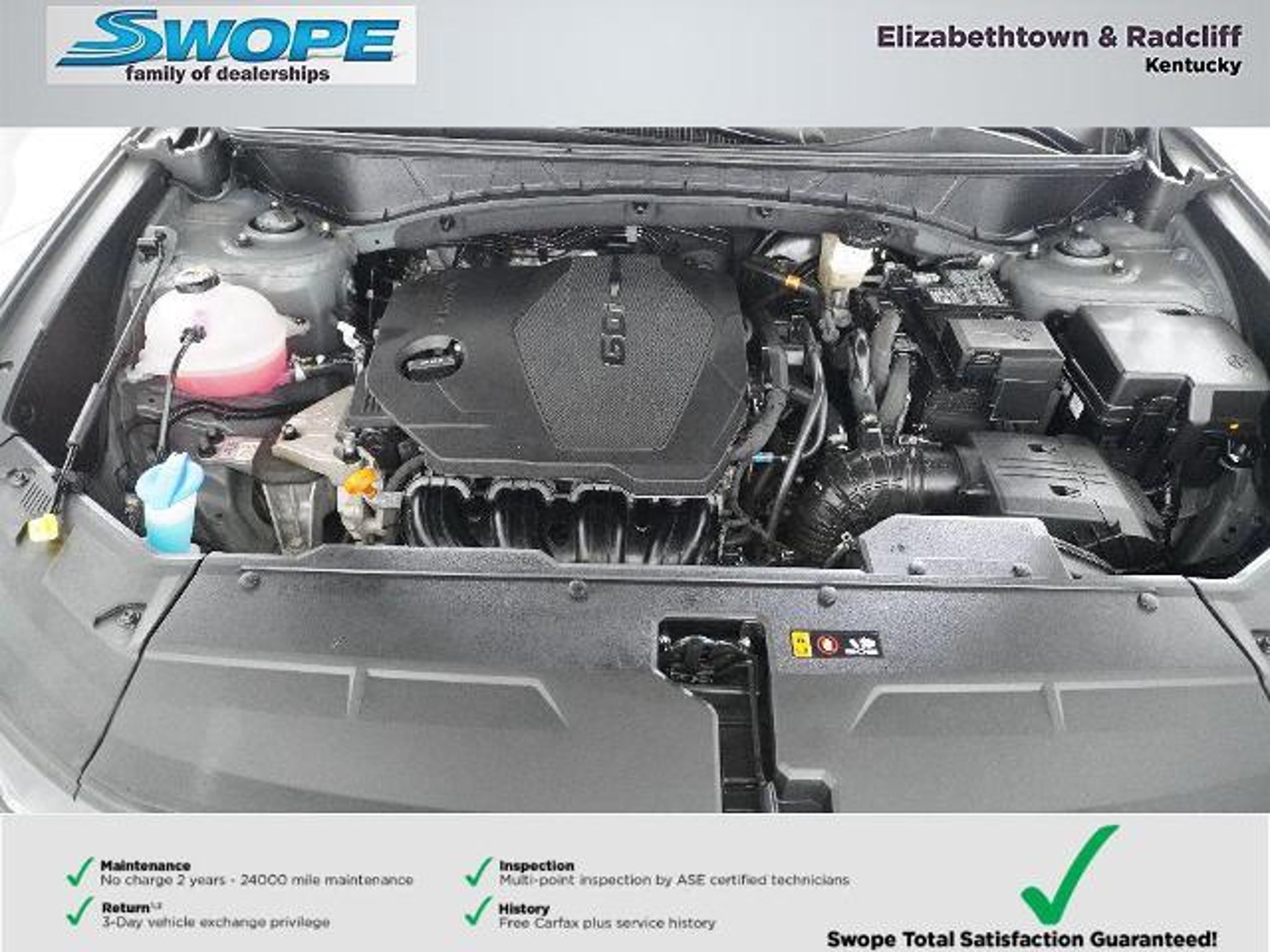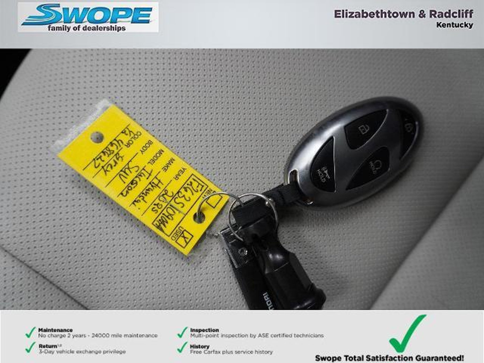*Summary* Welcome to Bob Swope Fords exclusive listing of pre-owned vehicles. Call to speak to one of our certified Product Specialist to discover all this vehicle has to offer and see why we are a different dealership. Check out all our vehicles online at bobswopeford.com. *Vehicle Details* 2025 Hyundai Tucson SEL Convenience ? 4WD 2.5L 4-Cylinder 13106 miles ? Elizabethtown KY This immaculate 2025 Hyundai Tucson SEL Convenience combines sporty style efficient performance and modern tech at the best price in Elizabethtown KY. With only 13106 miles this low-mileage crossover delivers reliable daily driving and long-term value backed by a CARFAX 1-Owner history and a CARFAX Clean Report. The responsive 2.5L 4-cylinder engine and available 4WD give confident handling in varied road and weather conditions making it ideal for family trips or commuting. Inside enjoy Hands Free Bluetooth and Apple CarPlay for seamless smartphone integration plus Automatic Climate Control to keep everyone comfortable on every drive. The SEL Convenience trim balances refined comfort and practical features that matter: smart connectivity efficient power and a thoughtfully designed interior. This Hyundai Tucson is priced to move ? you wont find a better combination of condition mileage and value in the area. Whether youre navigating city streets or weekend getaways this low-mileage well-maintained SUV offers peace of mind with proven care and a clean CARFAX record. Located in Elizabethtown KY and ready for a test drive this 2025 Hyundai Tucson SEL Convenience is an exceptional buy for drivers seeking capability safety and modern convenience at the best price. Schedule your visit and see why this Hyundai Tucson stands out. *Equipment* The vehicle features a hands-free Bluetooth phone system. The Hyundai Tucson offers Apple CarPlay for seamless connectivity. Protect the Hyundai Tucson from unwanted accidents with a cutting edge backup camera system. This 2025 Hyundai Tucson comes equipped with Android Auto for seamless smartphone integration on the road. Our dealership has already run the CARFAX report and it is clean. A clean CARFAX is a great asset for resale value in the future. The Hyundai Tucson offers Automatic Climate Control for personalized comfort. Youll never again be lost in a crowded city or a country region with the navigation system on this mid-size suv. The leather seats in the Hyundai Tucson are a must for buyers looking for comfort durability and style. Good News! This certified CARFAX 1-owner vehicle has only had one owner before you. When you encounter slick or muddy roads you can engage the four wheel drive on this mid-size suv and drive with confidence. *Packages* Option Group 01. Cross Rails. Carpeted Floor Mats. Cargo Net. First Aid Kit. **Equipment listed is based on original vehicle build and subject to change. Please confirm the accuracy of the included equipment by calling the dealer prior to purchase.** *Additional Information* Complimentary 24-month/24000 mile maintenance package with every purchase. Proudly serving Elizabethtown and all surrounding areas for over 60 years. Call to schedule a test drive All prices plus tax title lic and dealer processing fee. Visit us today to take a test drive. Dealer Disclosure: Sales Tax Title License Fee Registration Fee Documentation fee of $499.00 and Finance Charges are additional to the advertised price.