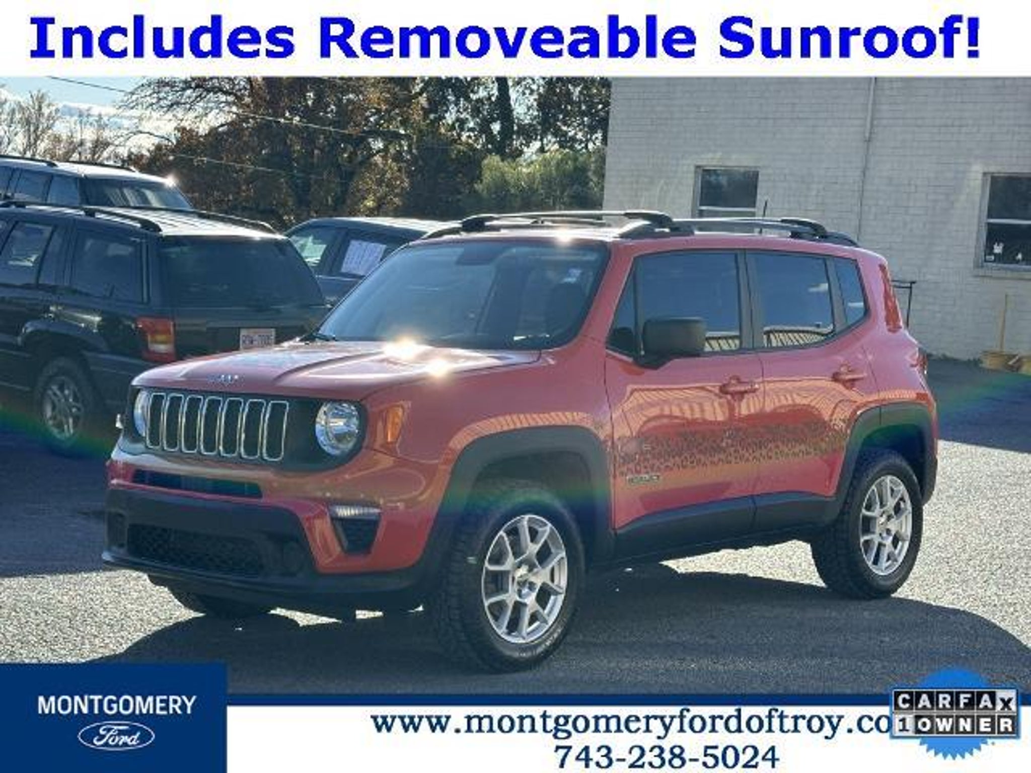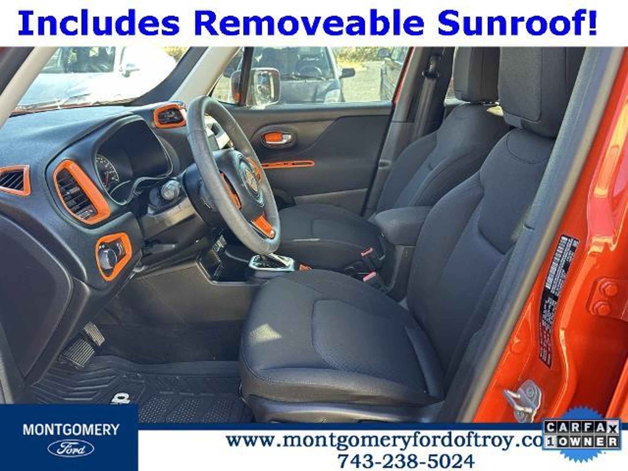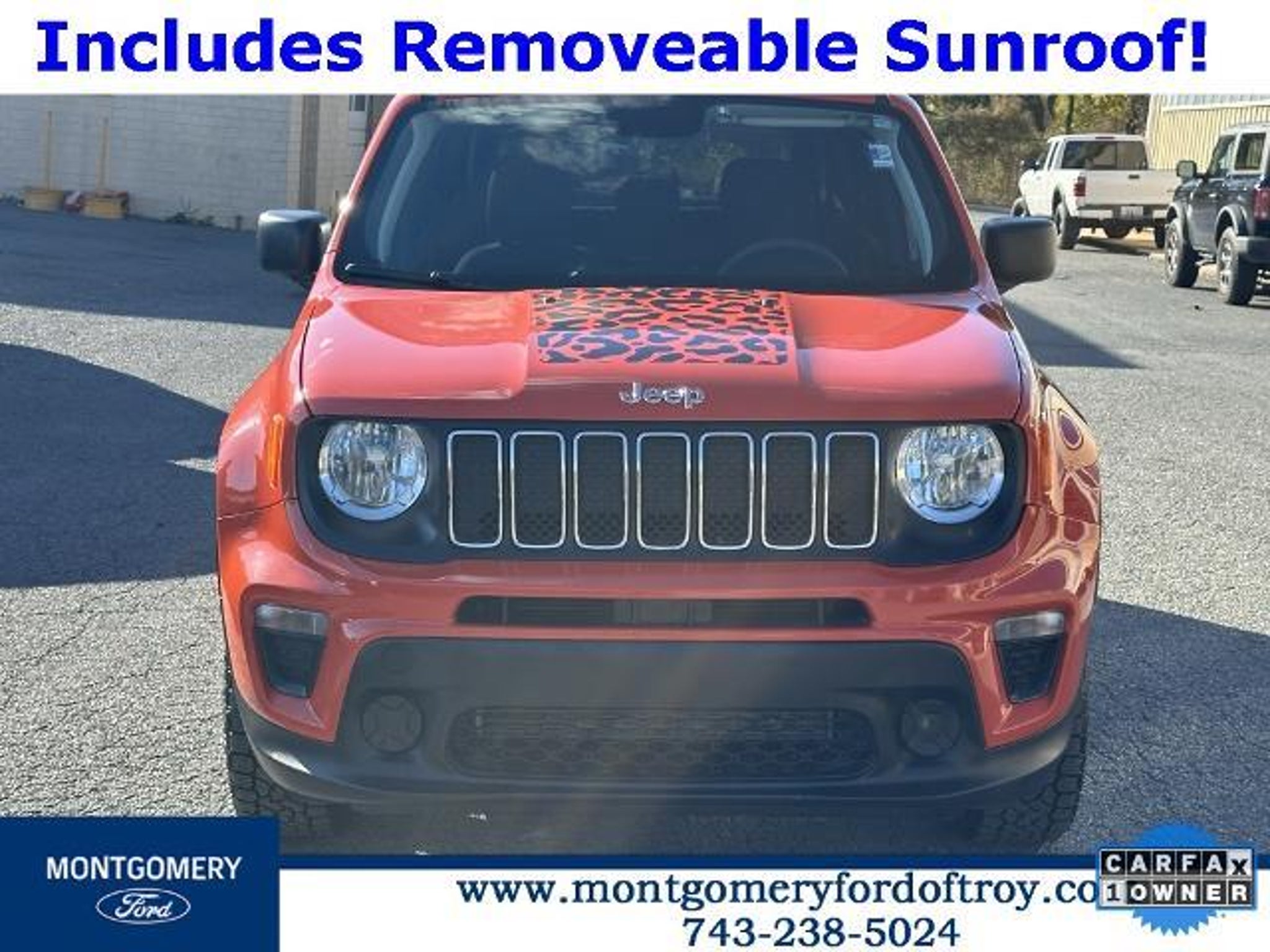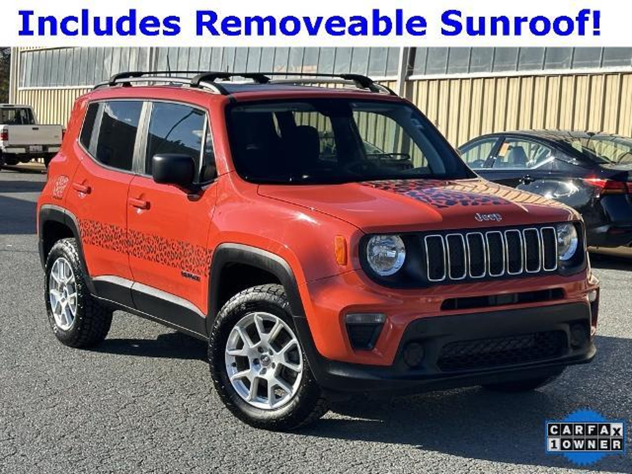 Omaha Orange Clearcoat 2020 Jeep Renegade Sport FWD CARFAX One-Owner. Passive Entry Remote Start Package (Keyless Entry w/Panic Alarm and Remote Start System), Quick Order Package 2XA, Sport Appearance Group (17 x 7.0 Aluminum Wheels, Black Side Roof Rails, and Deep Tint Sunscreen Glass), 1 Year Trial (Registration Required), 16 x 6.5 Styled Steel Wheels, 3.734 Final Drive Ratio, 4-Wheel Disc Brakes, 6 Speakers, ABS brakes, Air Conditioning, AM/FM radio, Anti-whiplash front head restraints, Brake assist, Cloth Low-Back Bucket Seats, Compass, Connectivity (Bridge Solution) (DISC), Delay-off headlights, Driver door bin, Driver vanity mirror, Dual front impact airbags, Dual front side impact airbags, Electronic Stability Control, Emergency communication system, Four wheel independent suspension, Front anti-roll bar, Front Bucket Seats, Front Center Armrest, Front reading lights, Global Telematics Box Module (TBM) (DISC), Heated door mirrors, Illuminated entry, Knee airbag, Low tire pressure warning, My Sky Power/Removable Sunroof, Normal Duty Suspension, Occupant sensing airbag, Outside temperature display, Overhead airbag, Panic alarm, ParkView Rear Back-Up Camera, Passenger door bin, Passenger vanity mirror, Power door mirrors, Power steering, Power windows, Radio data system, Radio: Uconnect 3 w/5 Display, Rear anti-roll bar, Rear window defroster, Rear window wiper, Remote keyless entry, Speed control, Split folding rear seat, Spoiler, Steering wheel mounted audio controls, Tachometer, Telescoping steering wheel, Tilt steering wheel, Traction control, Trip computer, Variably intermittent wipers, and Voltmeter.