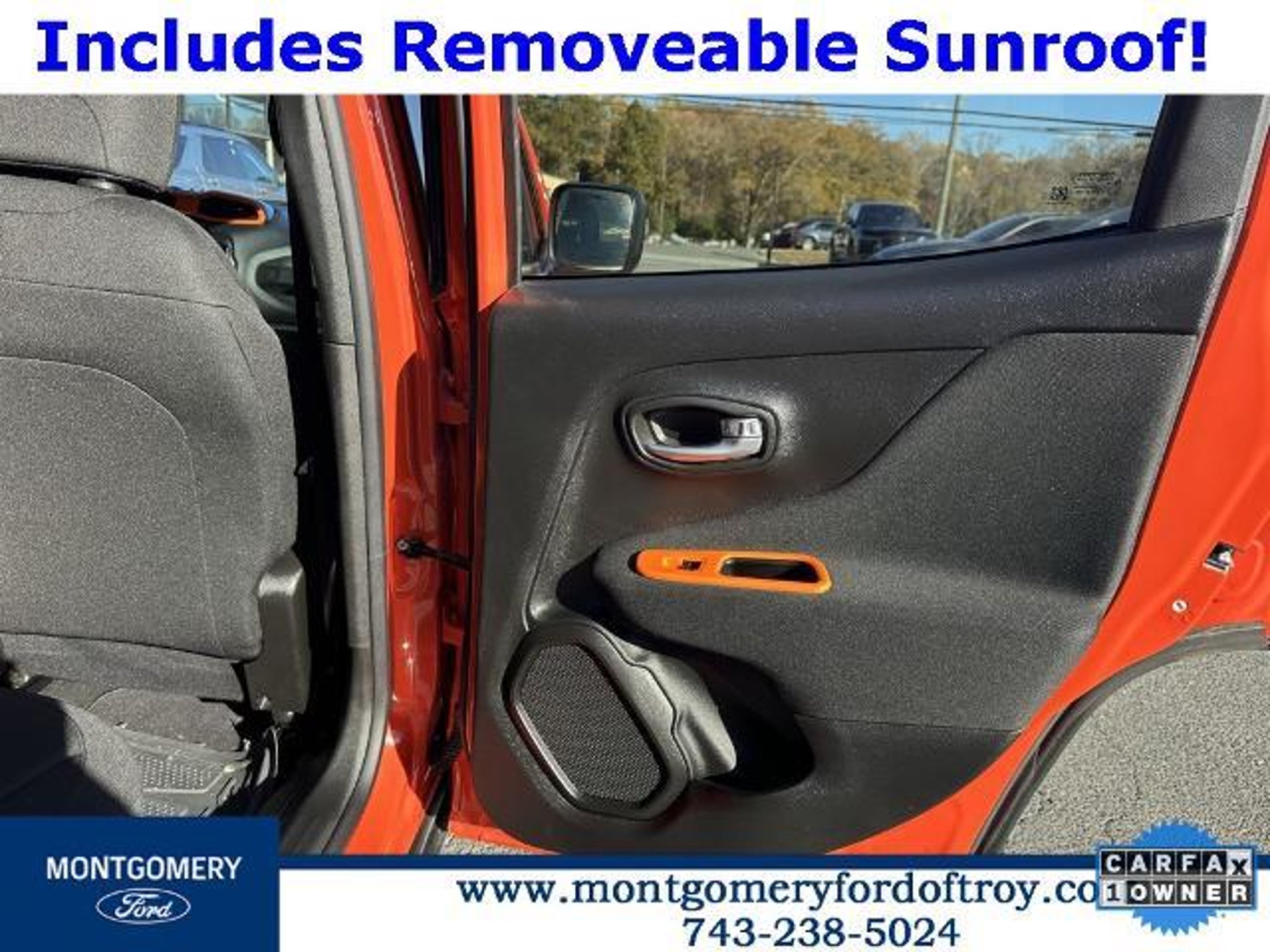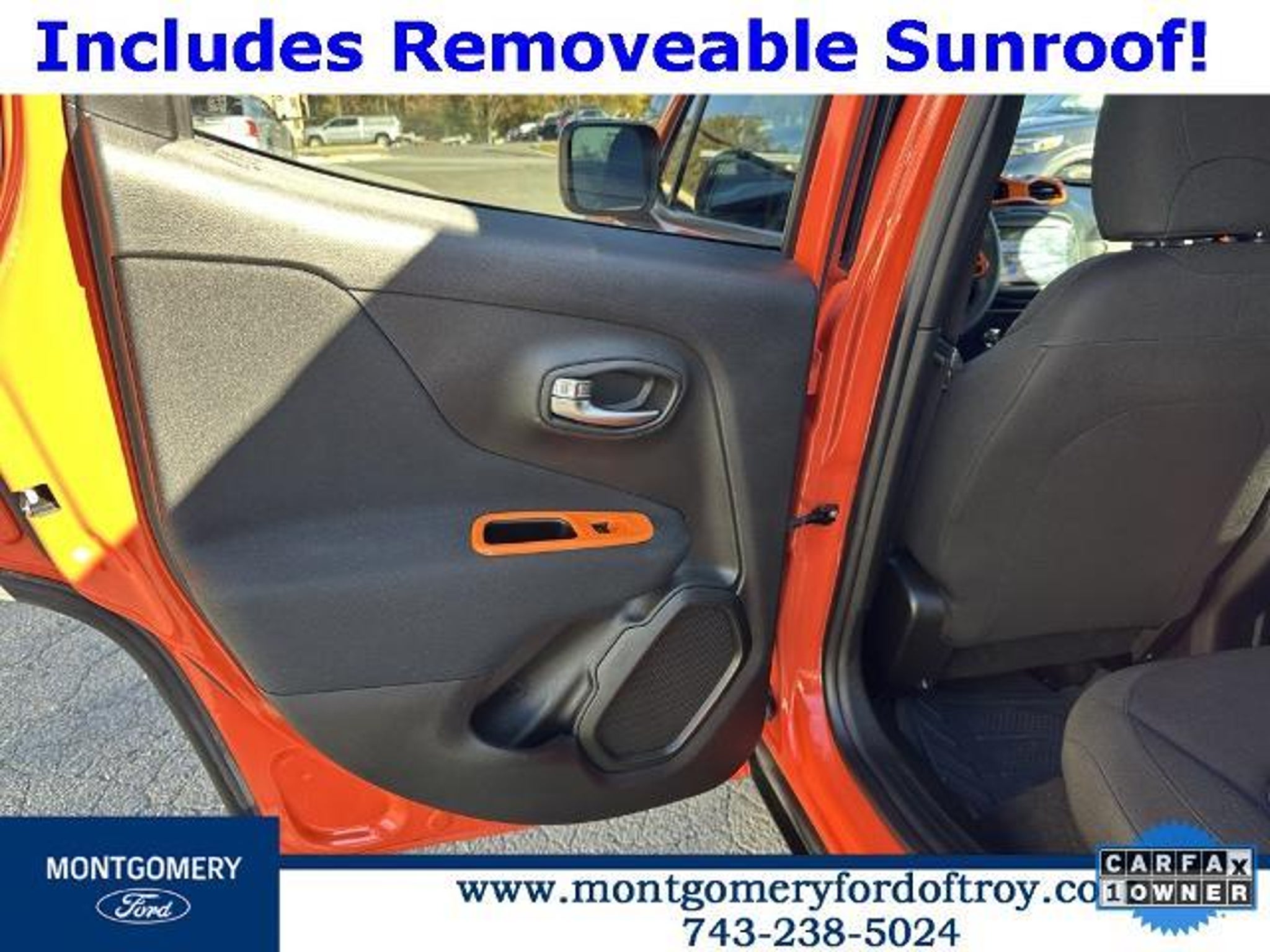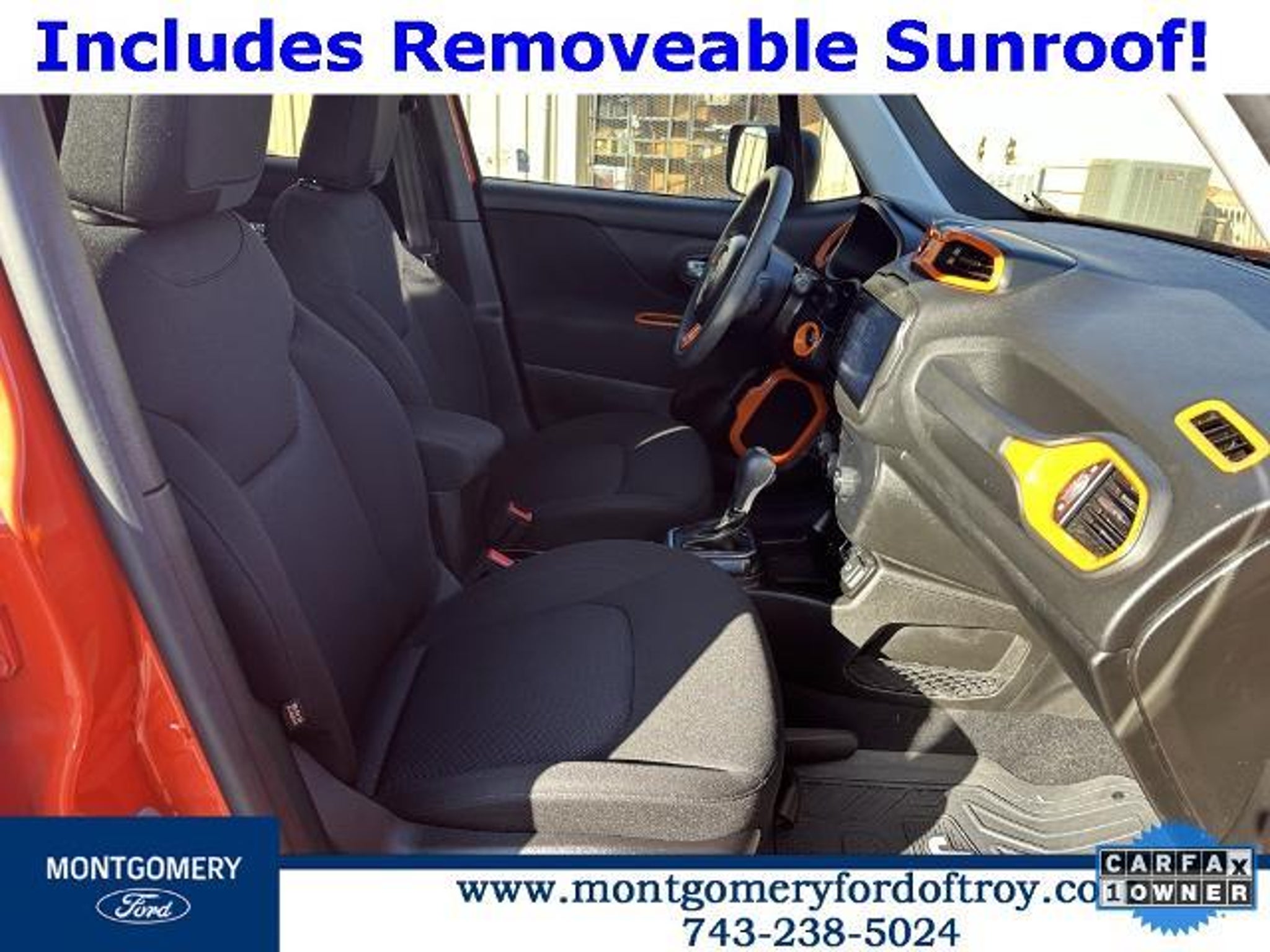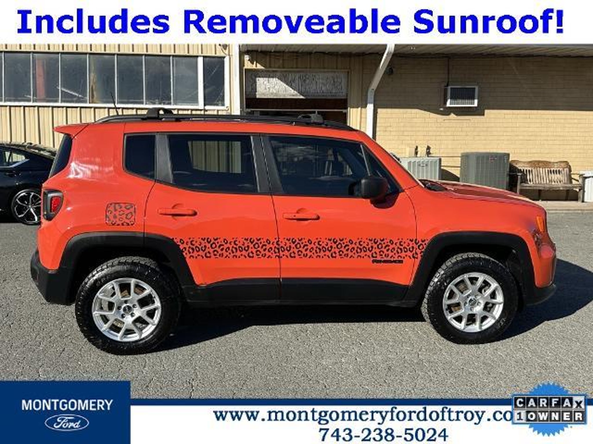Omaha Orange Clearcoat 2020 Jeep Renegade Sport FWD CARFAX One-Owner. Passive Entry Remote Start Package (Keyless Entry w/Panic Alarm and Remote Start System), Quick Order Package 2XA, Sport Appearance Group (17 x 7.0 Aluminum Wheels, Black Side Roof Rails, and Deep Tint Sunscreen Glass), 1 Year Trial (Registration Required), 16 x 6.5 Styled Steel Wheels, 3.734 Final Drive Ratio, 4-Wheel Disc Brakes, 6 Speakers, ABS brakes, Air Conditioning, AM/FM radio, Anti-whiplash front head restraints, Brake assist, Cloth Low-Back Bucket Seats, Compass, Connectivity (Bridge Solution) (DISC), Delay-off headlights, Driver door bin, Driver vanity mirror, Dual front impact airbags, Dual front side impact airbags, Electronic Stability Control, Emergency communication system, Four wheel independent suspension, Front anti-roll bar, Front Bucket Seats, Front Center Armrest, Front reading lights, Global Telematics Box Module (TBM) (DISC), Heated door mirrors, Illuminated entry, Knee airbag, Low tire pressure warning, My Sky Power/Removable Sunroof, Normal Duty Suspension, Occupant sensing airbag, Outside temperature display, Overhead airbag, Panic alarm, ParkView Rear Back-Up Camera, Passenger door bin, Passenger vanity mirror, Power door mirrors, Power steering, Power windows, Radio data system, Radio: Uconnect 3 w/5 Display, Rear anti-roll bar, Rear window defroster, Rear window wiper, Remote keyless entry, Speed control, Split folding rear seat, Spoiler, Steering wheel mounted audio controls, Tachometer, Telescoping steering wheel, Tilt steering wheel, Traction control, Trip computer, Variably intermittent wipers, and Voltmeter.