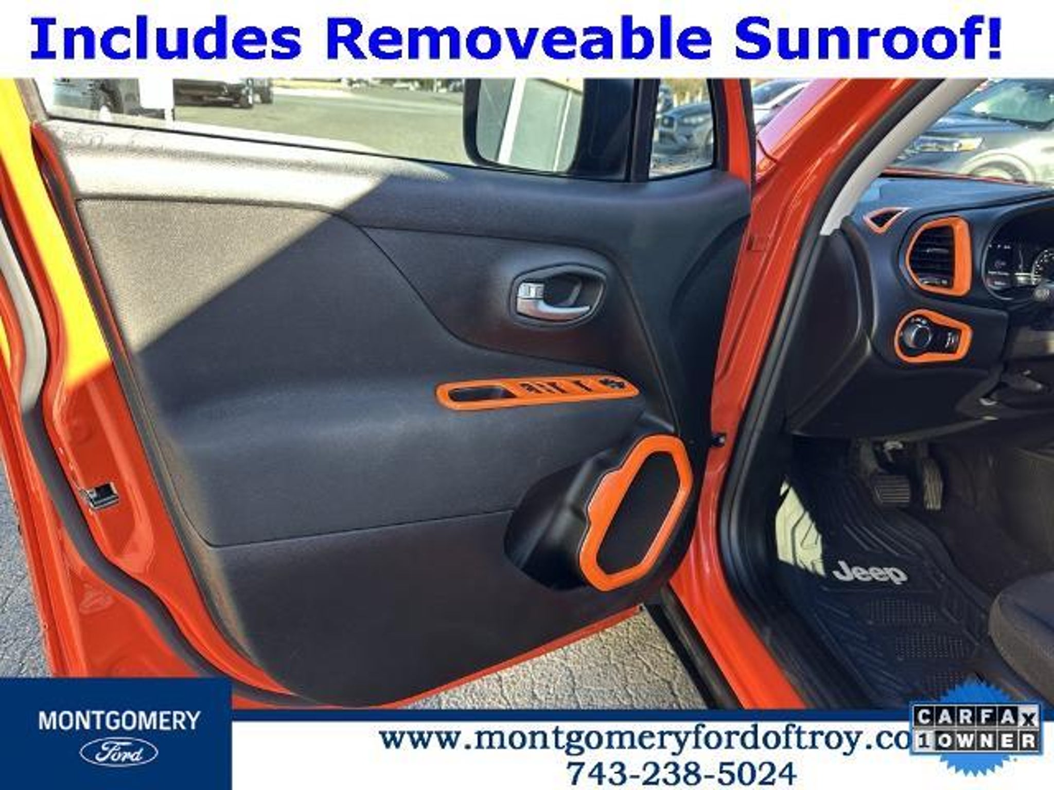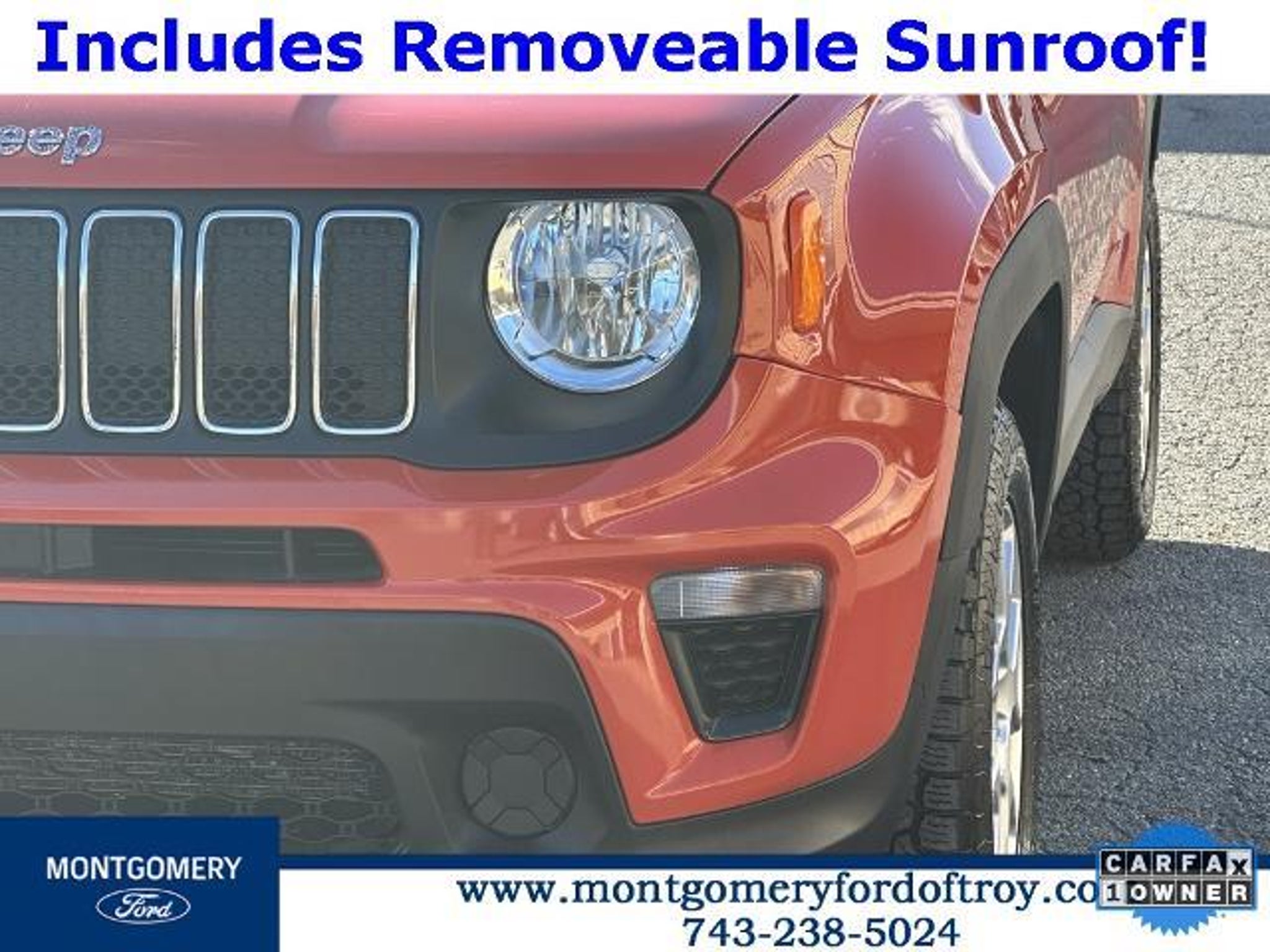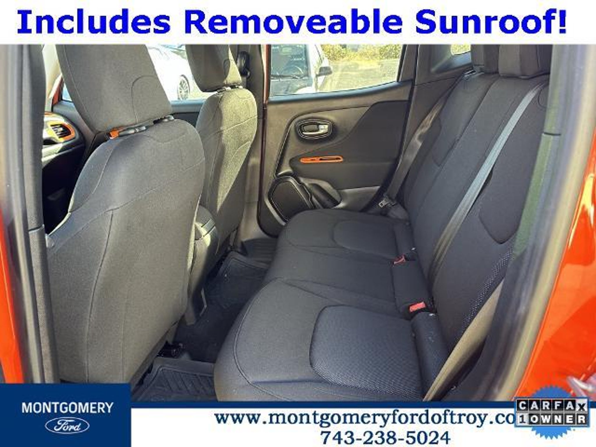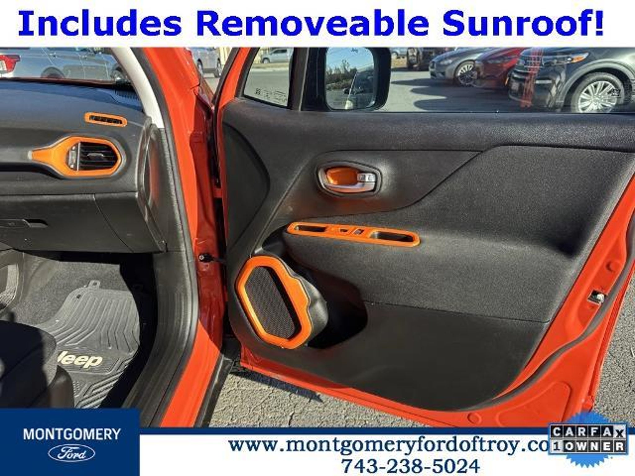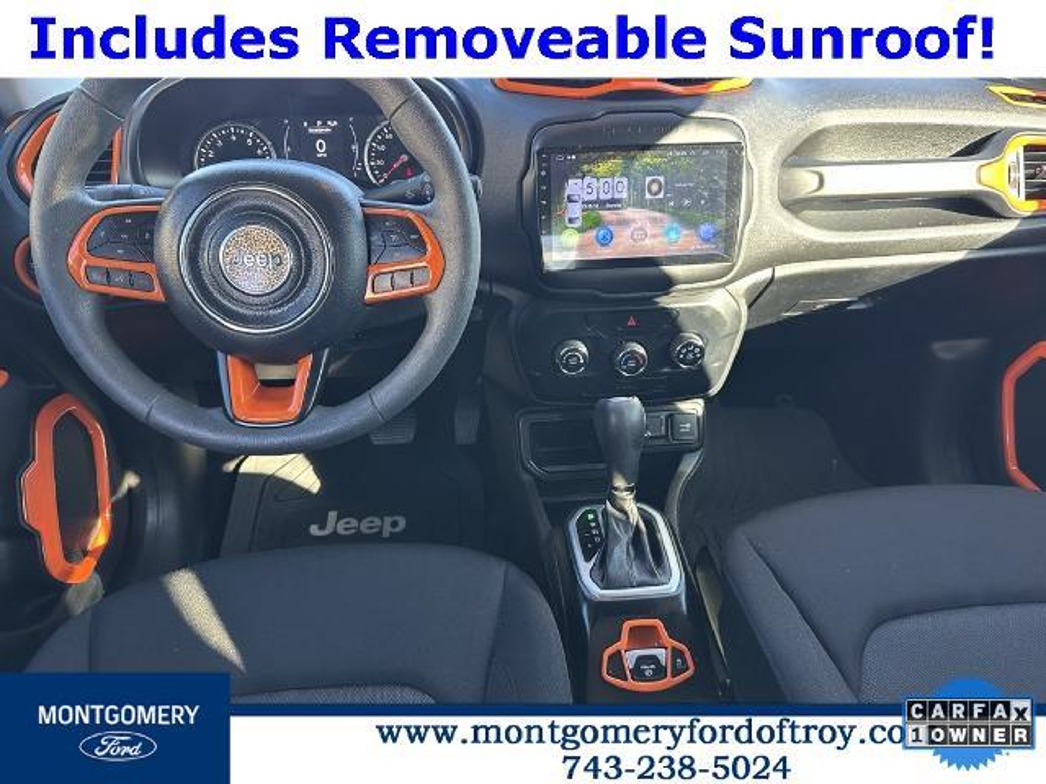 Omaha Orange Clearcoat 2020 Jeep Renegade Sport FWD CARFAX One-Owner. Passive Entry Remote Start Package (Keyless Entry w/Panic Alarm and Remote Start System), Quick Order Package 2XA, Sport Appearance Group (17 x 7.0 Aluminum Wheels, Black Side Roof Rails, and Deep Tint Sunscreen Glass), 1 Year Trial (Registration Required), 16 x 6.5 Styled Steel Wheels, 3.734 Final Drive Ratio, 4-Wheel Disc Brakes, 6 Speakers, ABS brakes, Air Conditioning, AM/FM radio, Anti-whiplash front head restraints, Brake assist, Cloth Low-Back Bucket Seats, Compass, Connectivity (Bridge Solution) (DISC), Delay-off headlights, Driver door bin, Driver vanity mirror, Dual front impact airbags, Dual front side impact airbags, Electronic Stability Control, Emergency communication system, Four wheel independent suspension, Front anti-roll bar, Front Bucket Seats, Front Center Armrest, Front reading lights, Global Telematics Box Module (TBM) (DISC), Heated door mirrors, Illuminated entry, Knee airbag, Low tire pressure warning, My Sky Power/Removable Sunroof, Normal Duty Suspension, Occupant sensing airbag, Outside temperature display, Overhead airbag, Panic alarm, ParkView Rear Back-Up Camera, Passenger door bin, Passenger vanity mirror, Power door mirrors, Power steering, Power windows, Radio data system, Radio: Uconnect 3 w/5 Display, Rear anti-roll bar, Rear window defroster, Rear window wiper, Remote keyless entry, Speed control, Split folding rear seat, Spoiler, Steering wheel mounted audio controls, Tachometer, Telescoping steering wheel, Tilt steering wheel, Traction control, Trip computer, Variably intermittent wipers, and Voltmeter.