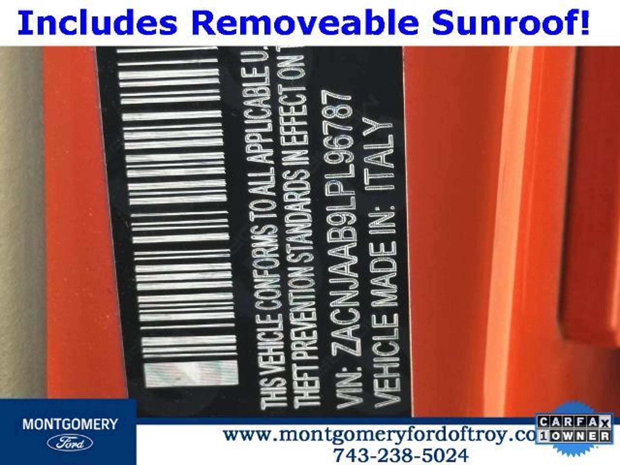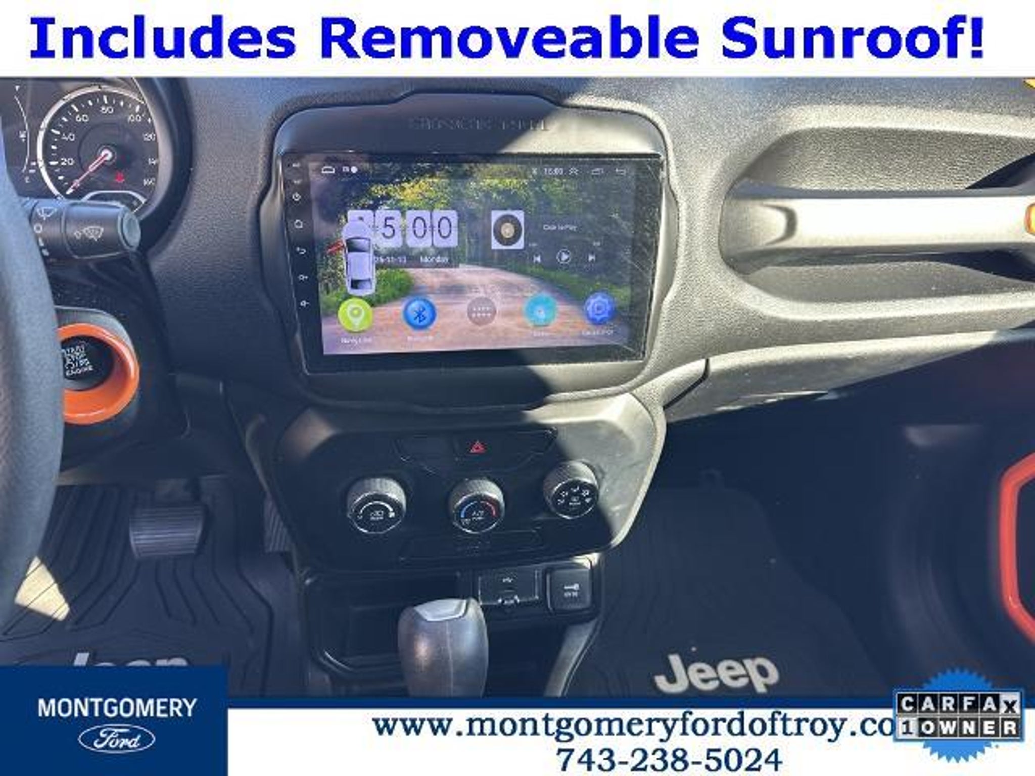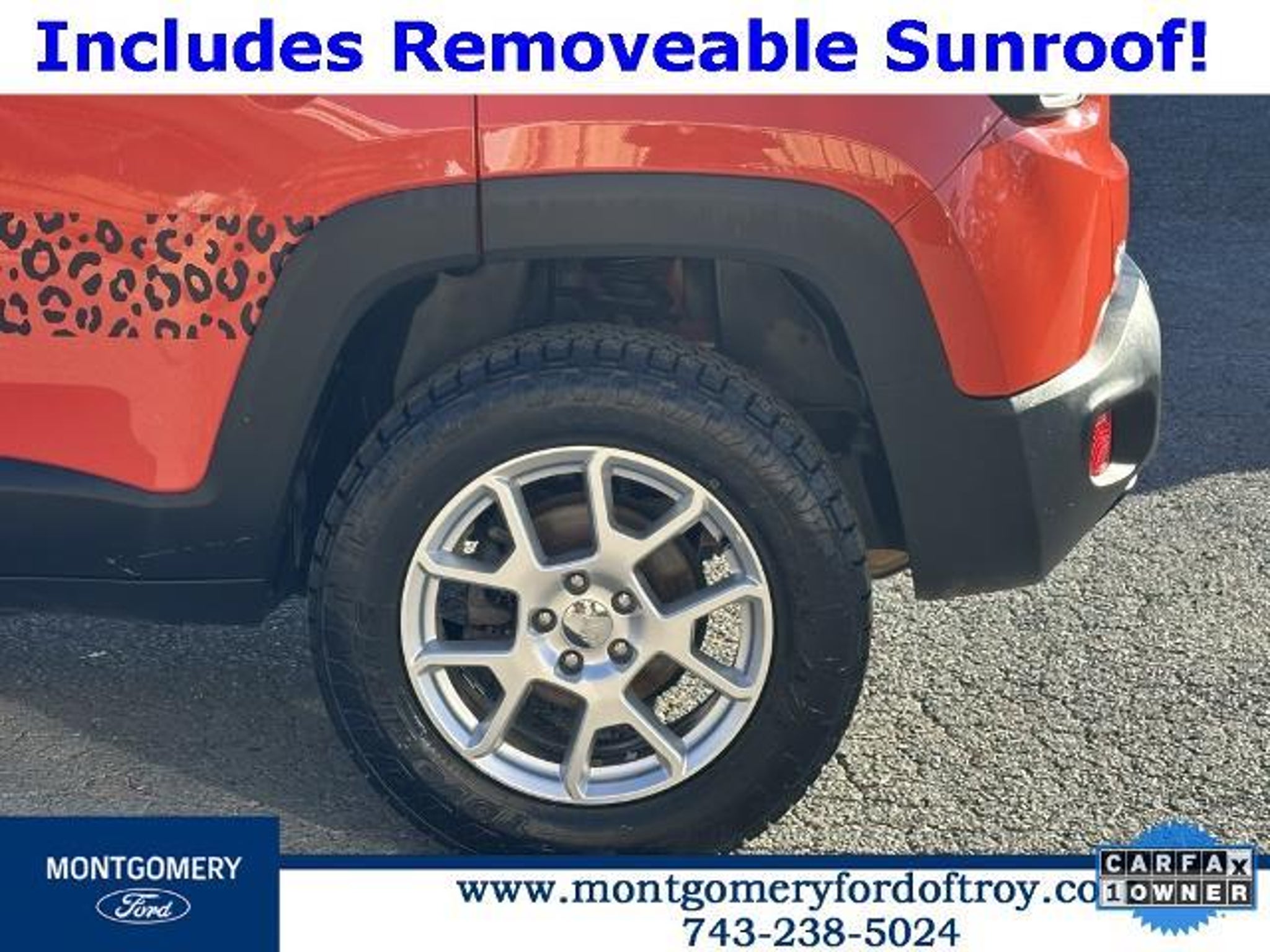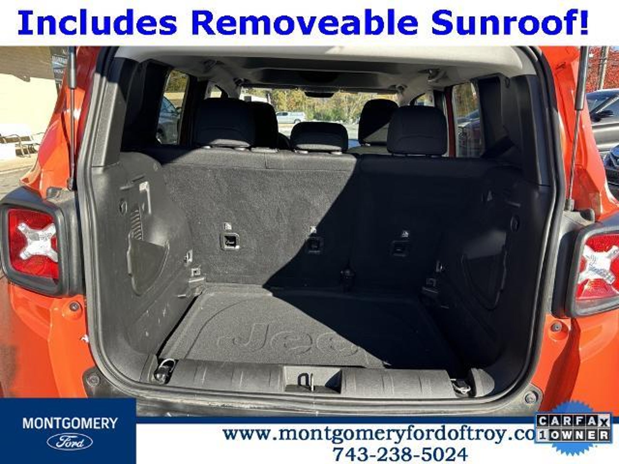 Omaha Orange Clearcoat 2020 Jeep Renegade Sport FWD CARFAX One-Owner. Passive Entry Remote Start Package (Keyless Entry w/Panic Alarm and Remote Start System), Quick Order Package 2XA, Sport Appearance Group (17 x 7.0 Aluminum Wheels, Black Side Roof Rails, and Deep Tint Sunscreen Glass), 1 Year Trial (Registration Required), 16 x 6.5 Styled Steel Wheels, 3.734 Final Drive Ratio, 4-Wheel Disc Brakes, 6 Speakers, ABS brakes, Air Conditioning, AM/FM radio, Anti-whiplash front head restraints, Brake assist, Cloth Low-Back Bucket Seats, Compass, Connectivity (Bridge Solution) (DISC), Delay-off headlights, Driver door bin, Driver vanity mirror, Dual front impact airbags, Dual front side impact airbags, Electronic Stability Control, Emergency communication system, Four wheel independent suspension, Front anti-roll bar, Front Bucket Seats, Front Center Armrest, Front reading lights, Global Telematics Box Module (TBM) (DISC), Heated door mirrors, Illuminated entry, Knee airbag, Low tire pressure warning, My Sky Power/Removable Sunroof, Normal Duty Suspension, Occupant sensing airbag, Outside temperature display, Overhead airbag, Panic alarm, ParkView Rear Back-Up Camera, Passenger door bin, Passenger vanity mirror, Power door mirrors, Power steering, Power windows, Radio data system, Radio: Uconnect 3 w/5 Display, Rear anti-roll bar, Rear window defroster, Rear window wiper, Remote keyless entry, Speed control, Split folding rear seat, Spoiler, Steering wheel mounted audio controls, Tachometer, Telescoping steering wheel, Tilt steering wheel, Traction control, Trip computer, Variably intermittent wipers, and Voltmeter.