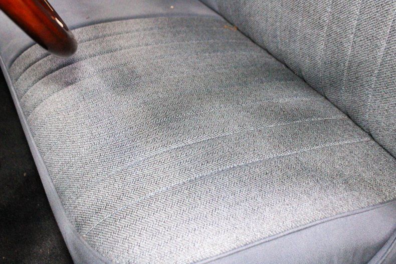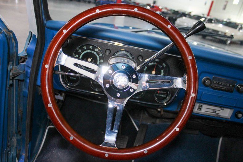 Inside, the cabin maintains a classic and comfortable feel with a blue cloth bench seat and a custom wooden steering wheel that adds warmth and character. The simple, driver-focused layout retains the charm of the original design, while the clean presentation shows the care and attention put into this build.