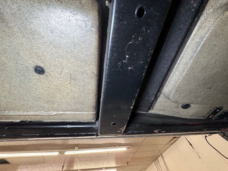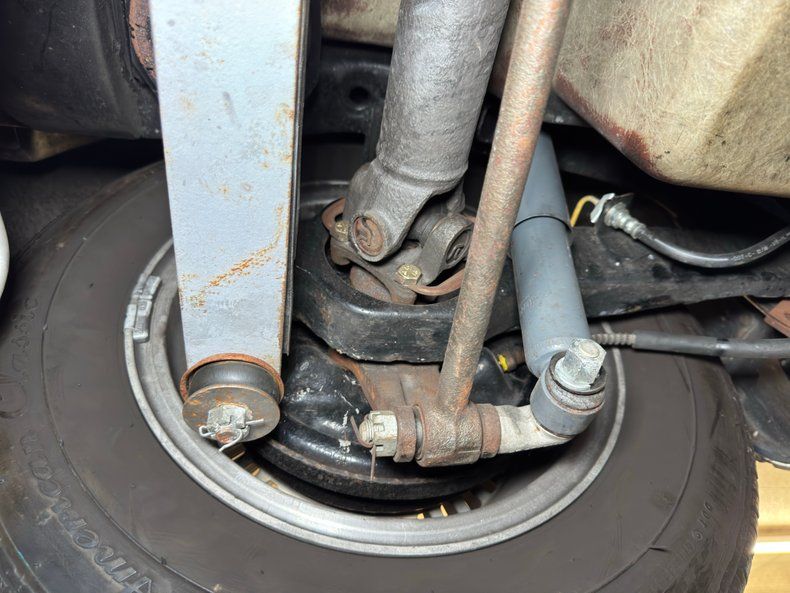 Clean underneath with the only diversion being some oil drift. Newer brakes are onboard and they are power drums at all four wheels where the tires have a mid 2019 date code. The Gardner dual exhaust system runs through their stock style mufflers stenciled with Off Road Assy as original, and exiting as noted through the valance. Suspension consists of coil springs up front and the rear has a frame anchored three link system with transverse strut rods and leaf spring.