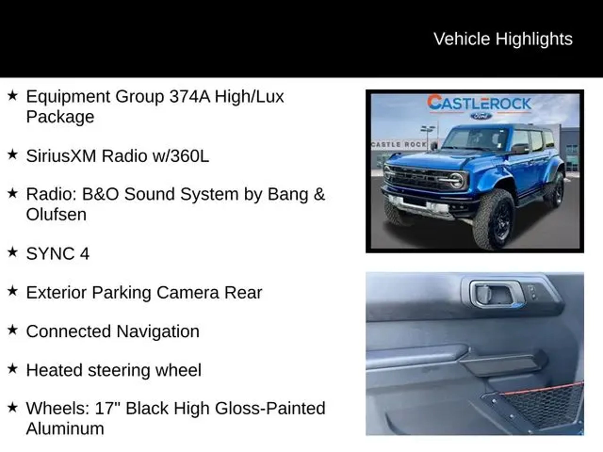 Discover the thrilling power and refined style of the 2024 Ford Bronco Raptor Certified Pre-Owned. This exceptional off-road beast is ready to elevate your driving experience with its uncompromising performance and premium features. Meticulously inspected and backed by Ford's rigorous certification process, this Bronco Raptor boasts an impressive array of standout attributes: ? Carfax No Accidents ? Equipment Group 374A High/Lux Package ? Navigation system: Connected Navigation ? Convertible HardTop ? Radio: B&O Sound System by Bang & Olufsen ? SiriusXM Radio w/360L ? SYNC 4 ? Exterior Parking Camera Rear ? Connected Navigation ? Heated steering wheel ? Wheels: 17 Black High Gloss-Painted Aluminum Powered by a potent 3.0L EcoBoost V6 engine and equipped with a capable 10-speed automatic transmission and 4-wheel drive, this Bronco Raptor delivers unparalleled off-road prowess and on-road confidence. With an impressive towing capacity and exceptional ground clearance, it's ready to conquer any terrain with ease. As a Certified Pre-Owned vehicle, this Bronco Raptor has undergone a rigorous 172-point inspection and comes with a comprehensive warranty, giving you the peace of mind of owning a like-new vehicle. The stunning blue exterior, complemented by the premium interior features, creates a bold and refined presence that is sure to turn heads wherever you go. Imagine the thrill of commanding the open road or exploring the untamed wilderness in this exceptional Bronco Raptor. With its impressive performance, advanced technology, and uncompromising build quality, this Certified Pre-Owned gem is the ultimate adventure companion. Experience the power, capability, and style of the 2024 Ford Bronco Raptor Certified Pre-Owned. Visit our showroom today and let us demonstrate how this exceptional vehicle can elevate your driving experience to new heights.