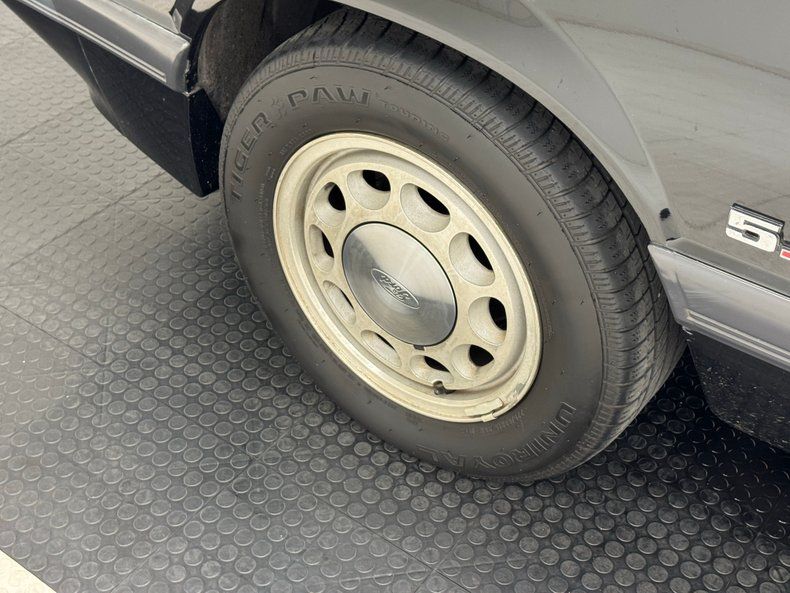 A solid black stallion with features an abbreviated grille integrated into the fascia, flanked by dual headlights over a chin spoiler with fog lights. A wide charcoal stripe on the hood's center sets the GT apart as well, along with the 15-inch Ford 10-hole wheels, branded side body molding, and bevel cut dual exhaust out back. It's here where you'll find a luggage rack on the decklid followed by distinct horizontal tail lights, iterations of which would hang around until 1993. The black canvas soft top is in nice condition and the plastic window is crisp and clear. The piece de resistance of course, is the now legendary 5.0 emblem on the front fenders, worn like a coveted badge of honor back in the day. Imperfections include rock chips up front, a scuff on the bumper, and oxidation of the wheels.