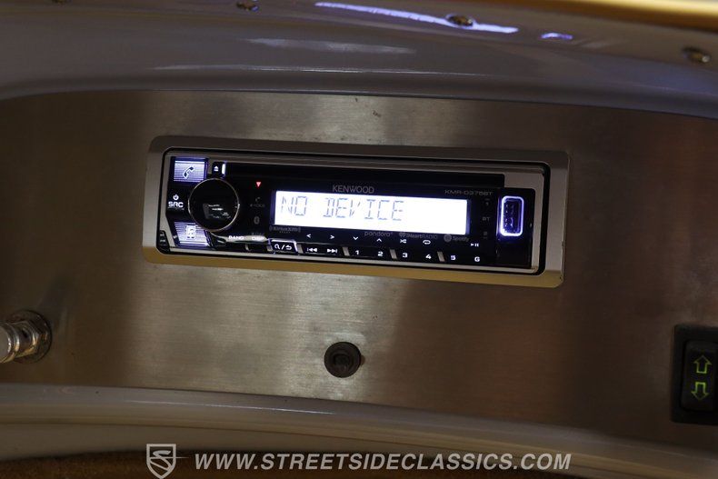 The accompanying interior is equally impressive and, despite a convertible's penchant for UV exposure. The leather-clad bench seat shows only the slightest of wear, and the door panels it's bracketed by are in matching condition. Should you find yourself out on the road as the weather becomes more unforgiving, the tan canvas convertible top fits snugly and features a nice, clear window. Inside the cleanly painted dash area, you'll find an assembly of aftermarket gauges recessed into the instrument cluster to keep tabs on your motoring functions, and there's a Kenwood AM/FM/DVD stereo with both Bluetooth and satellite connectivity on hand to provide a wide range of audio options.