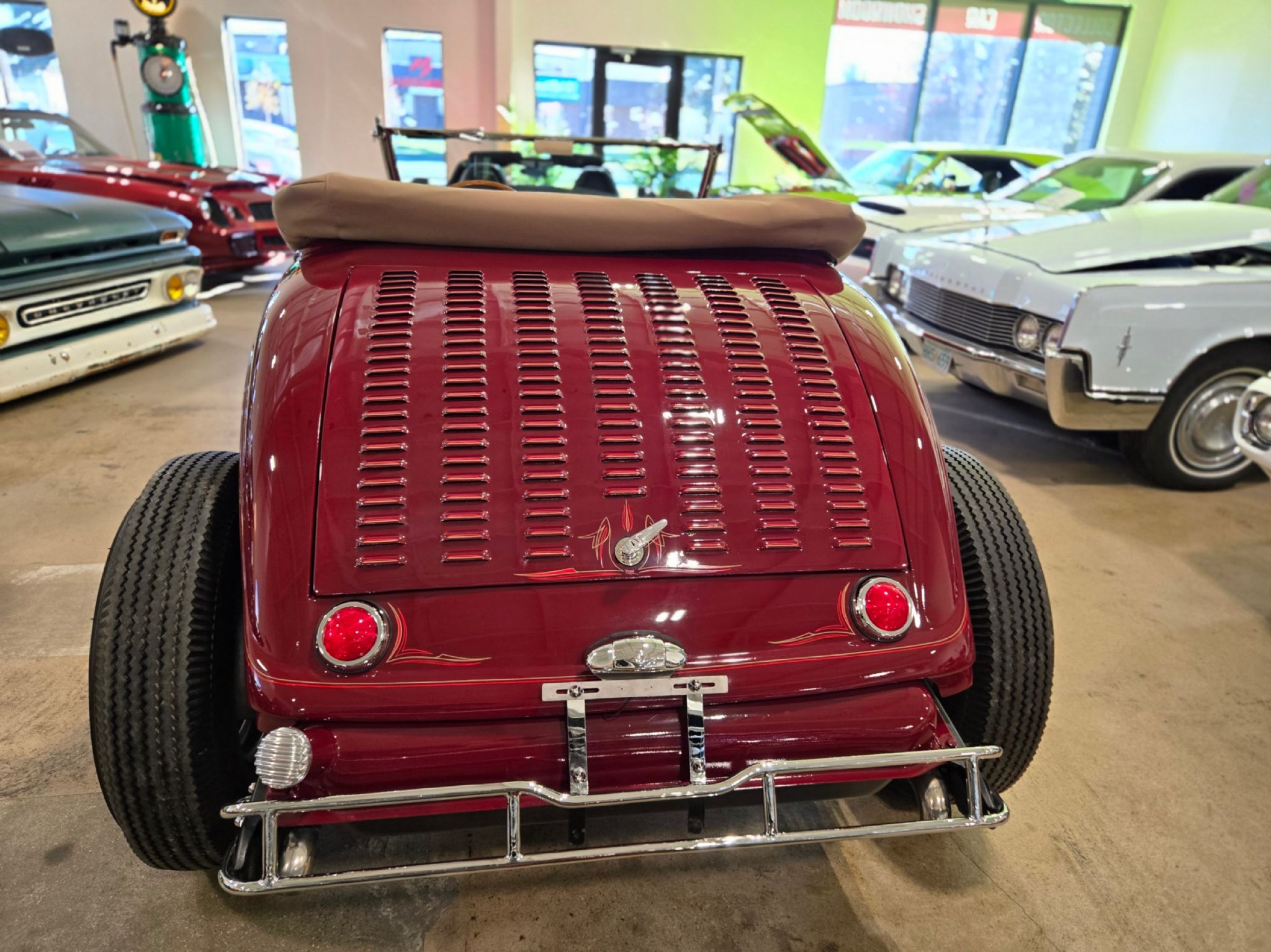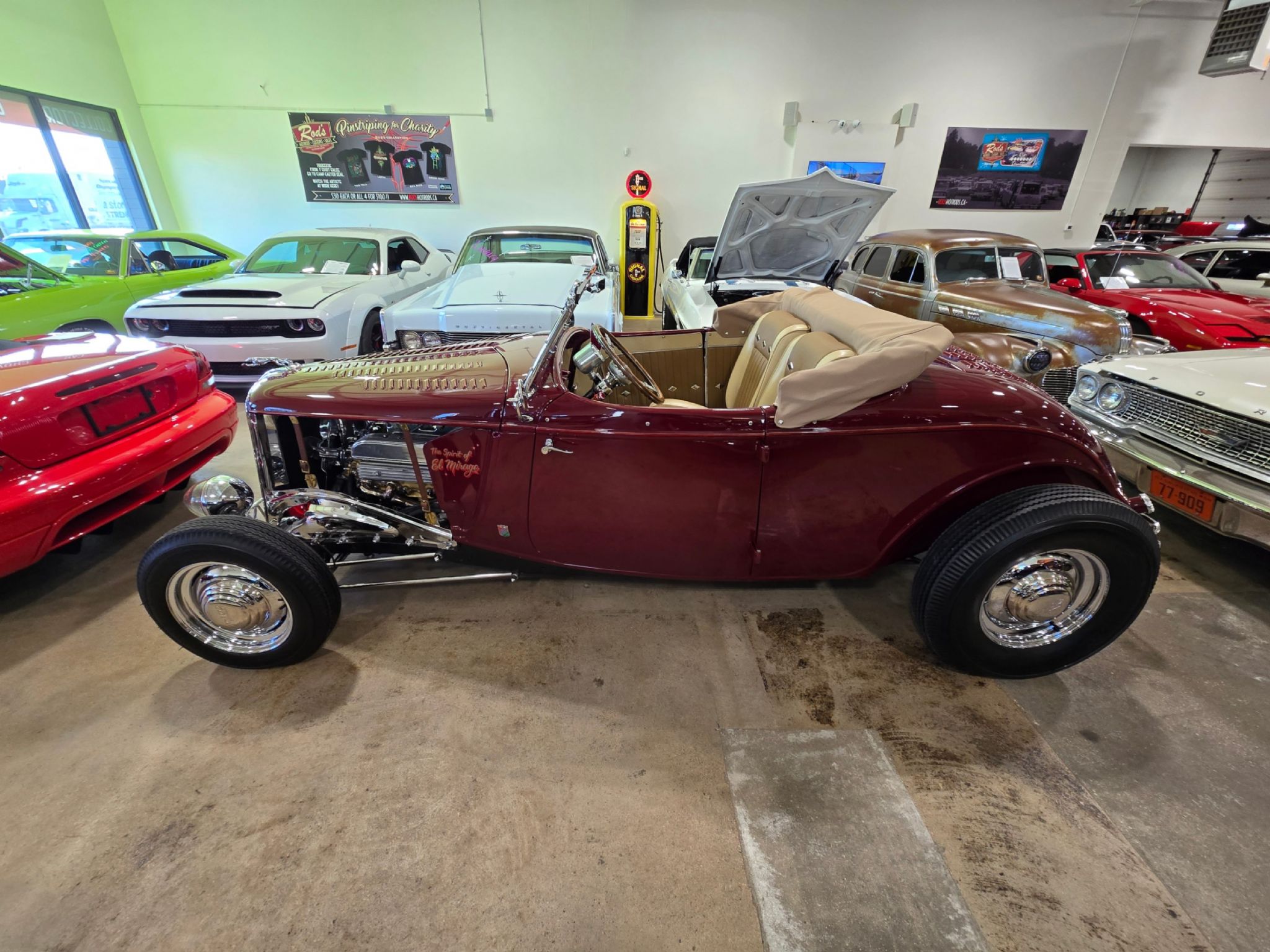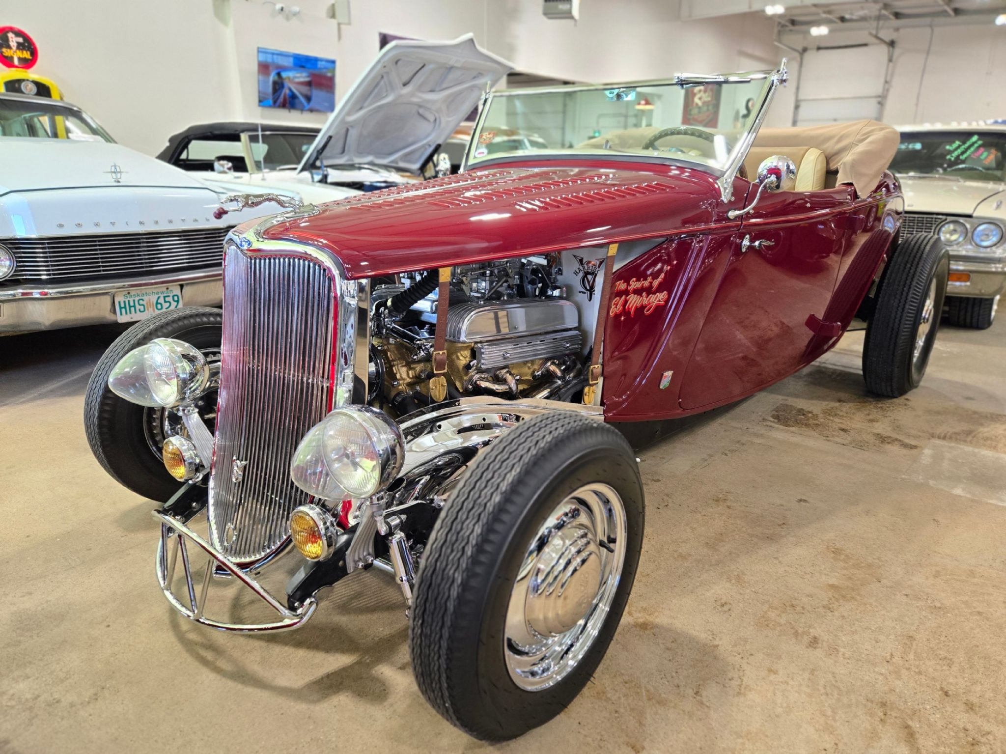 1933 Ford Model 40 all steel roadster named The Spirit of El Mirage. One spectacular award-winning build done to look like it could have been completely 1955-1957 era and named after the El Mirage Salt flats. Yes, its all Henry Ford steel with lots of customization. Under the hood is a 1955 Buick 322 Nail-head V8 with extensive show chrome, Offenhauser intake and valve covers with dual quad carbs. Most every piece of the engine other than the heads and block are polished aluminum or show chrome. Under the car is a 5 dropped Magnum tube front axle show chromed by Cambridge Custom Chrome. Right now, theres a Flaming river Vega steering box. There are chromed shocks and springs front and rear with transvers traditional springs front and rear also chromed. On the front axle are SoCal custom imitation Buick finned aluminum brake drum kit that hide aluminum 4-piston calipers and rotors. The driveshaft, yoke and cross members under the car are also chromed. Theres a polished finned aluminum rear end cover on an 8.8 Ford rear end. Behind that nail head lies a freshly rebuilt TH-350 with shift kit and 2800 stall converter. Chrome re-pop 1940s Ford wheels with 42 Ford hubcaps wear brand new Coker Firestone Gum Dipper rubber on each corner. On top is a custom-made convertible top in a 33/34 style that functions properly and has decent head room, a zip out rear window, custom boot cover, hold downs and snap-on side curtains just in case of cold or rain. The top including framework cost over 7000$ alone to build. Theres extensive custom louver work on the hood and trunk lid. The car features custom made 50s nerf bumpers front and rear with show quality chrome and a re-chromed 1957 Dominion license plate light originally made in Toronto ON. Out front youll find a pair of hard bubble headlight covers that are so rare, theyre the only pair known to exist from the company that stopped making them in 1959. When the windshield was laid back for a real hot rod look, extensive custom work was required to fill the gap properly below the glass. The grill is a REAL 1933 Ford grill thats been re-chromed. Its worth thousands on its own! Out back are 1950 Pontiac taillights now with LED bulbs The interior is just as nice as the rest with custom leather tuck and roll upholstery, cut down 1951 Mercury door panels and 1800s Amish horse harness diamonds. Theres SoCal gauges along with new old stock 1957 Smiths Stainless steel cup tachometer mounted on a polished stainless 56 F100 replica steering column. 1950s Laminated Plexi tear drop shaped switch knobs and transmission shifter knob are matching. Thats on top of a Lokar nostalgia shifter and E-brake handle. All gauges work and theres a Vintage Air heater installed behind the rear of the seats. Every aspect of this car was truly thought about from the perspective of building a hot rod like would have been done in the mid to late 50s. To top it all off, the Spirit of El Mirage won best street rod in the 2024 Granby international car show in Quebec (largest show in Canada), as well as best street rod engine, first time shown, and runner up in a class of 15 top builds in the 2025 Toronto Motorama car show. The car is incredible from every angle, a clearly was a huge investment by the builder. Its now available for a fraction of the cost to put it together. Dont miss an opportunity to own a truly one-of-a-kind hot rod! Theres just over 300 miles on the car since it's completion.