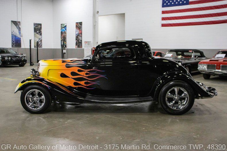 GR Auto Gallery is pleased to present this custom 1934 Ford 3-Window Coupe for your consideration. This stunning street rod features a Black exterior accented with painted flames over a Gray custom interior, showing just 9,645 miles since the build was completed. Power comes from a 383 stroker cubic inch V8, paired to a TH350 automatic transmission, and geared through a Ford 9-inch rear end with 3.50 gears. This '34 Coupe rides on an Outlaw body and Outlaw chassis, and comes equipped with an impressive list of features including: Boyd Coddington wheels, disc front brakes, 750 cfm Holley carburetor, MSD pro billet distributor, Blaster 2 coil Taylor wires, Vintage Air air conditioning, new Edelbrock intake, fresh bearing seals on whole axle, power windows, new rear drum brakes, new housings, Corvette styler power brakes, dual Flowmaster exhaust, an overhead lighted console, upgraded sound system, Vintage gauges, wood interior trim accents, and classic suicide doors. This Coupe has been well cared for, tastefully built, and is absolutely ready to cruise. Drive this one out of our showroom or have us assist with shipping it to you anywhere in the United States! Don't hesitate to call us with any questions or for more information.