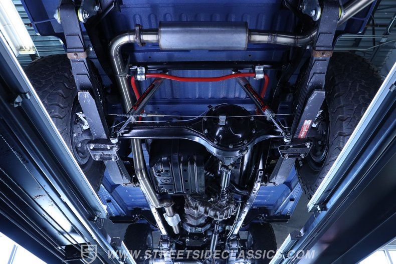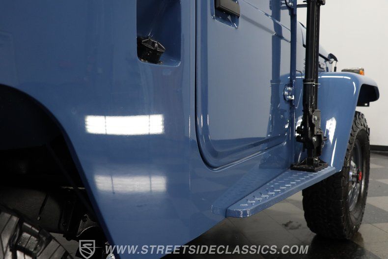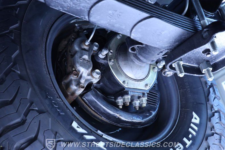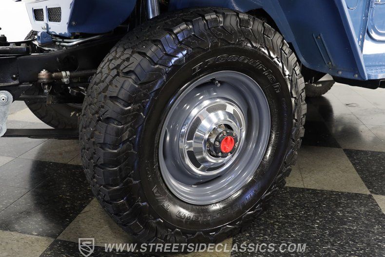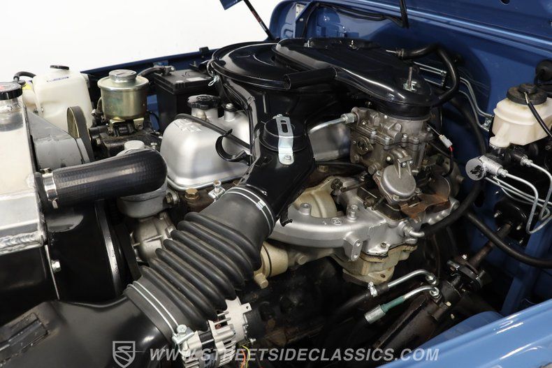 Under the hood, this Land Cruiser houses a robust 4.2L inline six-cylinder engine, paired with a smooth-shifting 5-speed manual transmission. The engine bay shines with fresh blue paint, continuing the exterior's theme, and features a single 2-barrel carburetor, factory-style intake and exhaust manifolds, and an upgraded aluminum radiator to keep things cool. The drivetrain boasts power brakes with front discs, power steering, and an upgraded suspension with Rough Country shocks, delivering a driving experience that is both commanding and comfortable. This truck is as capable on the road as it is off the beaten path.
