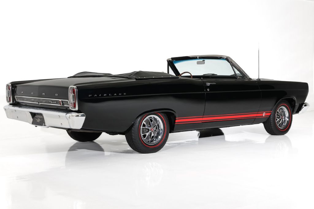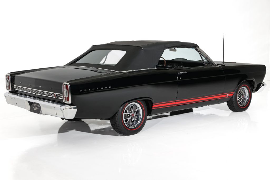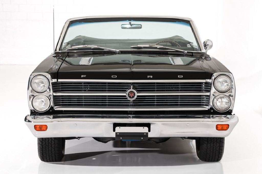 Triple Black Ford Fairlane GT 390 Convertible with new black paint, new black power top and black bucket seat and console interior. This rare GT is validated by the 76D body code and powered by its original S-Code 390 cubic inch, big block engine and launched in to high gear with the original Top Loader 4-Speed transmission. The 9 inch rear is a very posi locker rear end with a 3.25 gear and will definitely put the rubber to the road. This GT is all muscle car with no power options. Professionally painted mirror finish black paint with new bumpers added and lots of new and original well preserved trim. According to the previous owner, this is an original, 52,000 mile car that has been in a climate controlled environment for most of it life and has registrations to validate the low mileage and an incredibly well preserved time bubble GT with all original factory metal structure. This triple black Ford Fairlane GT convertible is rolling on correct Ford chrome wheels and newer redline radials for that investment grade muscle car curb appeal.