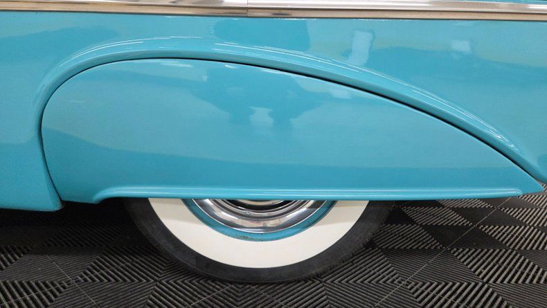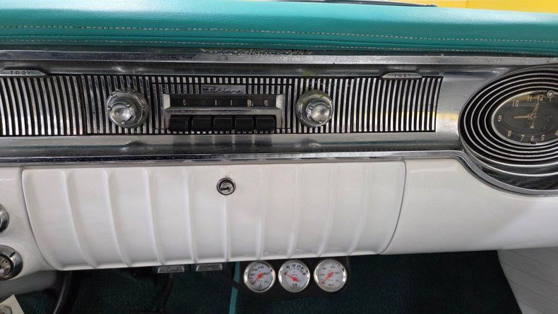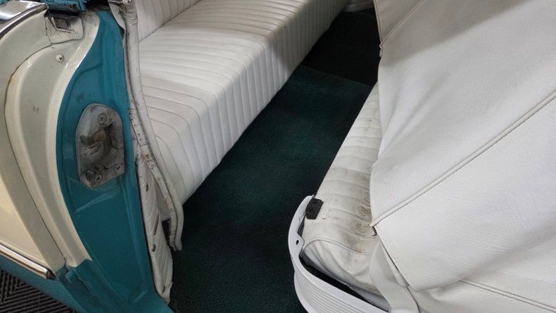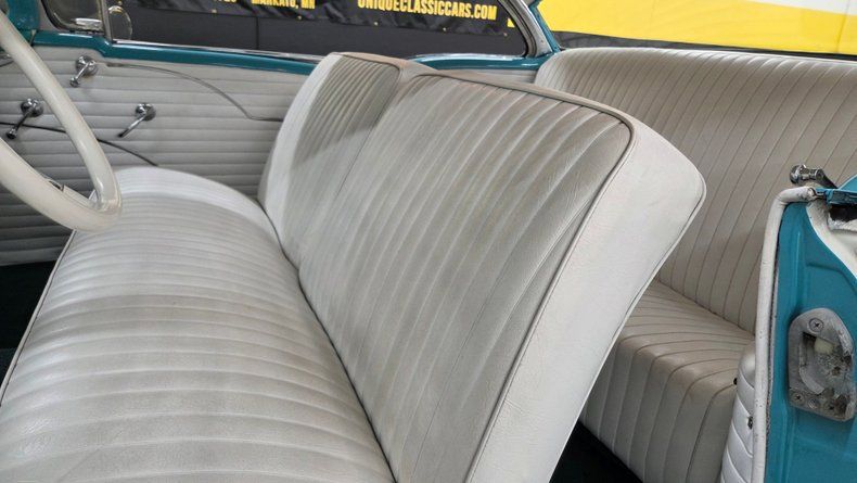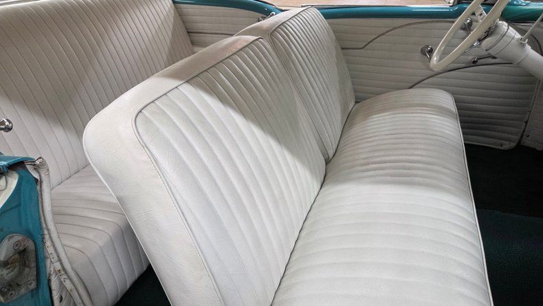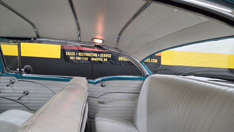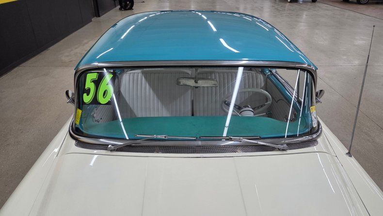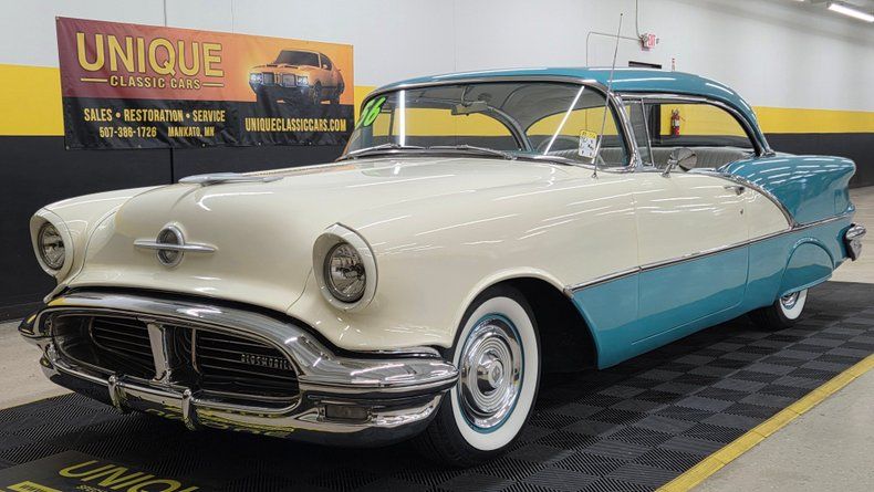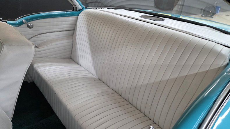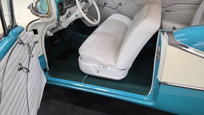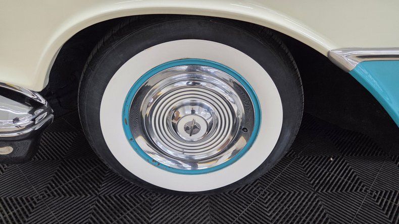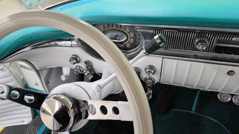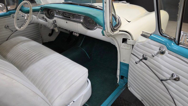 1956 Oldsmobile Super 88 Holiday Coupe, a two-door hardtop with notable modifications and upgrades. Under the hood, it features a powerful 454 V8 engine paired with a Turbo Hydramatic 400 automatic transmission, complemented by power steering and an aluminum radiator, as well as HEI ignition, headers, and an aluminum intake and valvecovers. The car's exterior presents a distinctive two-tone ivory and turquoise paint scheme, accented with chrome and brightwork that shows some minor imperfections and touchups. It rides on steel wheels with Oldsmobile wheel covers and wide white-wall radial tires. Maintenance and upgrades include new front and rear sway bar links, serviced coolant, and an aluminum radiator. Door and window seals could use attention if desired. Wipers, radio and brake lights could use attention. The speedometer and odometer are inoperative and heater core is bypassed. . White vinyl upholstery looking good, a padded dash, and an aftermarket gauge cluster that includes an oil pressure, and temp gauge, which are functioning. The headliner and door panels are in good condition. On the road, a fun and head-turning vehicle, great exhaust note, suitable for local cruising and car shows, with strong acceleration and responsive brakes, as well as a comfortable ride. 1956 Oldsmobile Super 88 Holiday Coupe with a 454 V8 engine and Turbo Hydramatic 400 automatic transmission. Exterior features a two-tone ivory and turquoise paint job with chrome and brightwork. Interior includes white vinyl upholstery, a padded dash, and an aftermarket gauge cluster. Maintenance updates include new sway bar links, serviced coolant, aluminum radiator Driving review highlights strong acceleration, firm braking, and responsive steering, making it a fun cruiser.