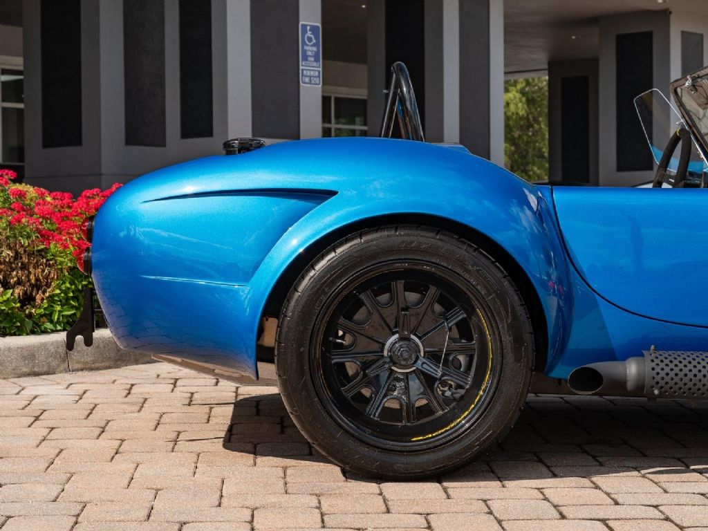 1965 Backdraft Racing Shelby Cobra Replica powered by a Ford Racing 427 V8 with Holly Terminator fuel injection, Nite Edition Engine, 2 color custom painted valve covers and air cleaners. 500hp, TKX 5 speed manual transmission. Hydro Blue exterior with Black Magic stripes, Yellow center stripe and pinstripes, custom painted valve covers, power steering, power brakes, Autometer Carbon GT style gauges, Raydot mirror for drivers side, ceramic headers, upgraded aluminum gas tank, glove box, Sabelt suede steering wheel, custom color shift knob, GT body option, LED headlights, clear front turn signal lenses, Oil cooler, black ceramic side pipes.