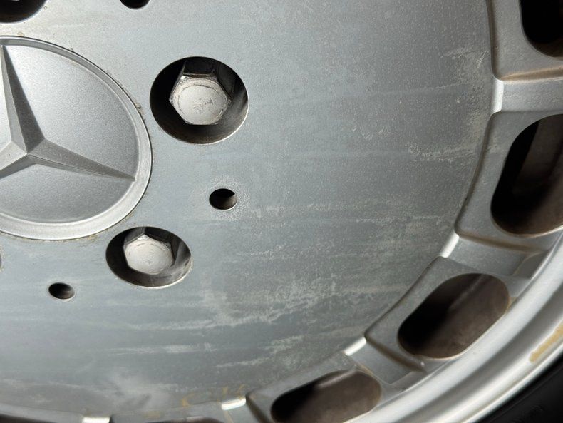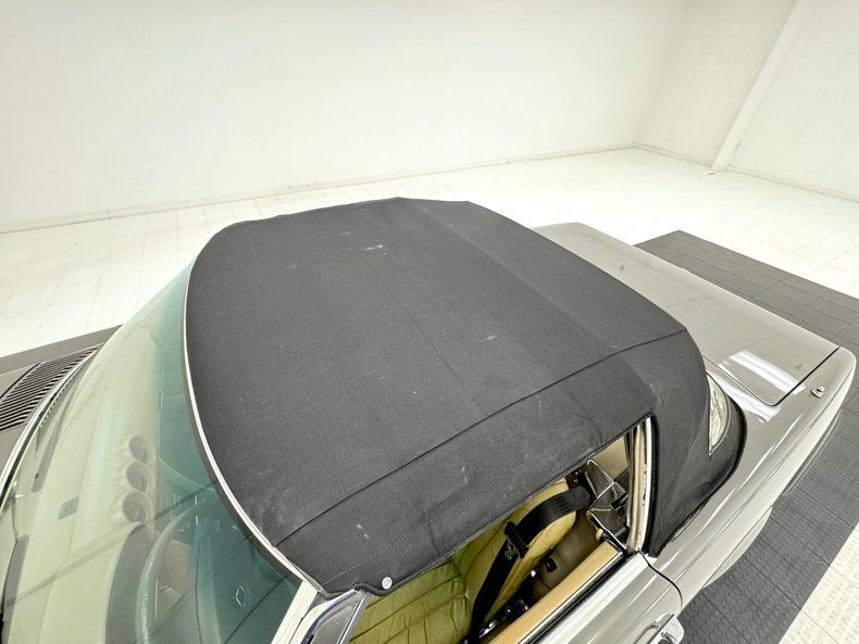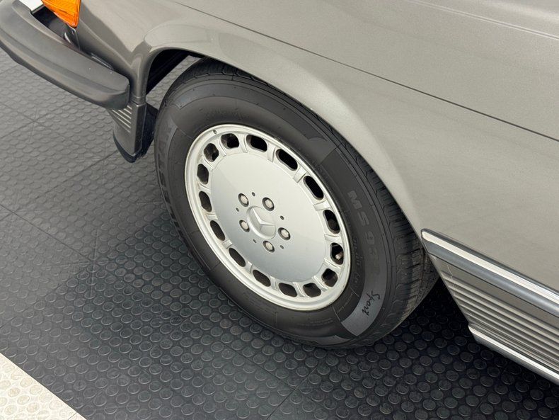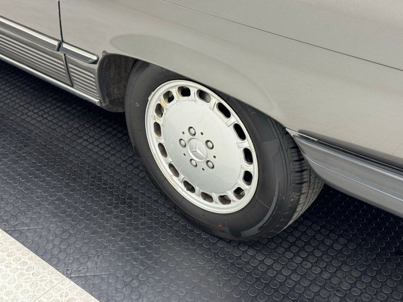 The well balanced body dimensions of the 450 look good in any color, and single stage Anthracite Gray is no exception. This car comes with a matching removable hardtop that provides all weather protection, and a nice black canvas top that provides spur of the moment, open air motoring. It can be tucked under a hard tonneau that is essentially seamless and maintains the flat plain profile between the straight shoulder lines. The offset wheel openings result in the rear wheel partially covered, but the 15-inch Mercedes Benz wheels are fully visible front and rear while the ribbed rocker panels under side molding is a trademark detail of the model, and the ribs continue to the front valance. Imperfections are limited to some bubbling on that rocker, and scuffs on a wheel.