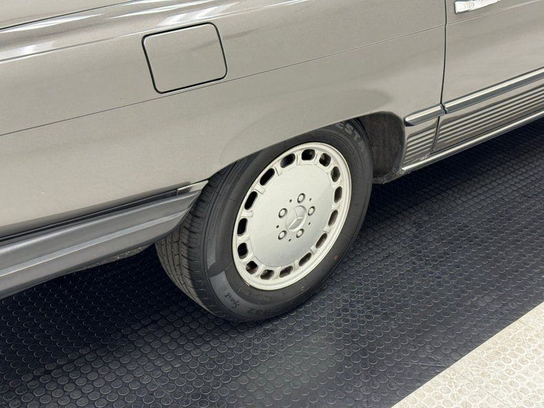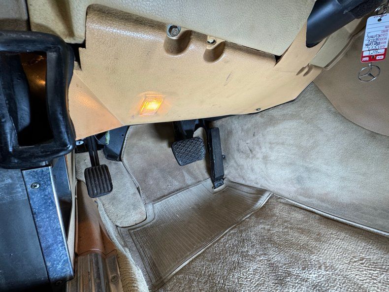Another trademark of the Benz is the use of their leather like material called MB tex, and it starts on the beige door panels with smooth and perforated surfaces, showing a touch of patina but fully intact. The bucket seats show heavy patina and cracking in the material and the carpeted package shelf behind them is slightly soiled but in otherwise good shape. Up front, a texturized and rubberized steering wheel rim frames the efficient gauge cluster and the center stack is framed in Zebrano wood with an AM/FM radio and A/C control panel. Some laminate cracking is seen on the up facing wood on the center console that houses the black shifter and plush tan carpet on the floor is in good shape, protected by mats. The trunk is smartly finished with tan carpeted panels and presents cleanly.