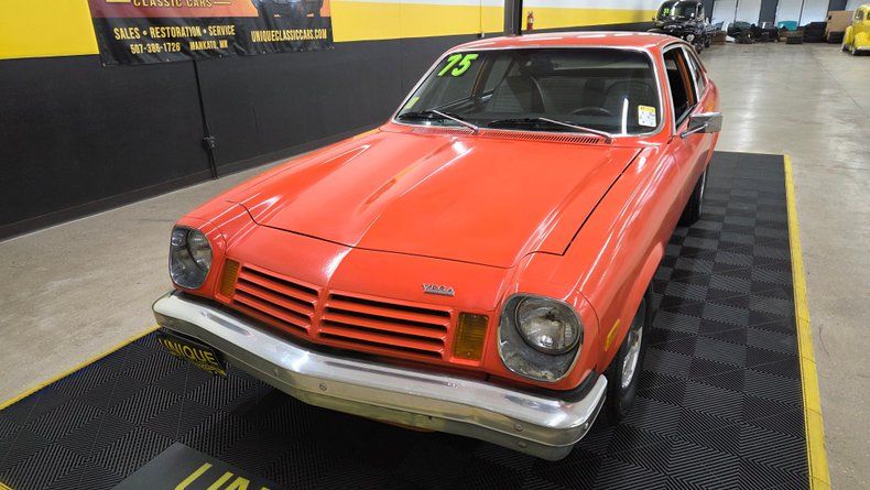 1975 Chevrolet Vega Original numbers-matching 2.3L inline four-cylinder engine paired with automatic transmission. Originally an orange metallic paint (code 80), with a repaint showing consistent orange peel texture. Recent mechanical updates include fuel tank, fuel sender, accelerator pump replacements, and refreshed brakes. Engine runs smoothly with nimble handling, smooth braking, and comfortable seating Black interior features a cloth and vinyl bucket seat combo in great shape