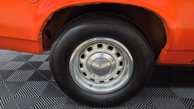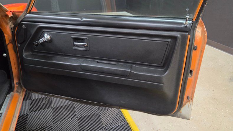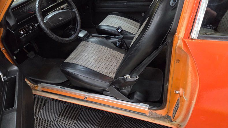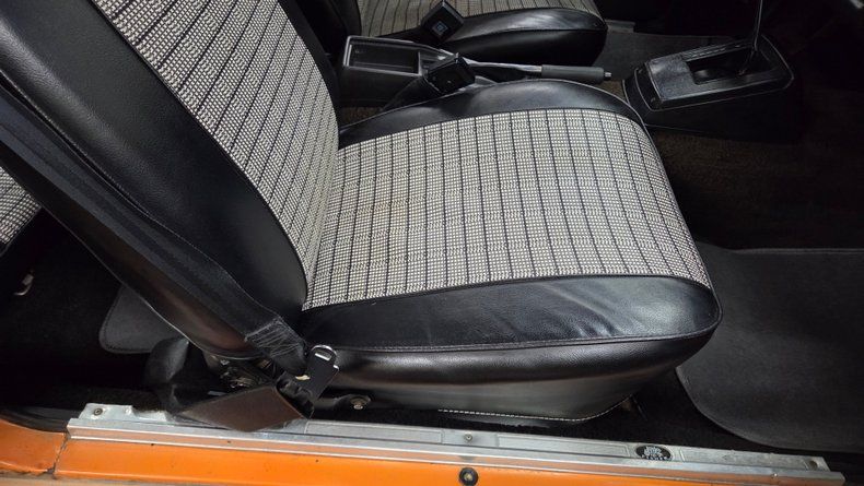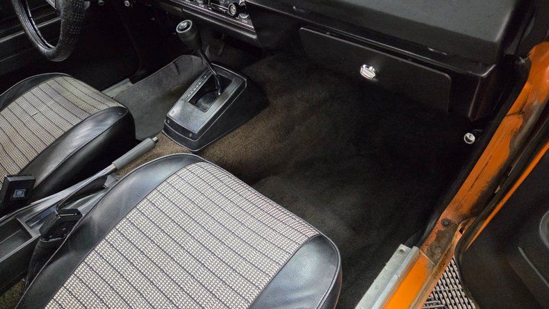 1975 Chevrolet Vega two-door hatchback, retaining its original numbers-matching 2.3L inline four-cylinder engine paired with an automatic transmission, equipped with a Holley two-barrel carburetor. The car's exterior paint is originally a metallic orange (paint code 80), it has been repainted with noticeable orange peel texture consistent throughout the body. Riding on steel wheels with center caps and beauty rings, with radial tires. Inside, a primarily black vinyl finish with cloth and vinyl combination seats in black and a textured gray similar to houndstooth. The interior features a functioning speedometer and fuel gauge, the stock stereo and heater are inop. The condition of door panels, seats and the headliner is good, indicating being well cared for. Recent maintenance includes replacement of the fuel tank, fuel sender, and accelerator pump. The brakes are described as "like new" front and rear, and the radiator is full despite a coolant light that intermittently flashes. The odometer reads 70,273 miles, though the originality of this mileage cannot be confirmed due to the car's age and title status. Taking it down the road showcases its light feel, nimble handling, smooth ride, and comfortable seating.