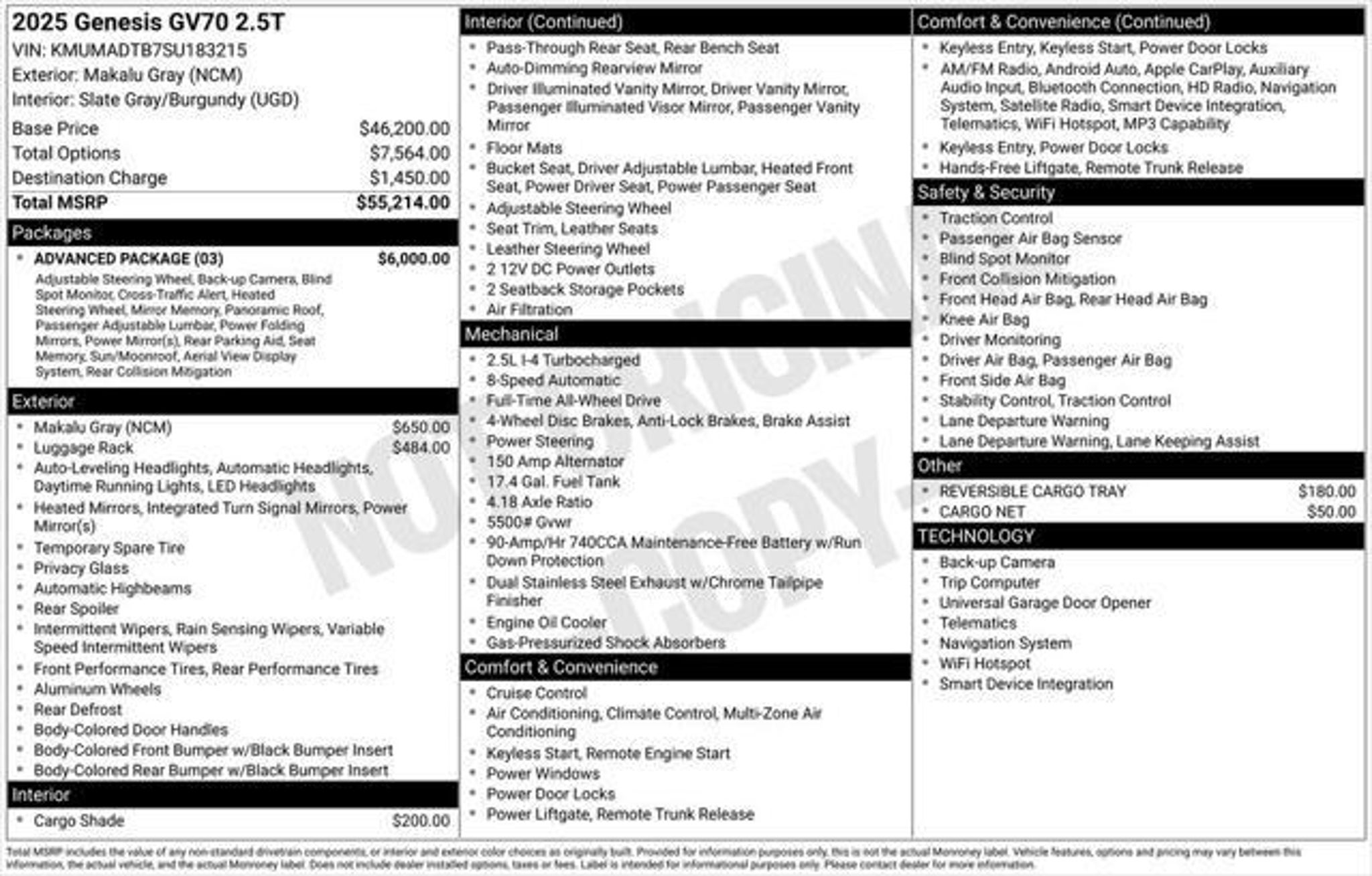 Discover the Exceptional 2025 Genesis GV70 2.5T Advanced: A Refined and Captivating SUV Elevate your driving experience with the remarkable 2025 Genesis GV70 2.5T Advanced. This stunning SUV combines cutting-edge technology, exceptional performance, and unparalleled luxury, making it the perfect choice for the discerning driver. "¢ ADVANCED PACKAGE: Includes power folding mirrors, power telescoping steering wheel, heated steering wheel, integrated memory system, panoramic sunroof, blind-spot monitoring, surround-view camera, and more. "¢ Roof Rack Cross Bars "¢ Cargo Cover "¢ Reversible Cargo Tray "¢ Cargo Net Powered by a 2.5L DOHC engine and equipped with an 8-speed automatic transmission with SHIFTRONIC, the GV70 2.5T Advanced delivers a thrilling and responsive driving experience. With its advanced all-wheel-drive system, you'll conquer any road with confidence, while the impressive fuel efficiency of 22 city/28 highway MPG ensures you can go further between fill-ups. Step inside the GV70 2.5T Advanced and be captivated by the premium Leatherette seating surfaces, heated front seats, and power-adjustable driver's seat with memory function. The 14.5-inch navigation system with AM/FM and HD Radio keeps you connected and entertained, while the 9-speaker audio system provides a remarkable listening experience. Safety is paramount in the GV70 2.5T Advanced, with features like forward collision-avoidance assist, lane-keeping assist, and a surround-view camera system to help you navigate with confidence. The advanced Genesis Connected Services system also provides added peace of mind, with features like automatic collision notification and emergency assistance. Elevate your driving experience with the 2025 Genesis GV70 2.5T Advanced. This exceptional SUV offers a winning combination of style, performance, and technology that is sure to impress. Visit our showroom today and let us demonstrate how this remarkable vehicle can enhance your life on the road.