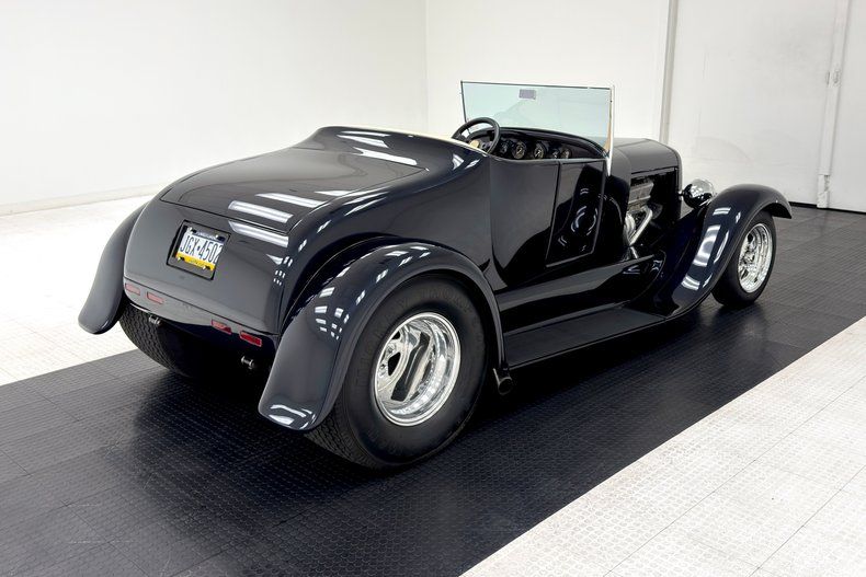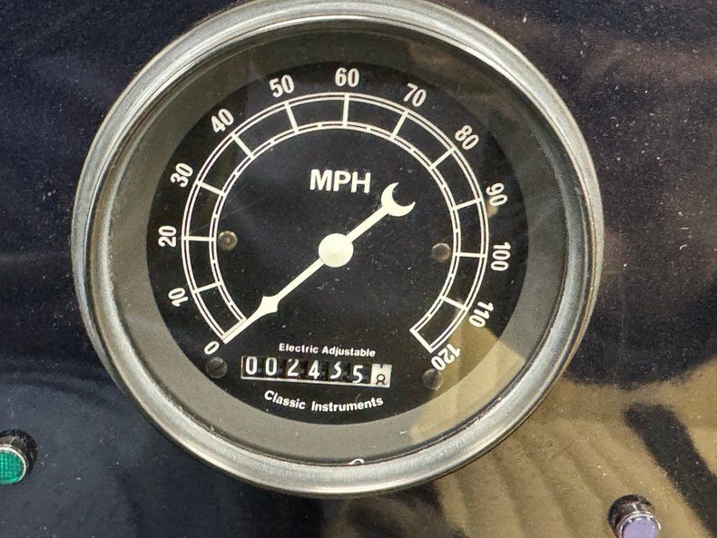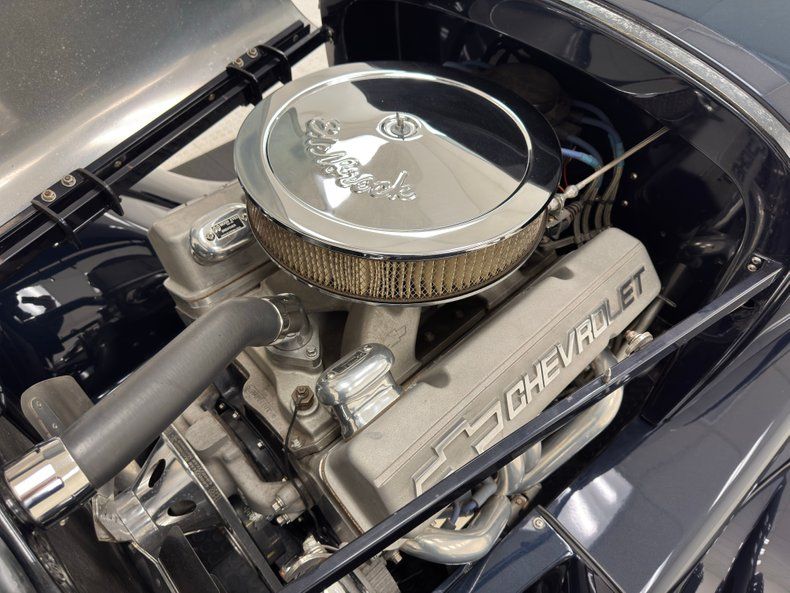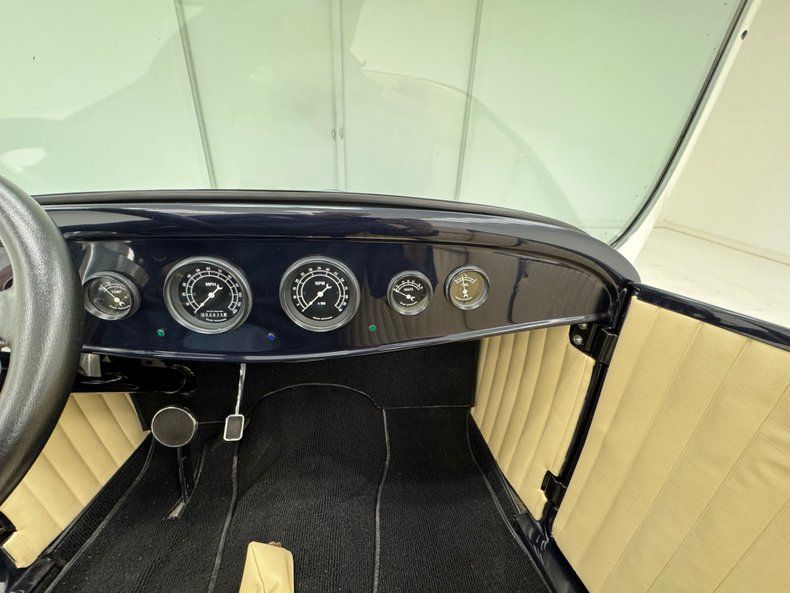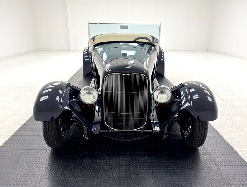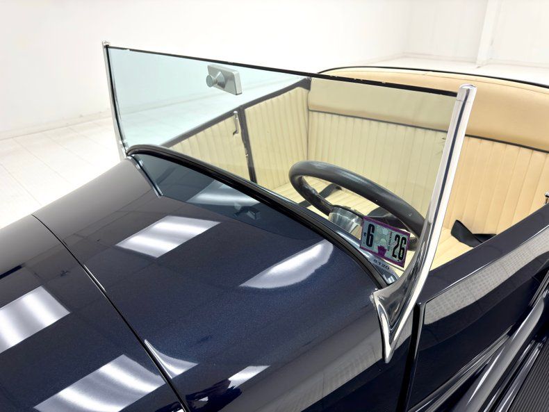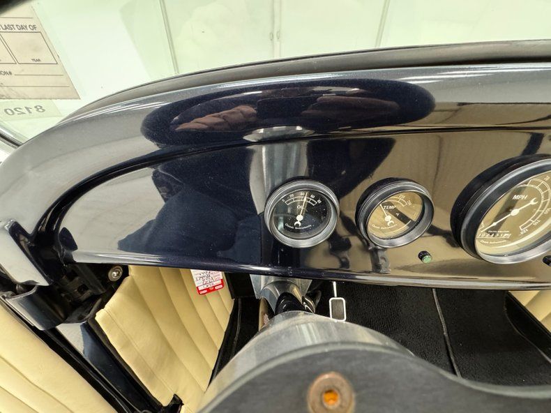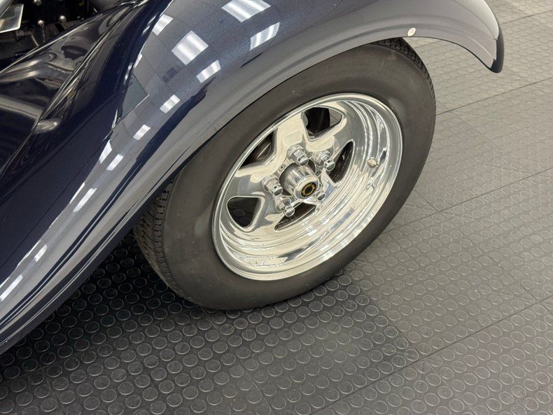Two stage Midnight Blue coats this roadster and we're talking deep paint here and in certain light, it can look black while other light brings out the navy blue and it's nicely applied. Once you've absorbed the beauty of the paint, the wheel set up is next to compete for your attention, stacking 15-inch Weld wheels with vastly different widths and tires sizes, creating that classic hot rod stance that's been a proven winner for about 80 years, here under fiberglass fenders connected by a steel running board. In back, the rectangular quartet of tail lights get your attention right before the massive meats grab your eyes as they peek from narrow fenders. Up front, the fiberglass '32 radiator shell looks perfectly at home next to the aluminum hood which connects seamlessly to the fiberglass body. A modest windscreen with nicely sculpted posts completes the exterior which shows no glaring imperfections.