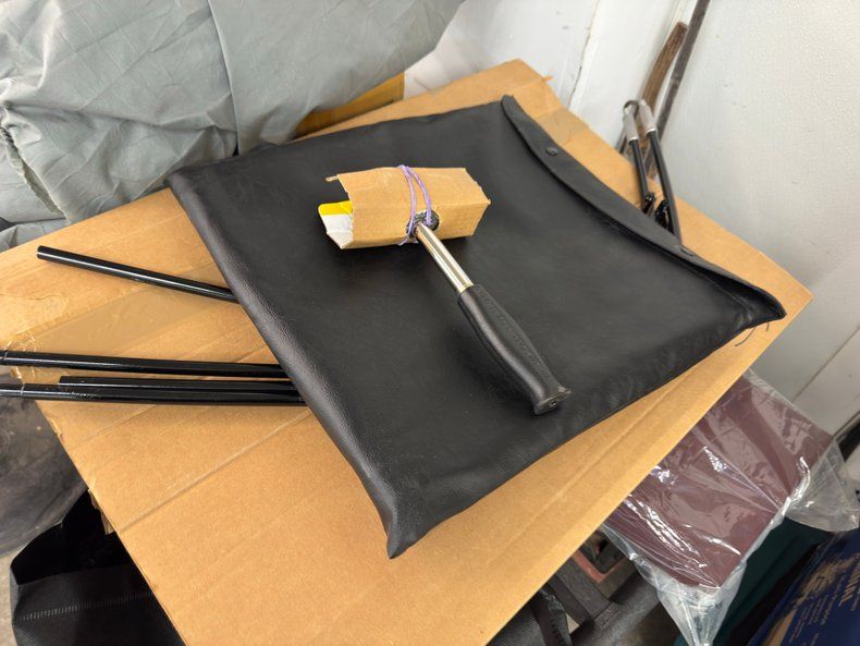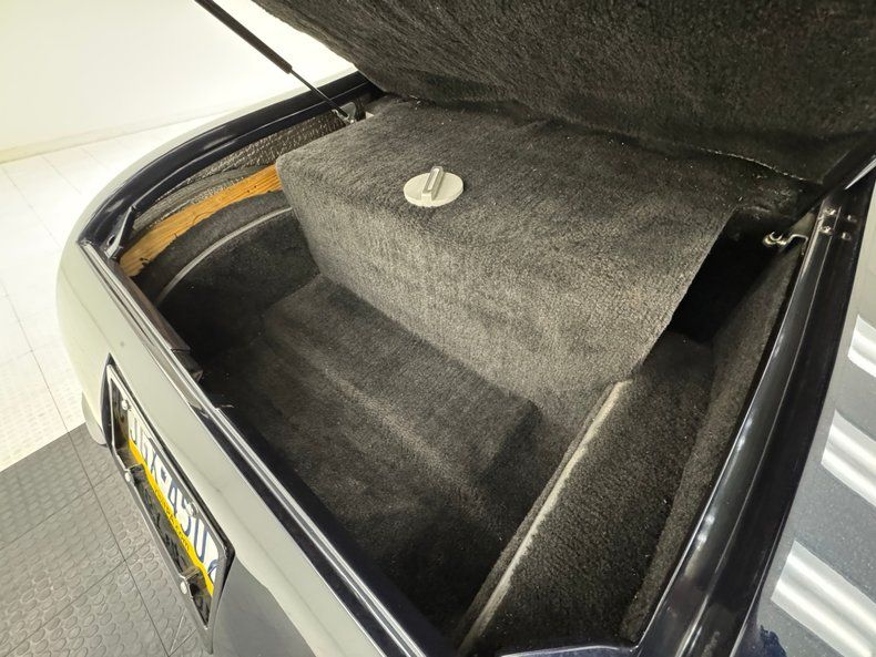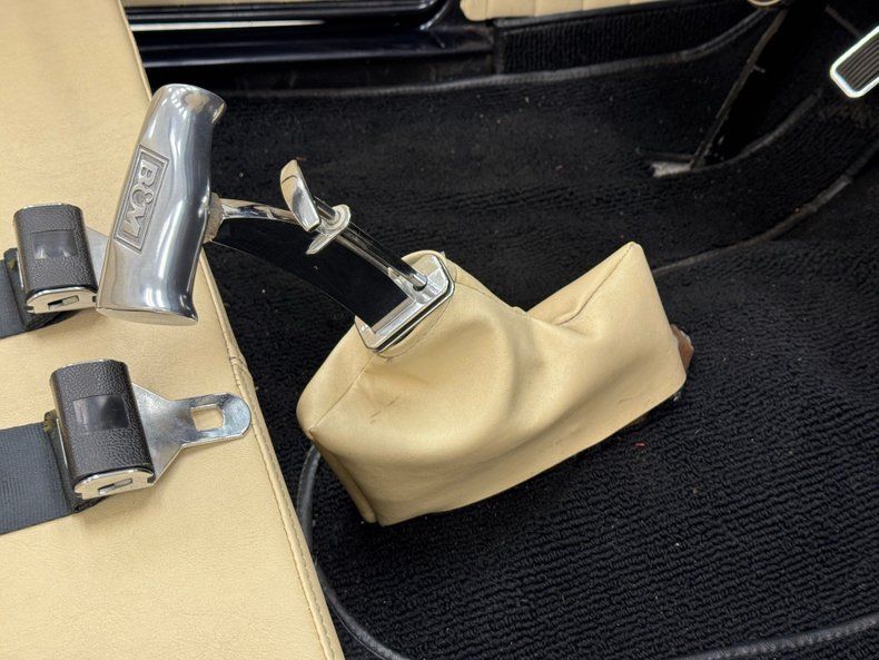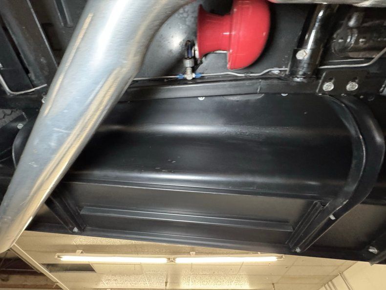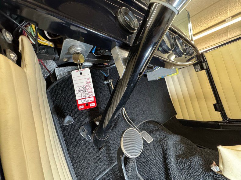 Stitched Ivory vinyl is the palette of choice here, providing a nice contrast to the exterior and the bench is augmented with blue piping that delineates the pattern change to smooth. The three spoke steering wheel leads to the body matched dashboard, clean and straight and adorned with a row of Classic Instruments gauges. On the floor, an ivory vinyl boot wraps the B&M shifter over black loop carpet, all in nice shape, and the finished trunk includes a carpet covered gas tank.