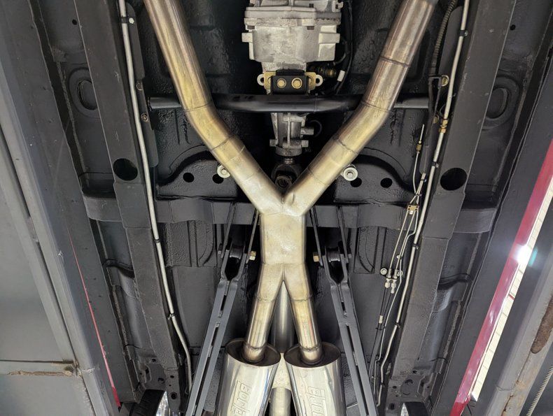 UNDERSIDE: Wayne Due chassis built and installed at Wayne Due's shop. Upfront is a custom subframe with Corvette independent suspension, aluminum control arms, QA1 coilover adjustable gas shocks, a fat swaybar, rack & pinion steering. Custom made frame rails are welded in to connect the front and back. In the back it uses unique NASCAR style rear control arms, a Panhard bar and QA1 coilover adjustable gas shocks. It has a Baer brake system with drilled and slotted discs at all 4 wheels, it has a custom e-brake too. Great sounding, hand crafted stainless exhaust with X-pipe and Borla mufflers. Looking up at the motor it has an extra capacity anodized Miloden oil pan. A heavy duty scatter shield attaches to the Tremec 5-speed manual trans. A custom aluminum driveshaft connects to the Currie 9 inch rear with an aluminum center section and 3.73 posi gears.