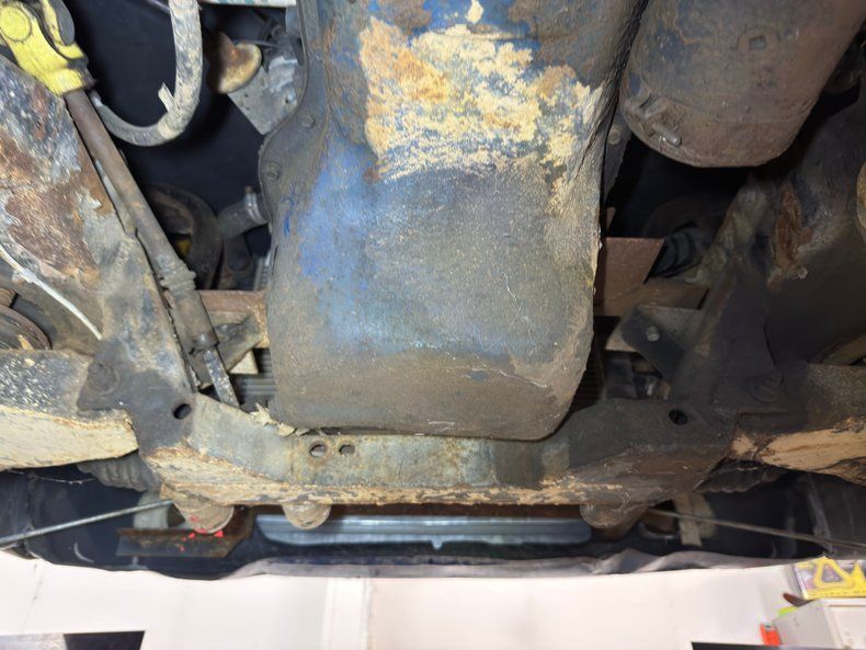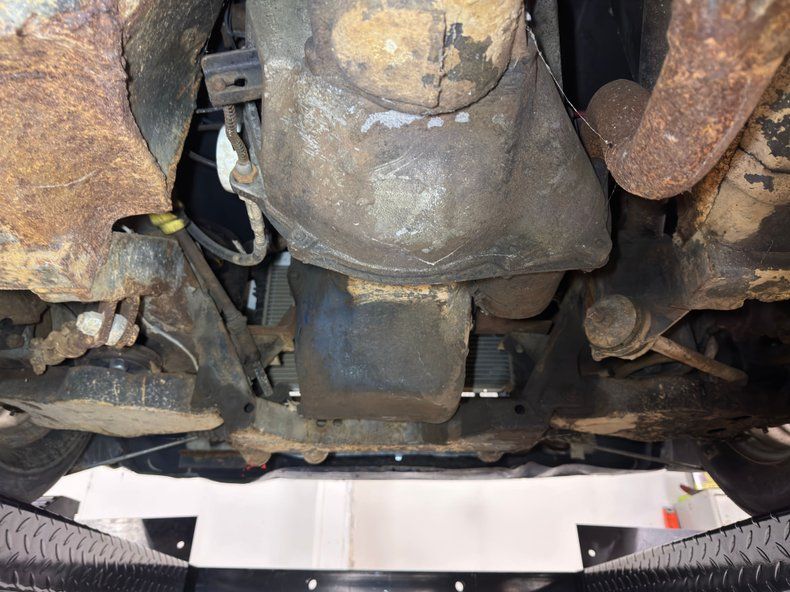 Lots of surface rust, corrosion and mud on the bottom but everything seems to be intact. Disc brakes are on front and drums in back while the single exhaust is not impeded by a muffler and exits to the side. Suspension consists of coil springs in front and leaf springs in the back.
