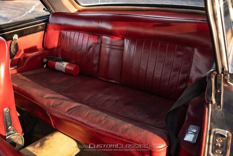 The cabin features red leather upholstery that creates a warm, inviting environment. The original leather has held up remarkably well for its age, with the driver's seat showing stretching and wear from use but remaining free of significant rips or tears. Carpeting throughout displays staining consistent with age and use. Interior door chrome shows surface rust in places. The factory AM/FM radio remains fitted in the dashboard. Like the exterior, the interior presents honestly and offers opportunities for restoration or refurbishment.