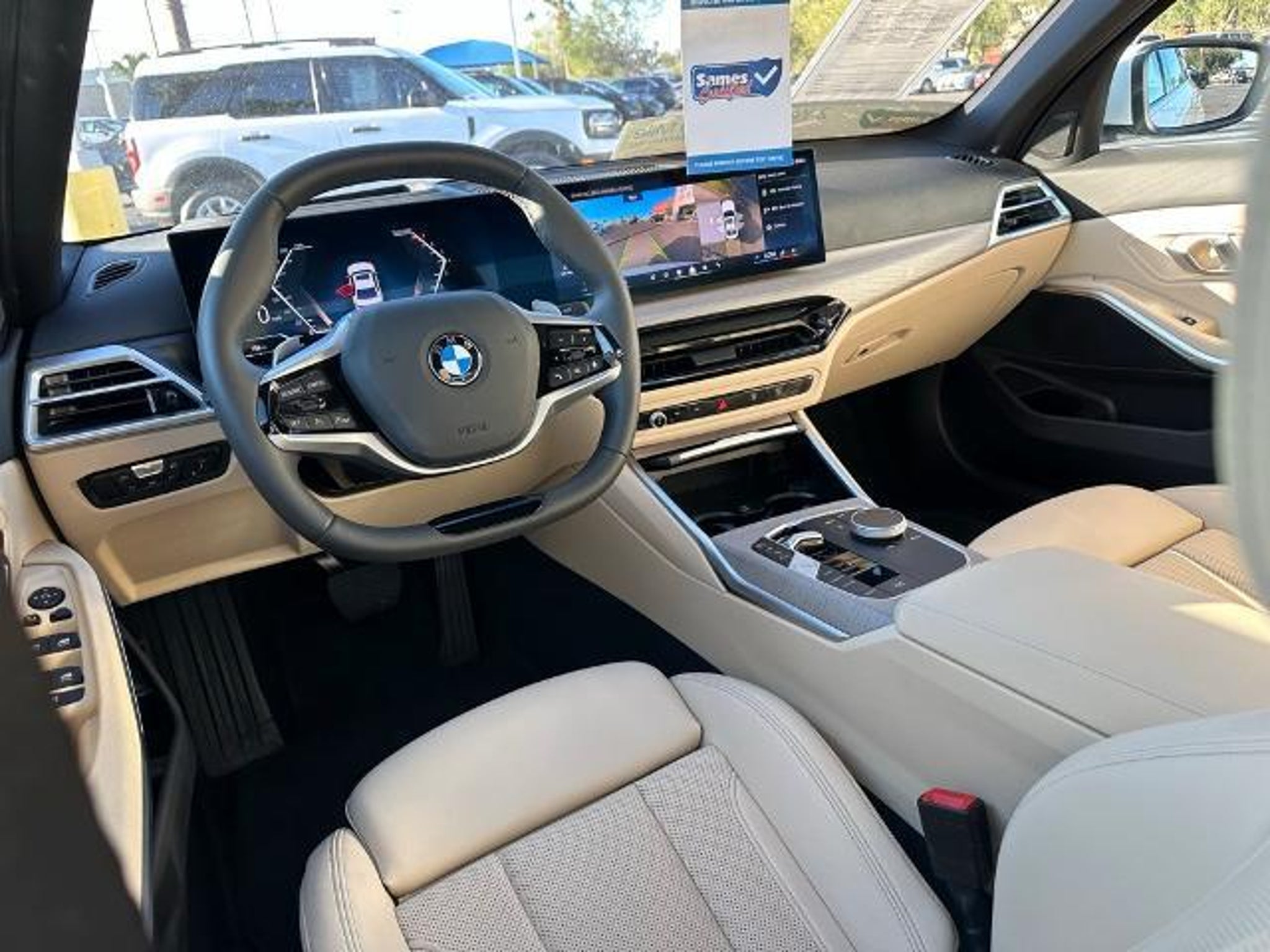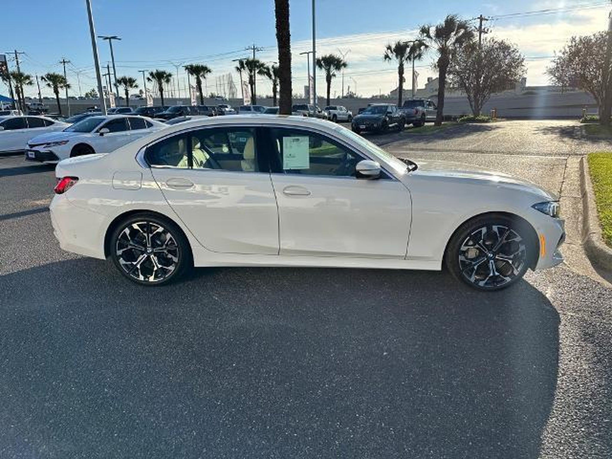 This 2025 BMW 3 Series 330i in Alpine White comes with the following features: 2.0L 4-Cylinder DOHC 16V Turbocharged 8-Speed Automatic Sport RWD Connected Package Pro, Parking Assistance Package (Active Park Distance Control, Parking Assistant Plus, Rear-View Camera, and Surround View with 3D View), Premium Package (Active Blind Spot Detection, Active Driving Assistant, BMW Curved Display with HUD, Comfort Access Keyless Entry, Frontal Collision Warning, Heated Steering Wheel, Lane Departure Warning System, Park Distance Control, Power Tailgate, and Remote Engine Start), 10 Speakers, 4-Wheel Disc Brakes, ABS brakes, Air Conditioning, Alloy wheels, AM/FM radio: SiriusXM, Apple CarPlay and Android Auto Compatibility, Auto High-beam Headlights, Auto-dimming door mirrors, Auto-dimming Rear-View mirror, Automatic temperature control, BMW Assist ECall, BMW TeleServices, Brake assist, Bumpers: body-color, Compass, ConnectedDrive Services, Delay-off headlights, Driver door bin, Driver vanity mirror, Dual front impact airbags, Dual front side impact airbags, Electronic Stability Control, Emergency communication system: BMW Assist eCall, Exterior Parking Camera Rear, Four wheel independent suspension, Front anti-roll bar, Front Bucket Seats, Front Center Armrest, Front dual zone A/C, Front reading lights, Fully automatic headlights, Garage door transmitter, Genuine wood console insert, Genuine wood dashboard insert, Heated door mirrors, Heated Front Seats, Heated front seats, Hi-Fi Sound System, Illuminated entry, Knee airbag, Leather steering wheel, Low tire pressure warning, Lumbar Support, Memory seat, Navigation, Navigation System, Occupant sensing airbag, Outside temperature display, Overhead airbag, Panic alarm, Passenger door bin, Passenger vanity mirror, Perforated Sensatec Upholstery, Personal ESIM 5G, Power door mirrors, Power driver seat, Power Front Seats, Power moonroof, Power passenger seat, Power steering, Power windows, Radio data system, Radio: AM/FM Audio System, Rain sensing wipers, Rear air conditioning, Rear anti-roll bar, Rear reading lights, Rear seat center armrest, Rear window defroster, Remote keyless entry, Security system, SiriusXM Satellite Radio with 1 Year Subscription, Speed control, Speed-sensing steering, Speed-Sensitive Wipers, Split folding rear seat, Sport Seats, Sport steering wheel, Steering wheel mounted audio controls, Tachometer, Telescoping steering wheel, Tilt steering wheel, Traction control, Trip computer, Turn signal indicator mirrors, Variably intermittent wipers, Whe
