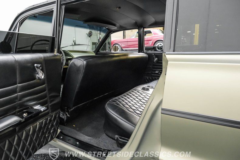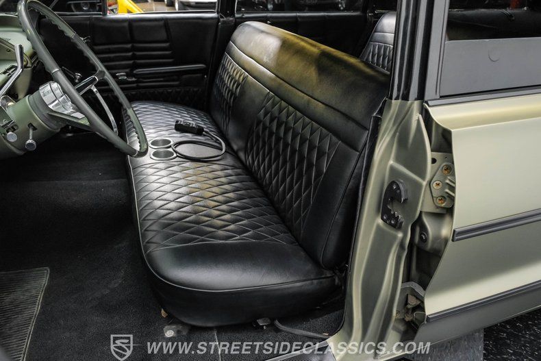 Step inside to discover a fully customized interior that balances comfort and style. The black vinyl bench seats are adorned with elegant diamond stitching and built-in cup holders for convenience. Matching door panels complement the factory dash, which is painted olive green and features Dakota digital gauges. Modern touches include a Kenwood AM/FM/Aux/Bluetooth radio paired with Fosgate speakers, while Vintage Air A/C ensures a comfortable ride. The classic factory steering wheel on a tilt column and black carpets with a black headliner complete the cohesive and inviting cabin atmosphere.