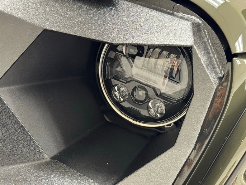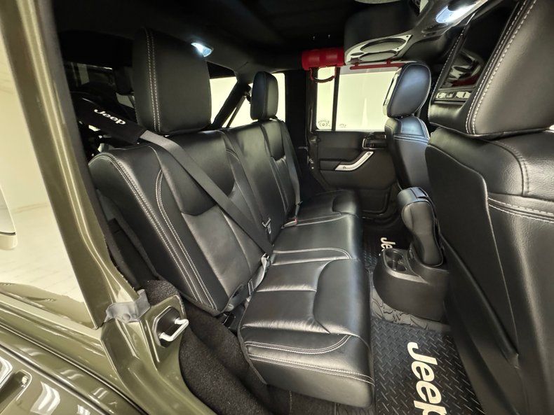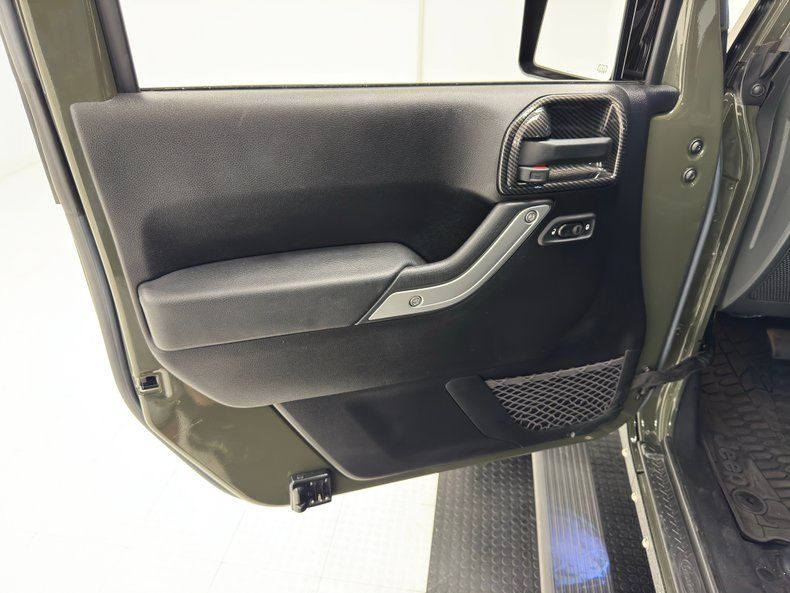 Looking very much like a 4x4 super hero, this Sahara has taken on a muscular appearance with the no holds barred addition of exterior features that expand its Tank Clearcoat dark green coverage. It starts with the bold Fab Fours front grille and bumper behind which is tucked a Warn winch. Up front, there are enough added LED's to light up the Red Rocks theater and red anodized tow hooks. Big 'ol fender flares keep dirt from flying far off of the 20-inch MotoMetal wheels with large Nitto Mud Grappler tires while XRC body armor protects the body between the wheels. Along with patriotic messaging, a tubular bin holds a spare in back while a Fabs Four lighted roof rack is adorned with a light bar in addition to its four embedded lights and the armored windshield frame houses yet another light bar. If you fear the dark or live in the wild, this Jeep will be a resounding solution. Under our lights, we could find no exterior imperfections.